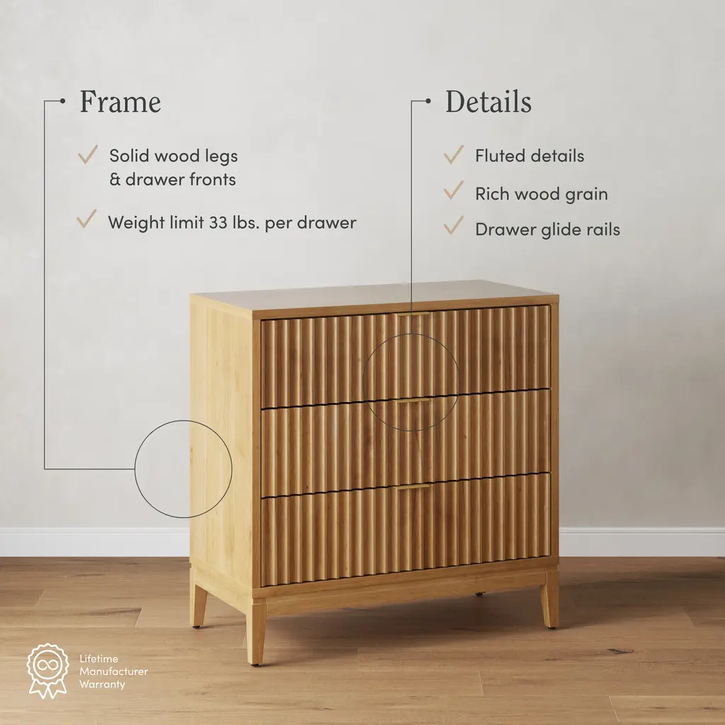 Meet Jasper – a stylish dresser set with a touch of elegance! Featuring fluted details, solid wood legs, and spacious drawers, this set of 2 dressers combines beauty and function. The sturdy glide rails make it easy to store your essentials, with a 33 lbs weight limit per drawer.