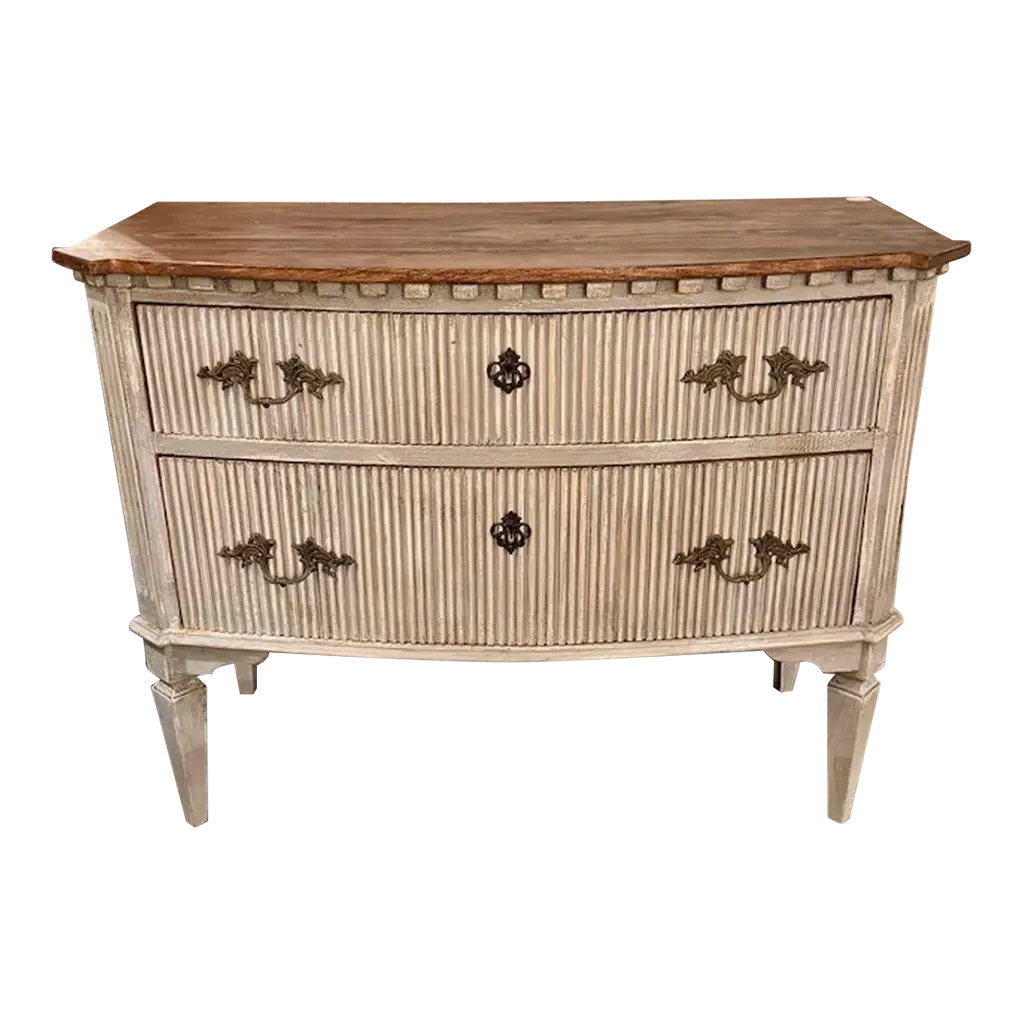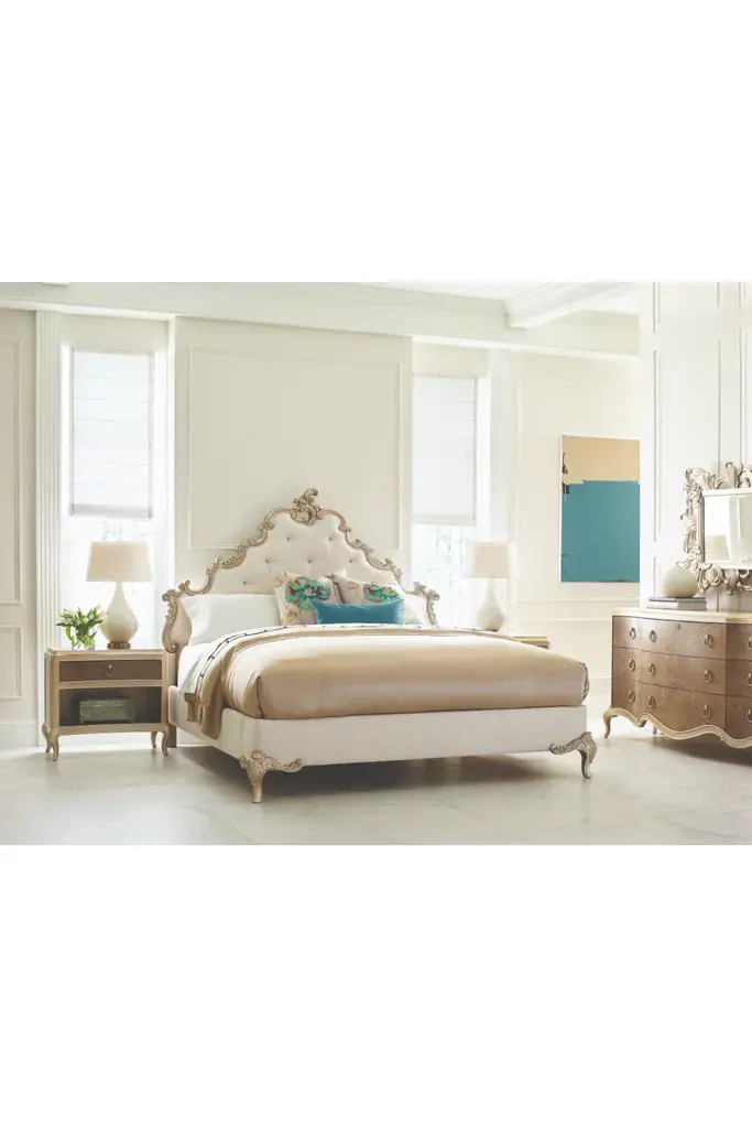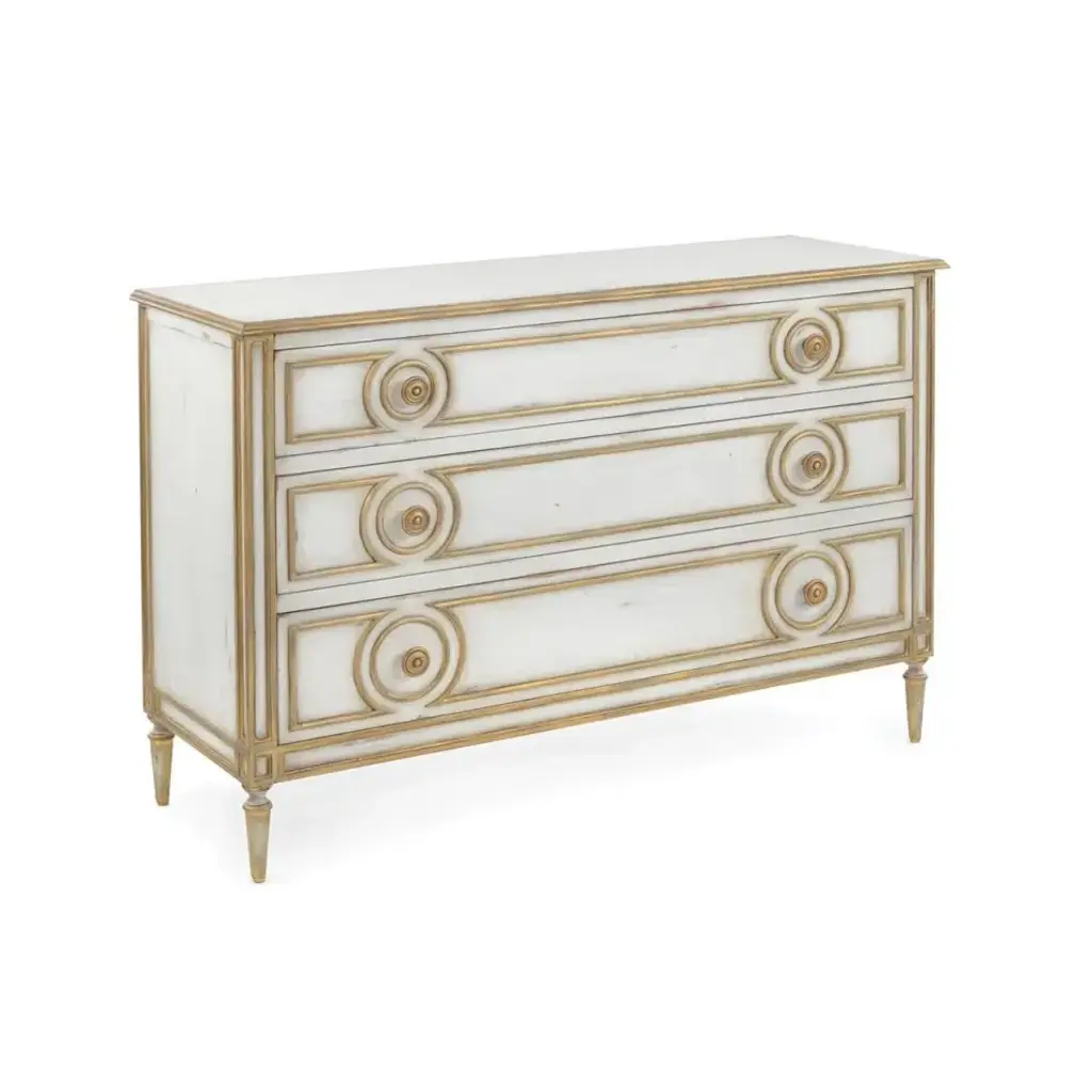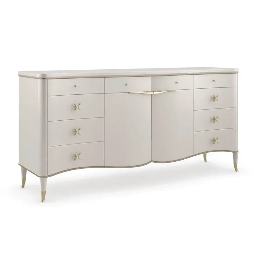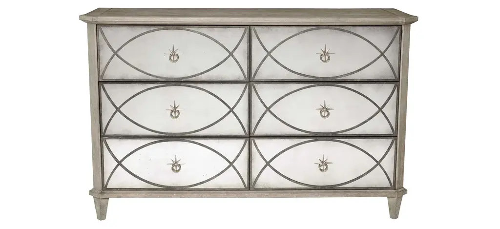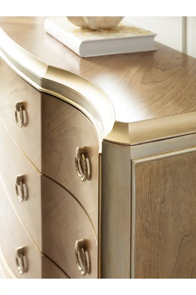 Perfect from every angle, this elegant triple dresser adds a touch of chic sophistication to any bedroom. A shapely serpentine silhouette enhances the visual appeal of its classic nine-drawer design and is highlighted with exquisite veneers in a Cendre finish trimmed in Champagne Mist. Inspired by the ornate beauty of the Rococo period, this stunning storage piece features one-of-a-kind carvings and shapely cabriole legs that give a nod to the past while delivering a refreshing contemporary interpretation. Custom-designed ring pulls with vintage cameo buttons add a finishing touch to this dresser in just the same way jewelry completes an outfit.Download Assembly Sheet