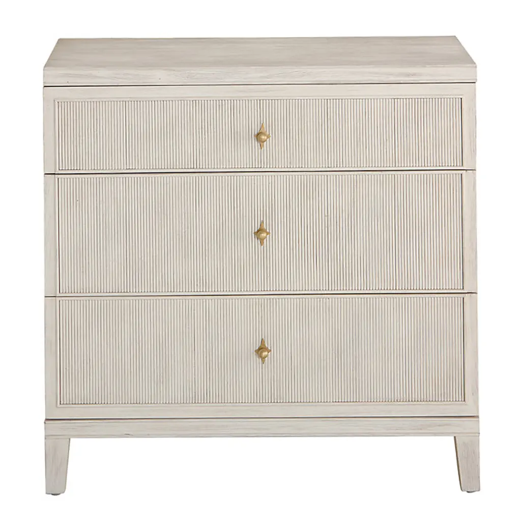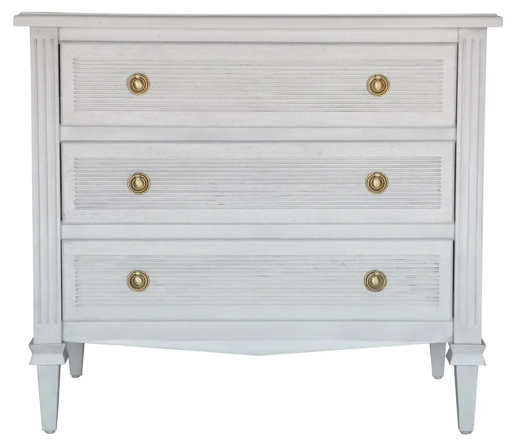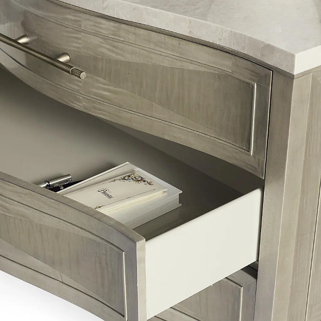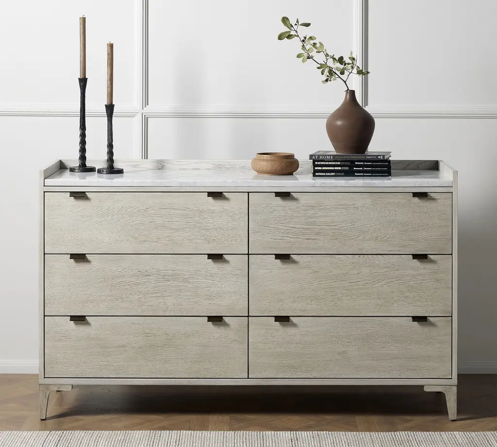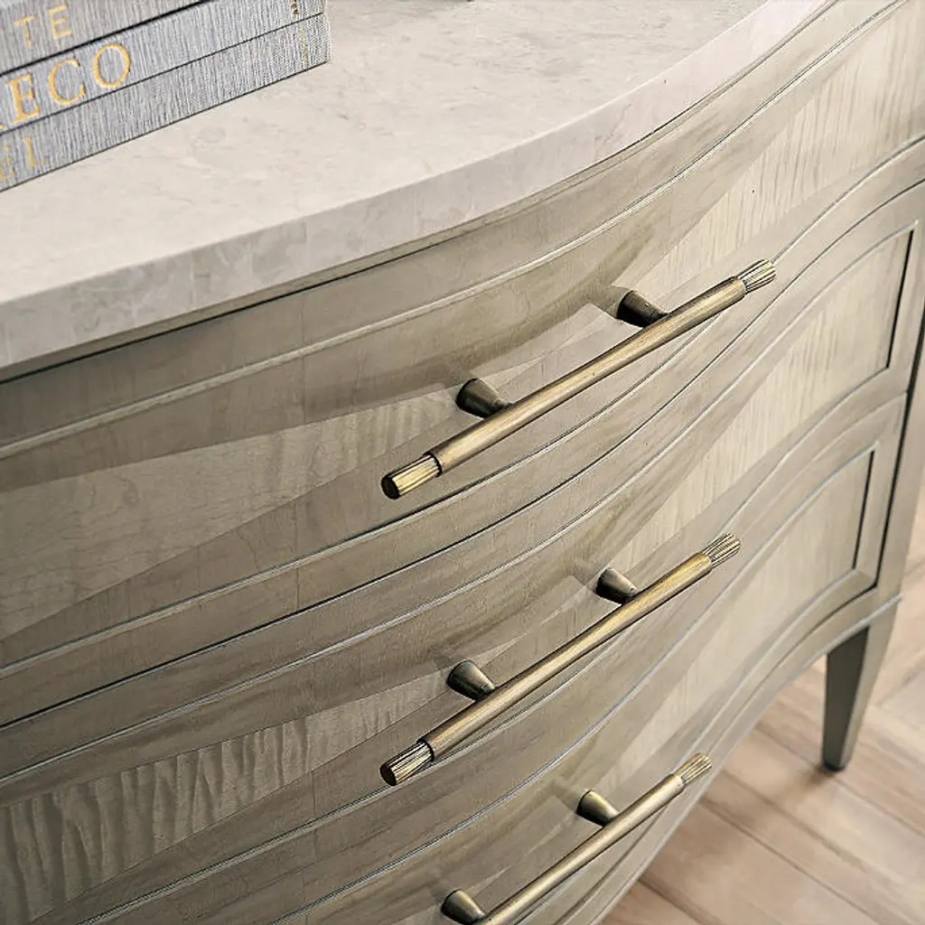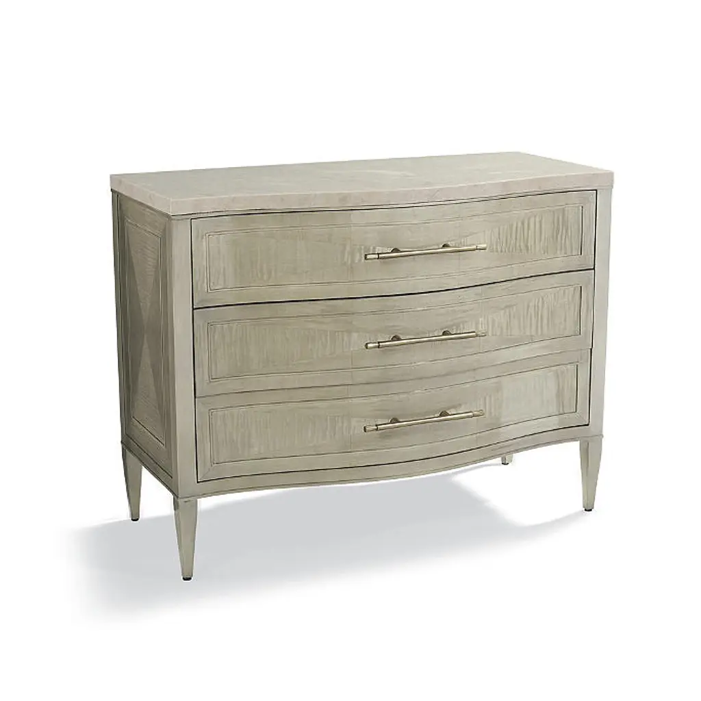 A fresh take on a classic chest of drawers, our Milano Three-Drawer Chest combines a serpentine front and Crema Marfil marble top with drawer fronts that are accented with molding, transitional brass pulls and a diamond pattern created by two tones of curly maple veneer. Solid and engineered hardwood with curly maple veneer Glossy Gray Chantilly finish Finish is accented with beige undertones Crema Marfil marble top Due to natural variations in marble, each piece is inherently unique Brass hardware Slow-close, full-extension drawers Tapered legs Integrated power strip with Type A and Type C USB ports 10' cord Adjustable feet for leveling For indoor use Coordinates with our Milano Sideboard Included anti-tip kit is required for installation; kit consists of safety-tested mounting hardware, a nylon strap and instructions To prevent injuries from furniture tipping over, this item must be permanently affixed to the wall; professional installation is recommended To prevent injuries or damage to item, recommended team lift (two or more people) for furniture placement Arrives assembled A Frontgate exclusive. At Frontgate, our primary focus is quality. We guarantee that every product we sell will stand up to the supreme test – our customers' satisfaction. To learn more about our policies, visit our Shipping & Processing, Returns & Exchanges and Warranty & Price Guarantee pages. A fresh take on a classic chest of drawers, our Milano Three-Drawer Chest combines a serpentine front and Crema Marfil marble top with drawer fronts that are accented with molding, transitional brass pulls and a diamond pattern created by two tones of curly maple veneer. Solid and engineered hardwood with curly maple veneer Glossy Gray Chantilly finish Finish is accented with beige undertones Crema Marfil marble top Due to natural variations in marble, each piece is inherently unique Brass hardware Slow-close, full-extension drawers Tapered legs Integrated power strip with Type A and Type C USB ports 10' cord Adjustable feet for leveling For indoor use Coordinates with our Milano Sideboard Included anti-tip kit is required for installation; kit consists of safety-tested mounting hardware, a nylon strap and instructions To prevent injuries from furniture tipping over, this item must be permanently affixed to the wall; professional installation is recommended To prevent injuries or damage to item, recommended team lift (two or more people) for furniture placement Arrives assembled A Frontgate exclusive. At Frontgate, our primary focus is quality. We guarantee that every product we sell will stand up to the supreme test – our customers' satisfaction. To learn more about our policies, visit our Shipping & Processing, Returns & Exchanges and Warranty & Price Guarantee pages.