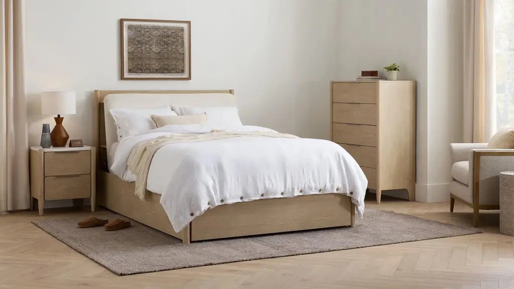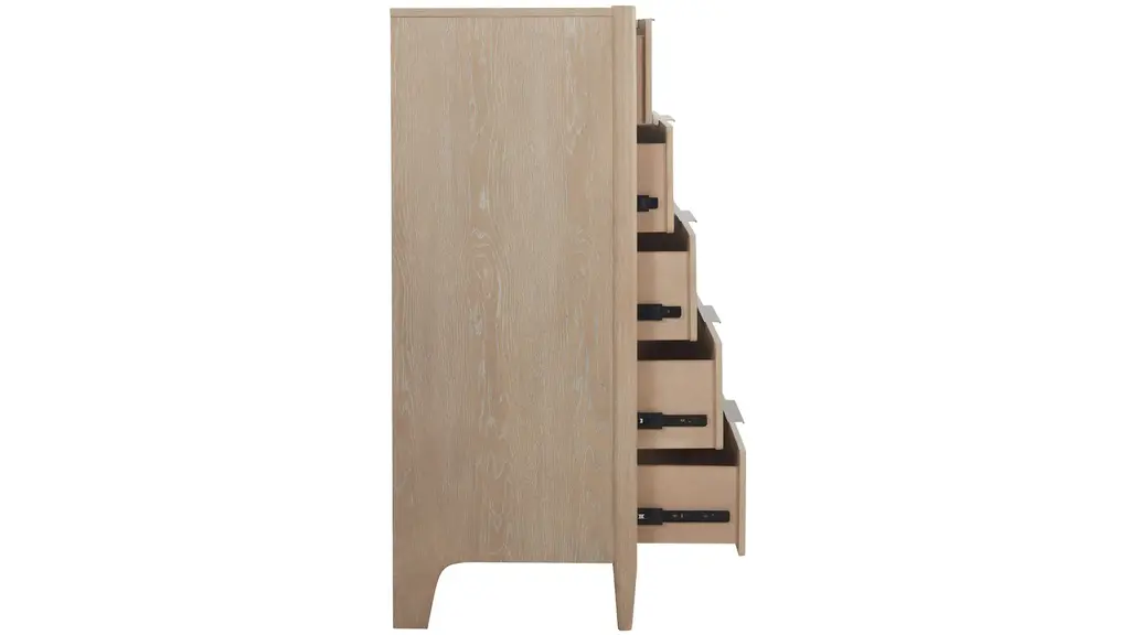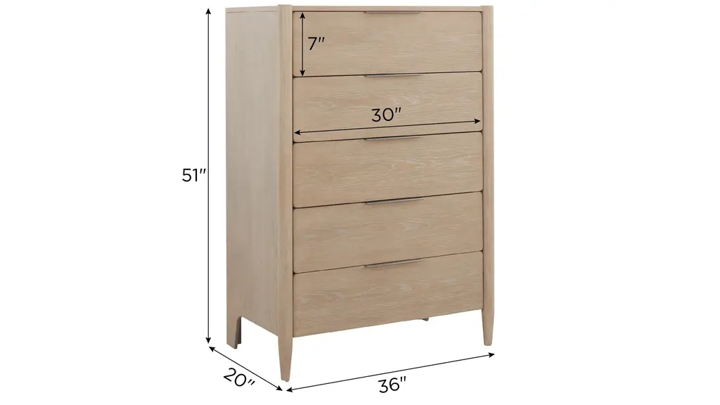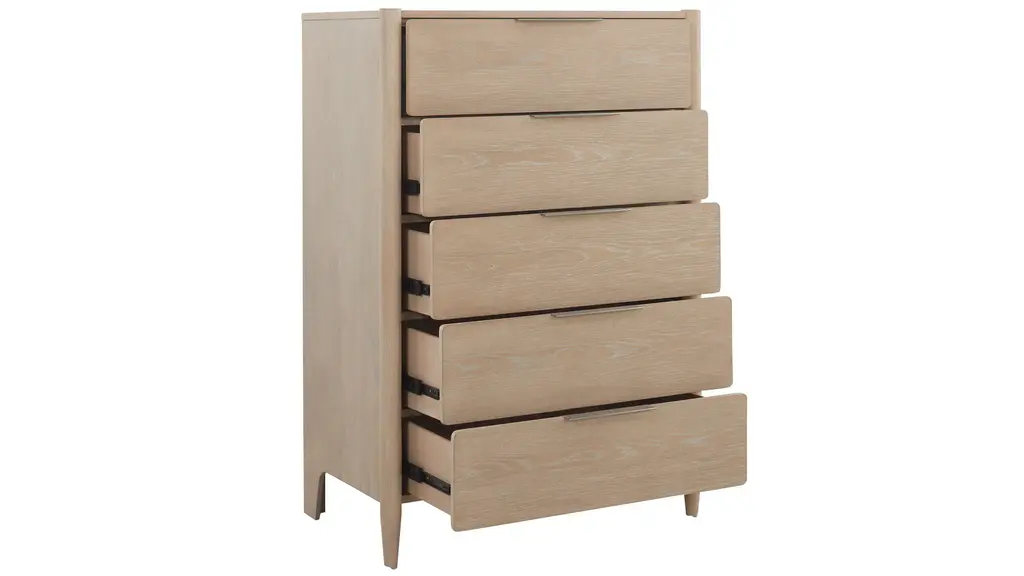 If an organized and sophisticated sleep oasis is on your wish list, the Mirra chest is here to check it off! This minimalist design features 5 roomy drawers for extra storage of clothing, bedding, and accessories. Rounded dowel posts strike an easy balance with sleek nickel drawer pulls and the warmth of the wood.