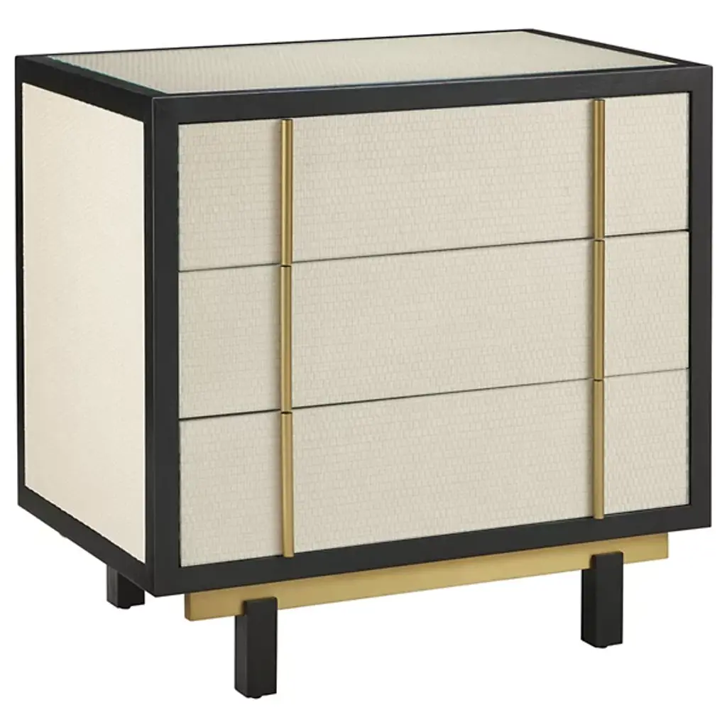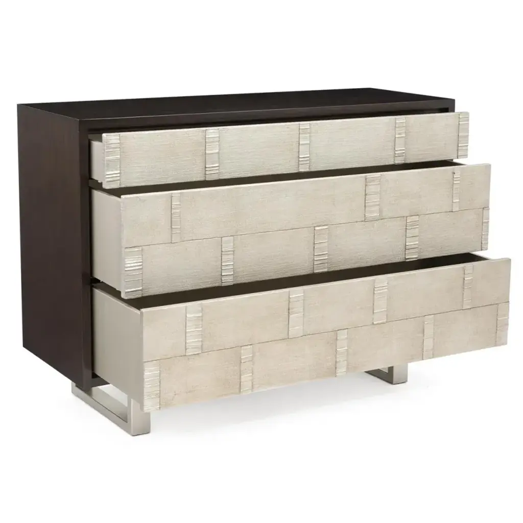 This three-drawer chest has a case in an espresso finish and sits on a steel frame. The drawer fronts are pewter linen with textured insets of pewter silver leaf.