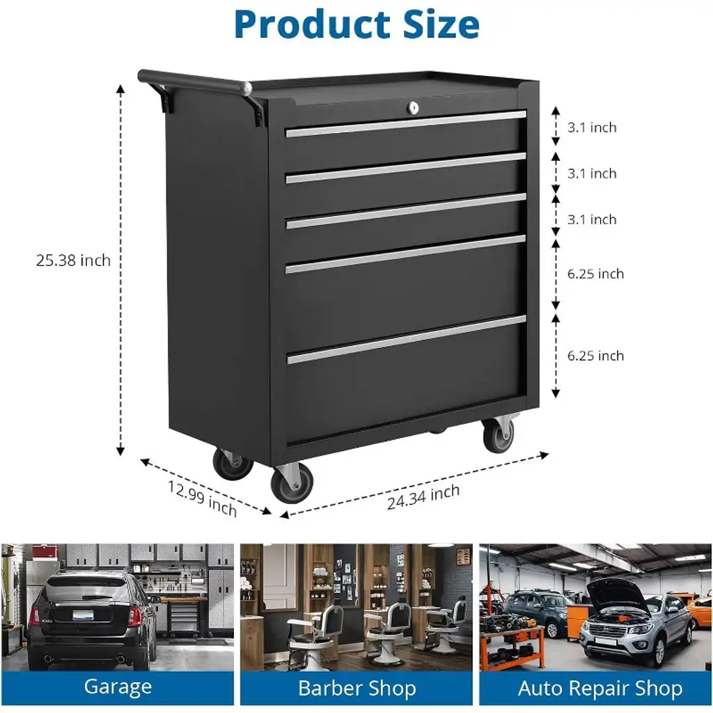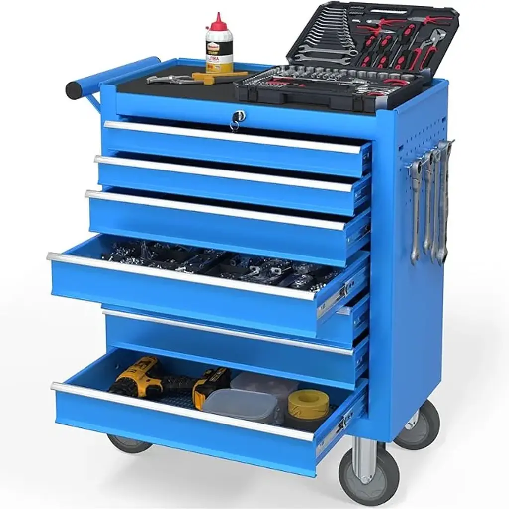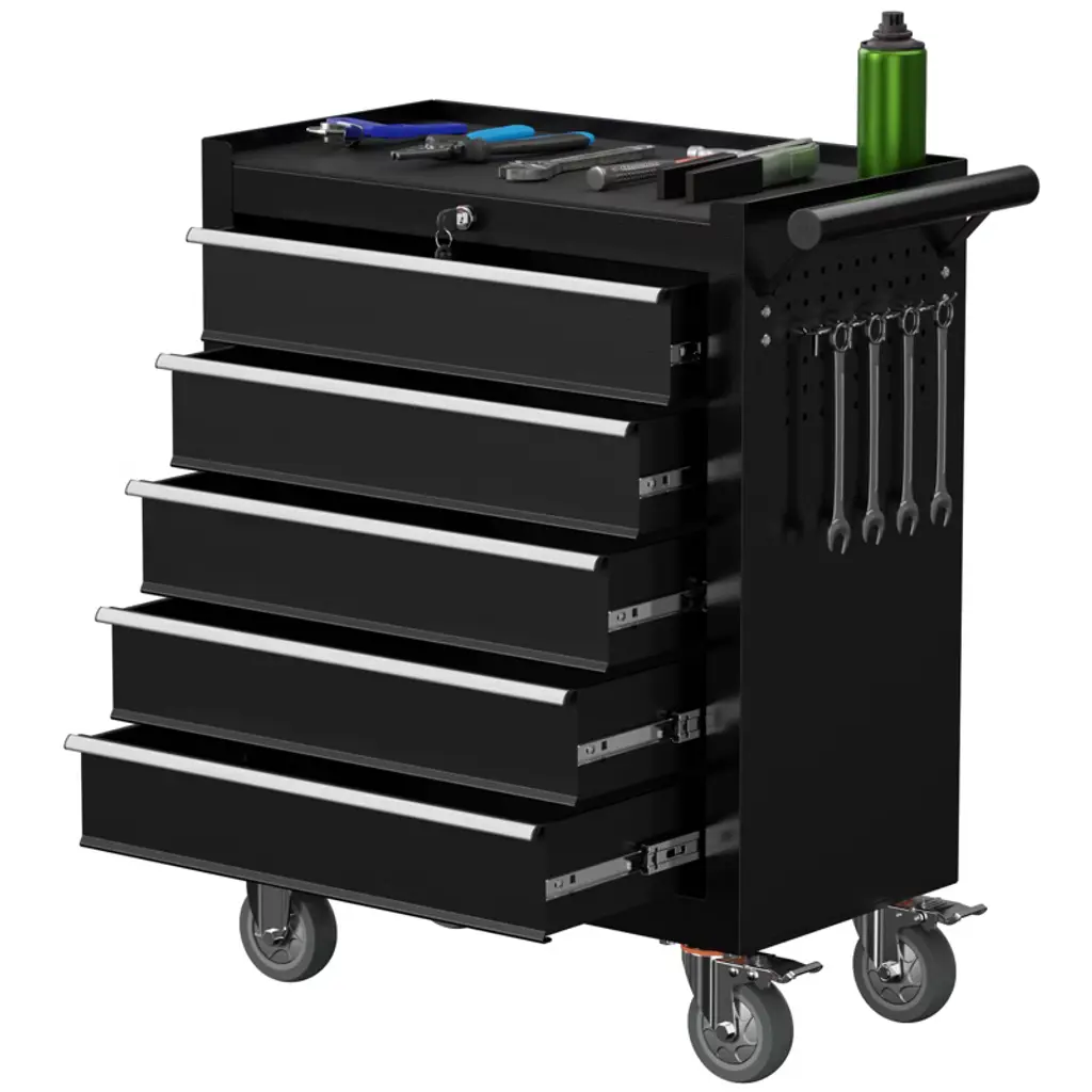 Upgrade your garage or workshop with a rolling tool chest that brings organization, durability, and security to your workspace. With five spacious drawers, you’ll have plenty of room to neatly store and arrange all your essential tools, keeping everything within easy reach. The sturdy steel construction stands up to heavy daily use, holding even your bulkier equipment with dependable stability, so you can count on your storage for years to come. Effortlessly retrieve tools thanks to ball-bearing drawer slides that open and close smoothly, reducing everyday wear and saving you the frustration of sticking drawers. Move your tool chest wherever you need it, thanks to the convenient handle and four strong wheels—two of which lock securely in place for added safety while you work. The robust tabletop is perfect for quick tasks or organizing small items before a project. For added peace of mind, a built-in lock and set of keys keep your tools protected when you’re away, and the included drawer liners help prevent scratches and keep everything in top condition. This tool chest isn’t just storage—it’s a smart and reliable solution that makes every project run smoother and your workspace more efficient.