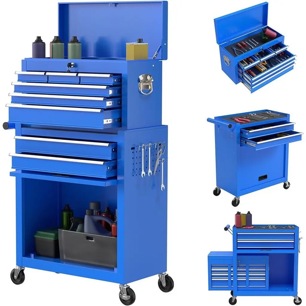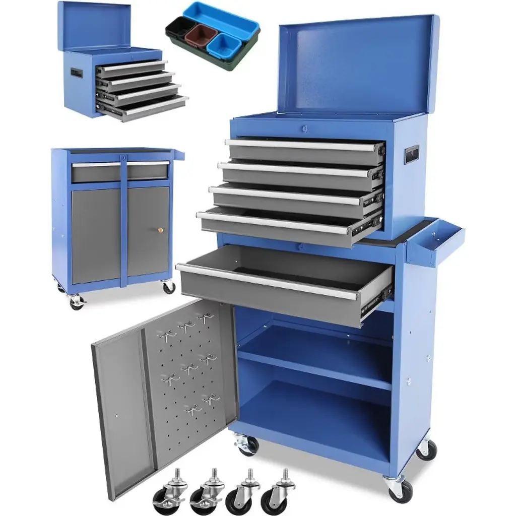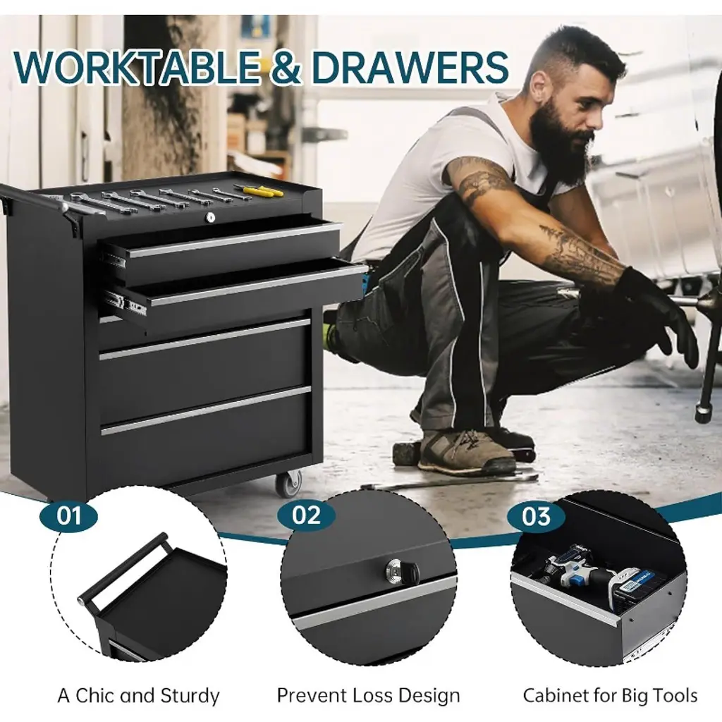 Upgrade your garage or workshop with a rolling tool chest that brings organization, durability, and security to your workspace. With five spacious drawers, you’ll have plenty of room to neatly store and arrange all your essential tools, keeping everything within easy reach. The sturdy steel construction stands up to heavy daily use, holding even your bulkier equipment with dependable stability, so you can count on your storage for years to come. Effortlessly retrieve tools thanks to ball-bearing drawer slides that open and close smoothly, reducing everyday wear and saving you the frustration of sticking drawers. Move your tool chest wherever you need it, thanks to the convenient handle and four strong wheels—two of which lock securely in place for added safety while you work. The robust tabletop is perfect for quick tasks or organizing small items before a project. For added peace of mind, a built-in lock and set of keys keep your tools protected when you’re away, and the included drawer liners help prevent scratches and keep everything in top condition. This tool chest isn’t just storage—it’s a smart and reliable solution that makes every project run smoother and your workspace more efficient.