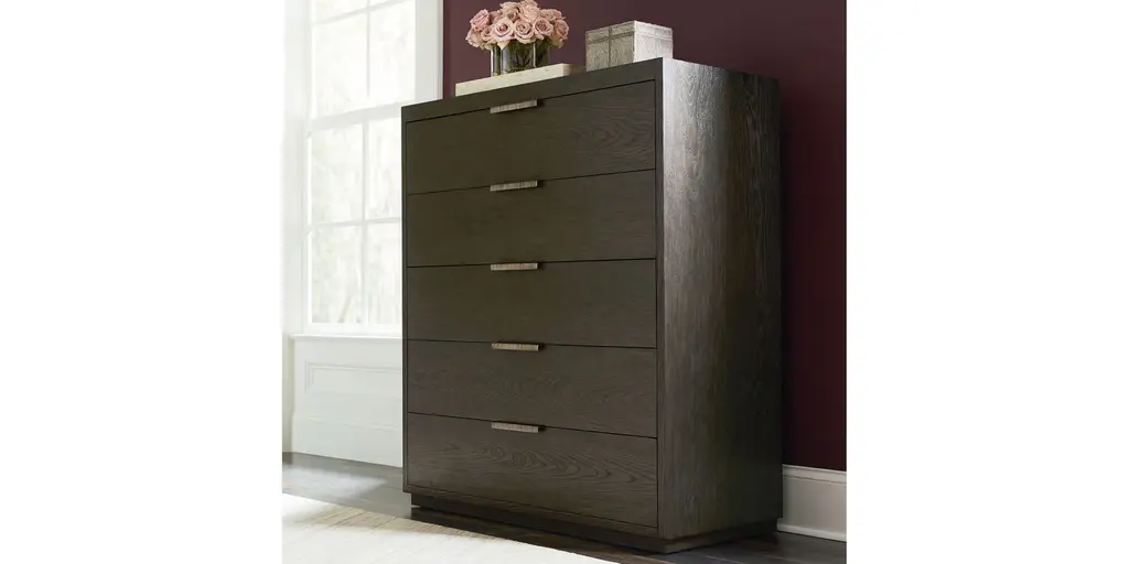 The clean lines of the MODERN Astor Five-Drawer Dresser, along with the sleek champagne-hued hardware, create an irresistibly retro look. The dressers multi-dimensional oak makes this a durable piece that youll have for many years to come. Choose from a Lyon Brown or Normandy Gray finish to create your perfect look. Soft, self-closing mechanisms keep drawers neatly closed, and dust dividers keep even the fullest drawers tidy.