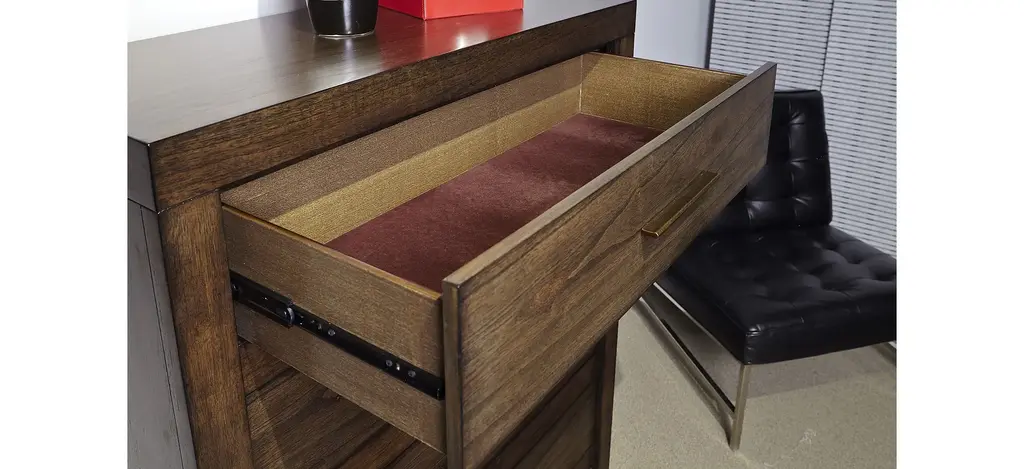 Modern Loft 5 Drawer Chest is made up of beautiful Mindi veneers with a distinctive grain pattern and includes a wide variety of special features and functionality. The aged bronze finish hardware and clean lines offer a look that is both stylish and timeless.