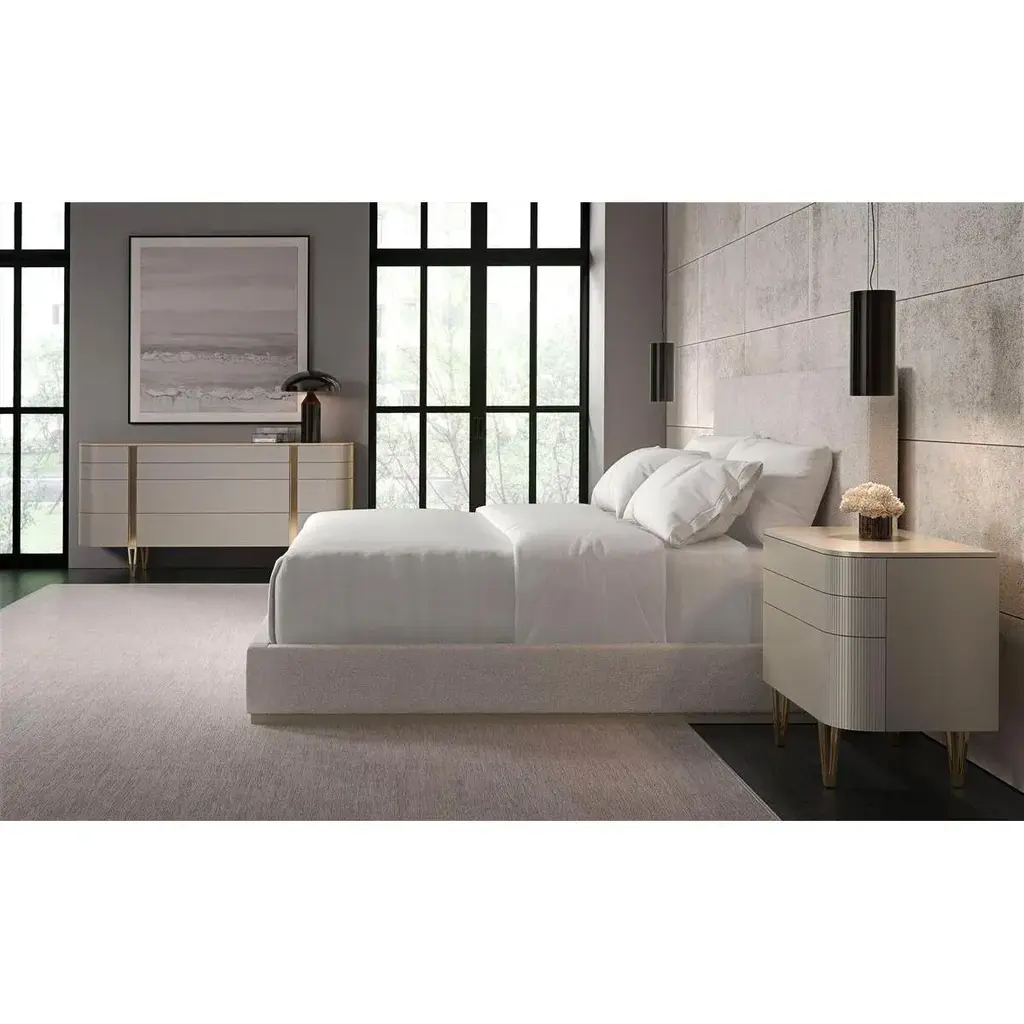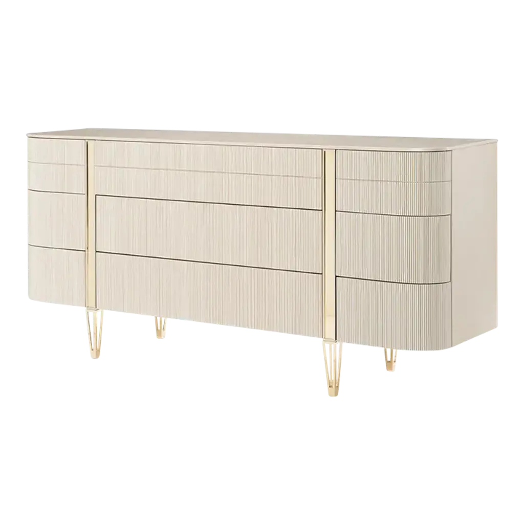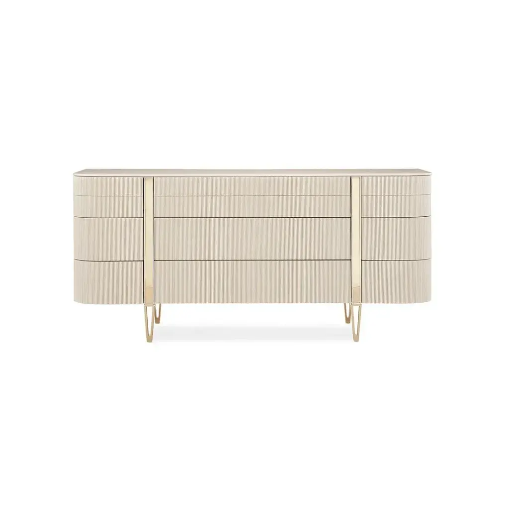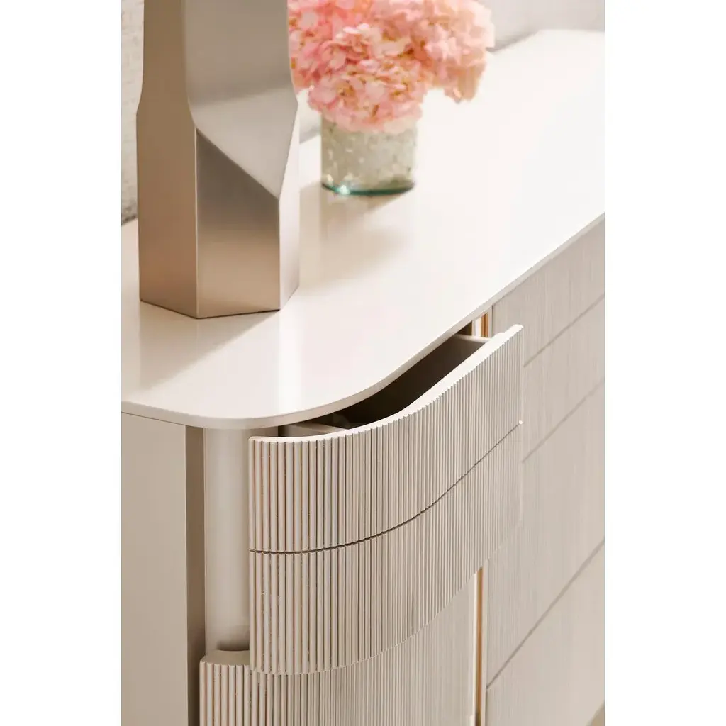 Representing the ultimate combination of form and function, it creates a space worthy of your finest clothing. All drawers are completely finished and wear Matte Pearl. The gracefully rounded profile of its fashion-forward design adds visual appeal to any space and is accentuated with exquisite fluted drawer fronts, metal band detailing, and a sophisticated finish palette of Whisper of Gold and Matte Pearl. Raised on reticulated tapered metal legs. Dimensions: 74" W x 19" D x 35" H