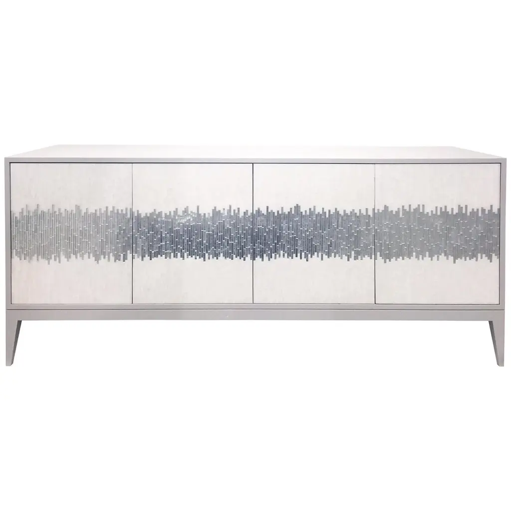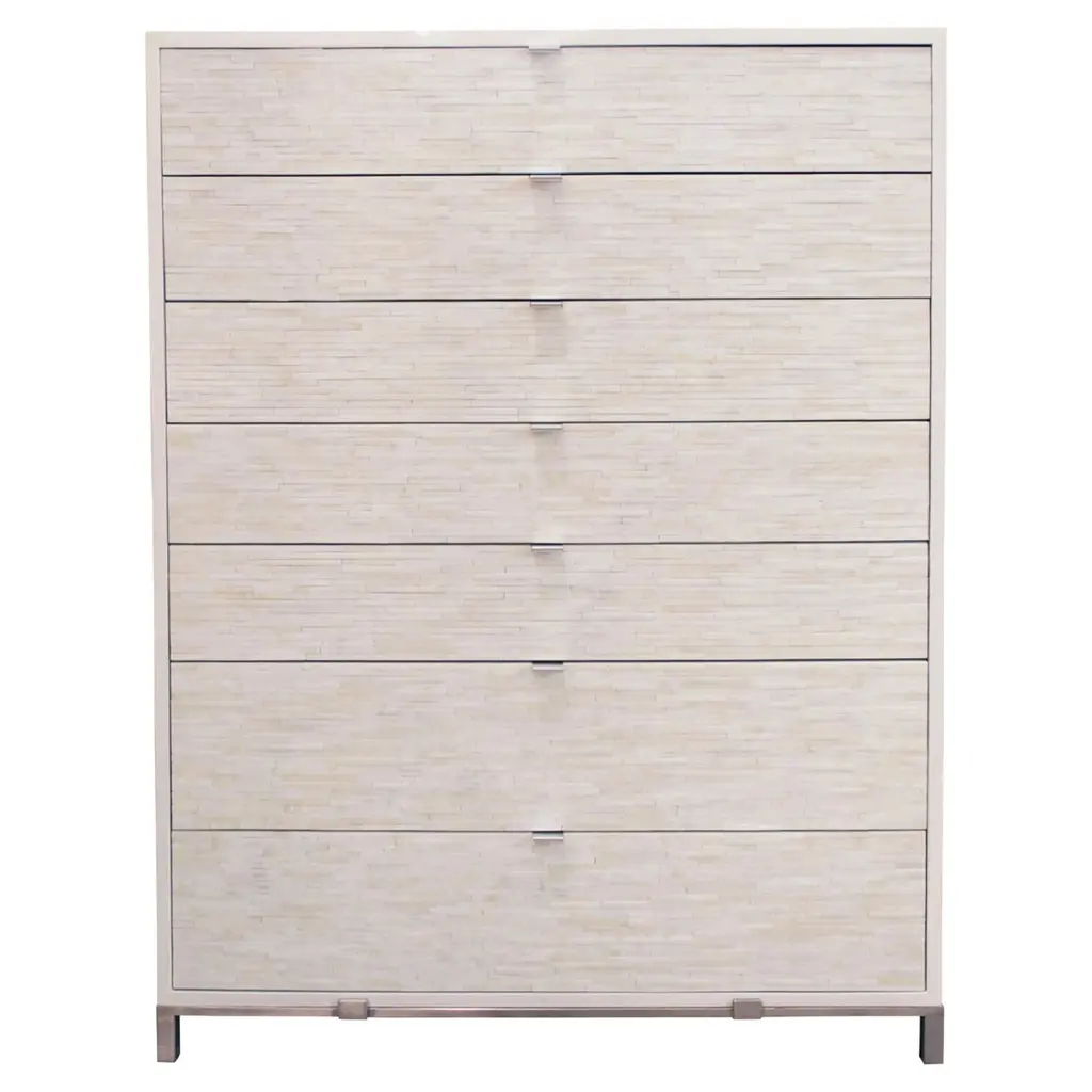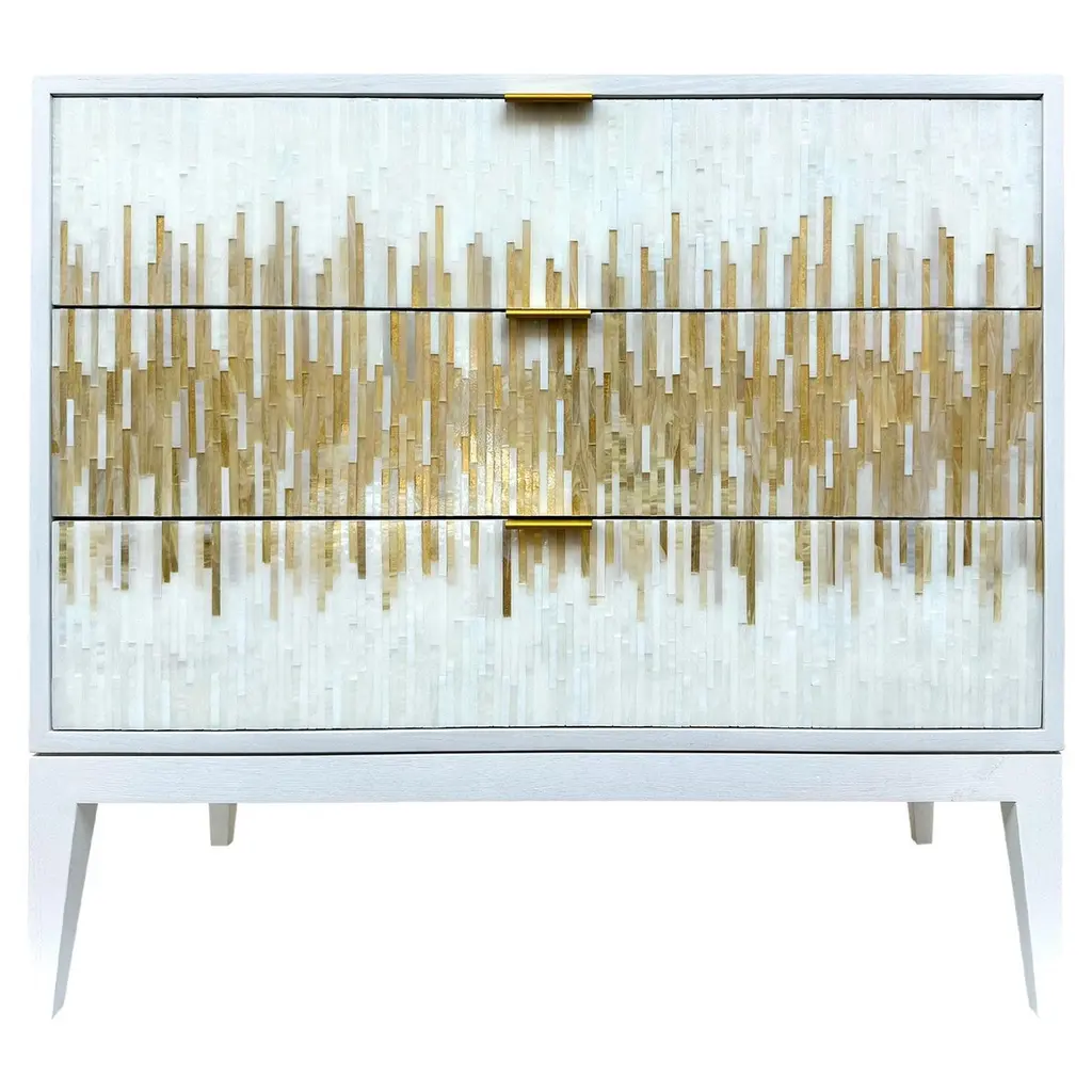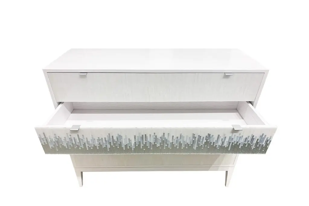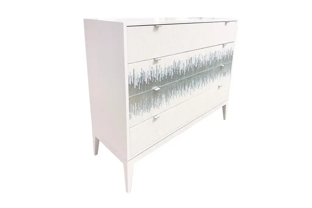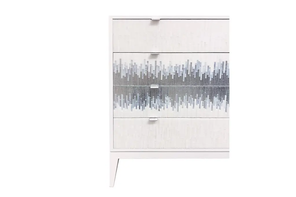 The Milano chest of drawers by Ercole Home has a 4-drawer front, with painted white wood finish on oak. Hand cut glass mosaics in icy white, wispy white silver, and silver decorate the surface in a continuous wave pattern.There are two metal edge pulls in brushed chrome finish on each drawer, with self-closing drawer glides.Custom sizes and finishes are available. You can add drawers and compartments in varying sizes to the interior as well.Made in New York City.