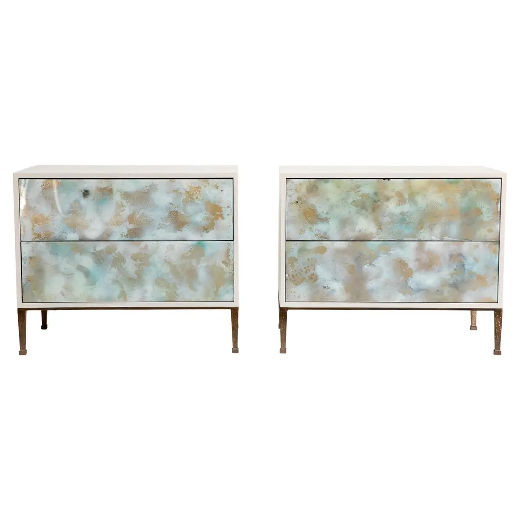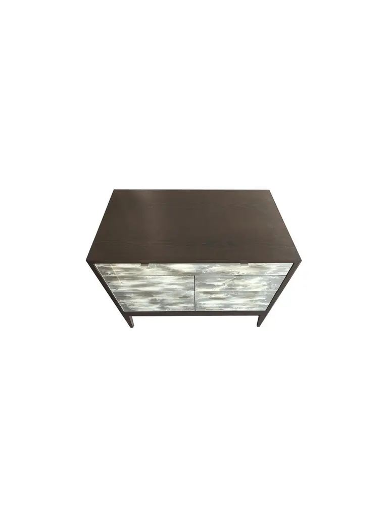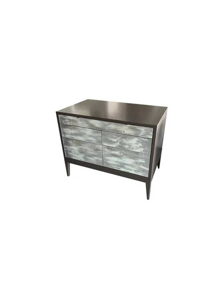 The Custom Milano Mystic chest of 6 drawers by Ercole Home is six drawer dresser. There is on top one long pencil drawer, below that is a medium size drawer, and the bottom drawer is largest. The desk is made of Oak and has a Earl Gray Paint finish. The drawers of this piece are covered in our one of a kind hand painted mystique glass in our galaxy finish. The top drawer operates with silver pulls on each with the bottom four of the dresser use touch latch. Custom sizes and finishes are available. You can add drawers and compartments in varying sizes as well.Made in New York City.