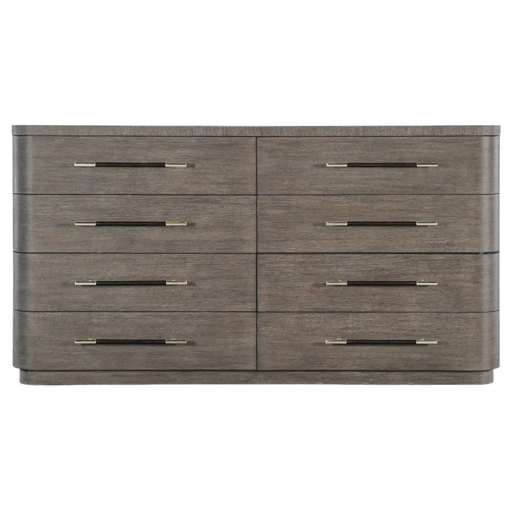 Softly sophisticated with a clean modern profile and luxe mixture of materials, the Modern Mood Dresser is a stunning statement piece. The case has rounded corners and a plinth base and offers 8 self-closing drawers. The top two drawers have drop-in felt liners, there’s a removable jewelry tray in the top right drawer and the bottom two drawers are cedar-lined. Crafted of Oak Veneers, the dresser is accented by metal pulls wrapped in leather.
