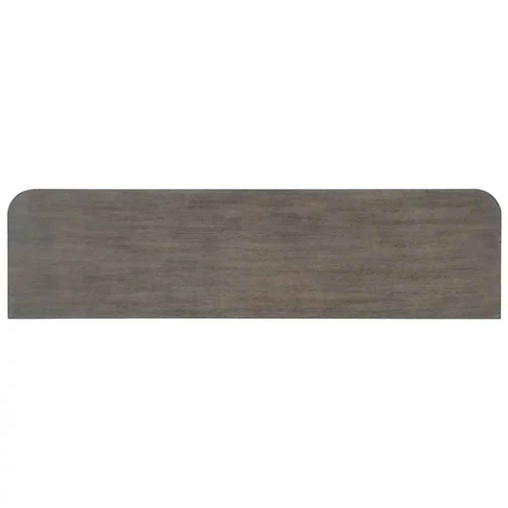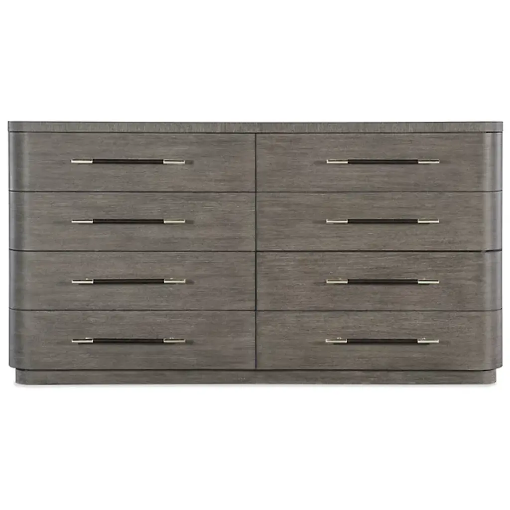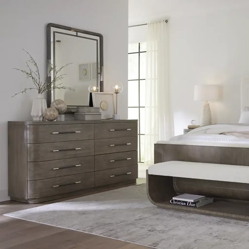 The Modern Mood Dresser from Hooker Furniture commands attention through its expansive form elevated on a plinth base that creates visual lightness beneath the substantial case. Eight self-closing drawers arranged in symmetrical pairs provide extensive storage while leather-wrapped metal pulls add tactile richness across the oak veneer surface. The dresser’s rounded corners soften the geometric lines. Specialized storage includes felt-lined top drawers with a removable jewelry tray, while cedar-lined bottom drawers offer garment protection, making this piece both beautiful and highly functional.