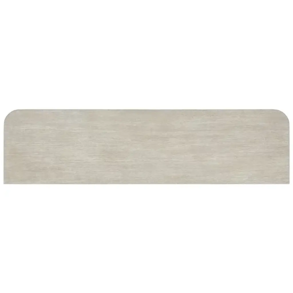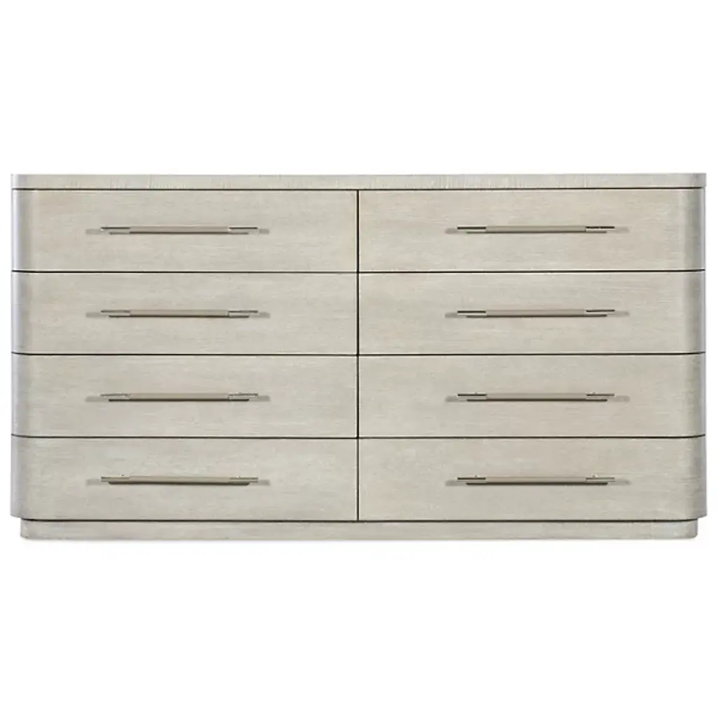 The Modern Mood Dresser from Hooker Furniture commands attention through its expansive form elevated on a plinth base that creates visual lightness beneath the substantial case. Eight self-closing drawers arranged in symmetrical pairs provide extensive storage while leather-wrapped metal pulls add tactile richness across the oak veneer surface. The dresser’s rounded corners soften the geometric lines. Specialized storage includes felt-lined top drawers with a removable jewelry tray, while cedar-lined bottom drawers offer garment protection, making this piece both beautiful and highly functional.