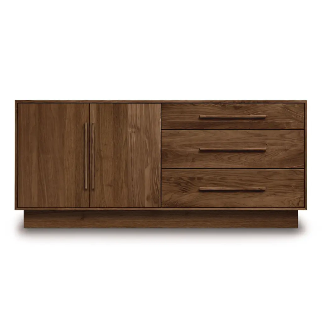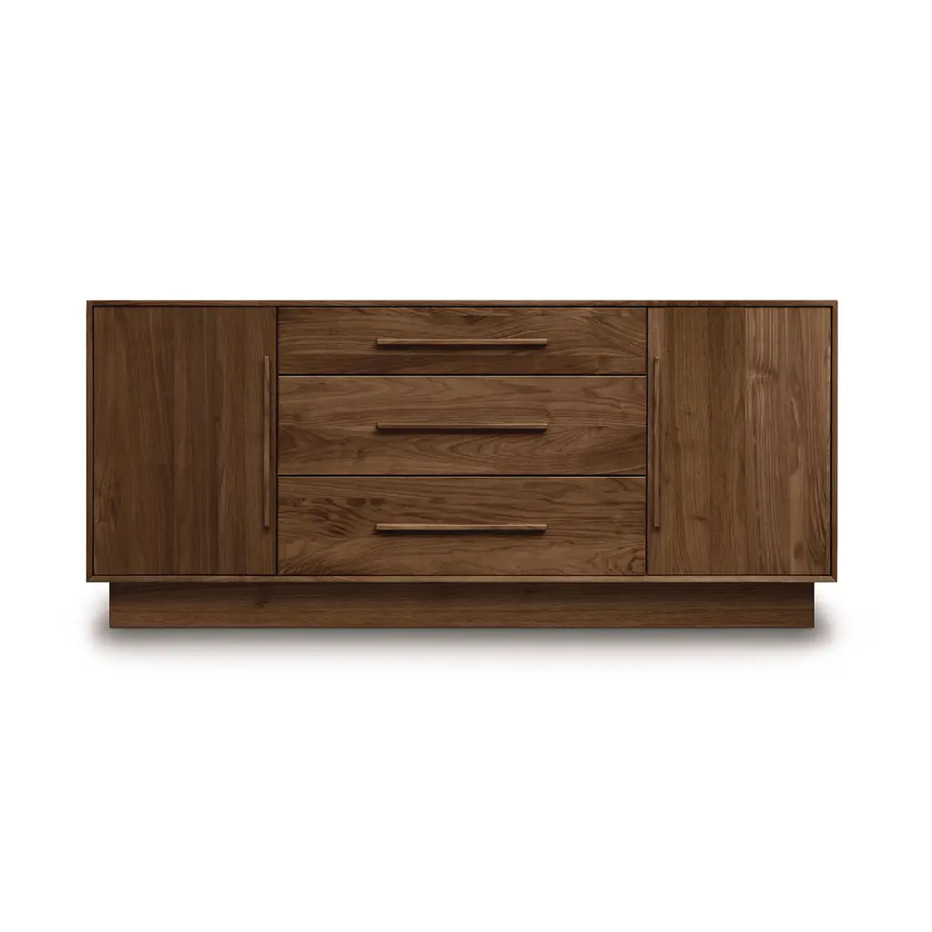 Give your bedroom the convenient storage and modern style it needs with the Copeland Furniture Moduluxe 29-Inch 3 Center Drawer/2 Door Sideboard. It features two single cabinet spaces (with an adjustable shelf each) on either side of 3 drawers. It is a large piece that is just as well-suited a stand-alone piece as it is a component of a complete 29-Inch Moduluxe system.