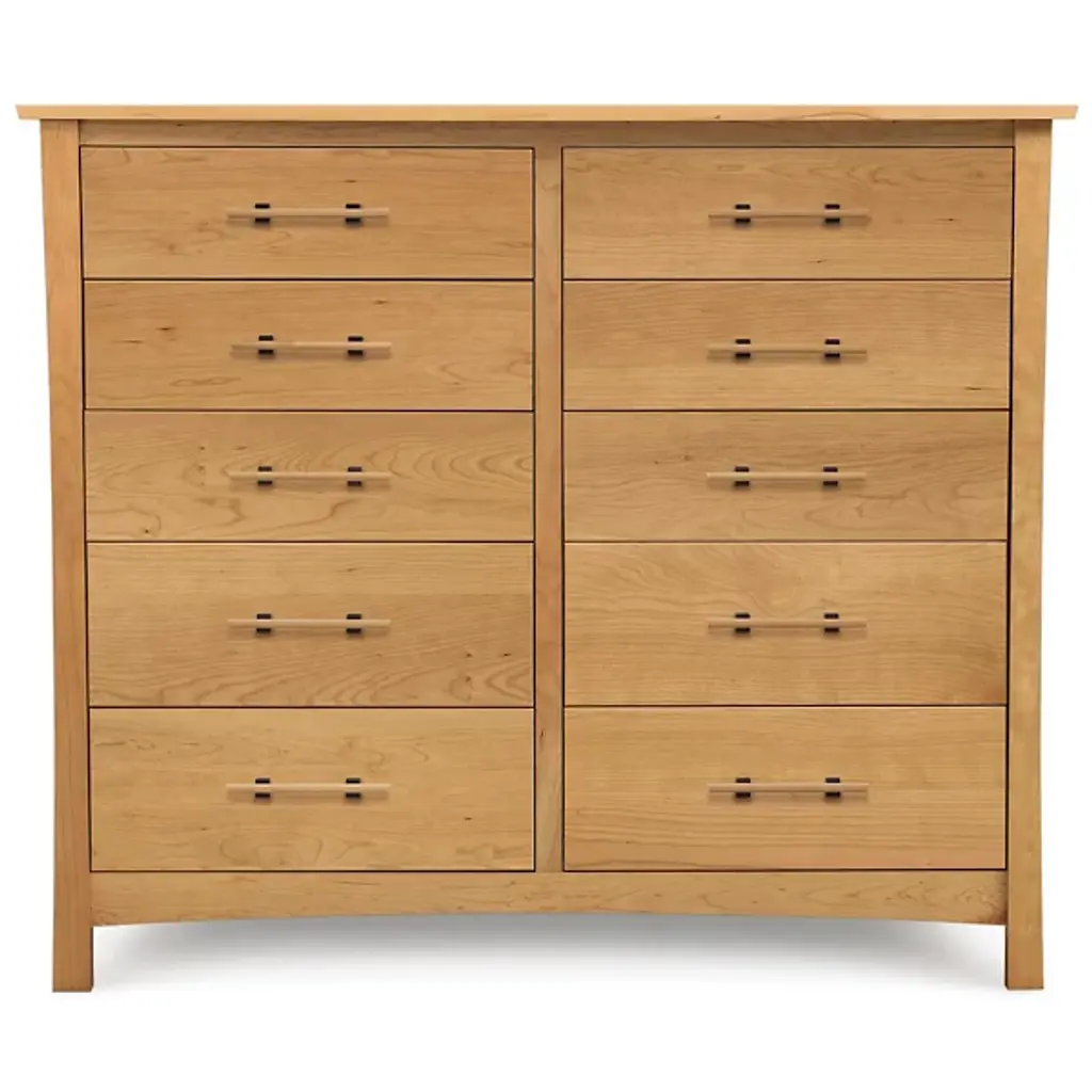 Neatly staged for neat storage. A striking piece of furniture that begs to be used, the Copeland Furniture Monterey 10 Drawer Dresser brings endless space and style to a bedroom. Stacked 5 high, the columns of drawers offer abundant space for clothes and any other possessions in need of a home. Crafted with a mix of traditional furniture making and modern technology, the piece features exceptional quality and convenience. Solid Cherry Hardwood delivers a beautiful naturalism through the frame, with sleek pull bars at the front of the drawers providing a useful accent. Gliding mechanisms keep drawers from catching, allowing the dresser to maintain visual and structural integrity even through countless years and continued use.