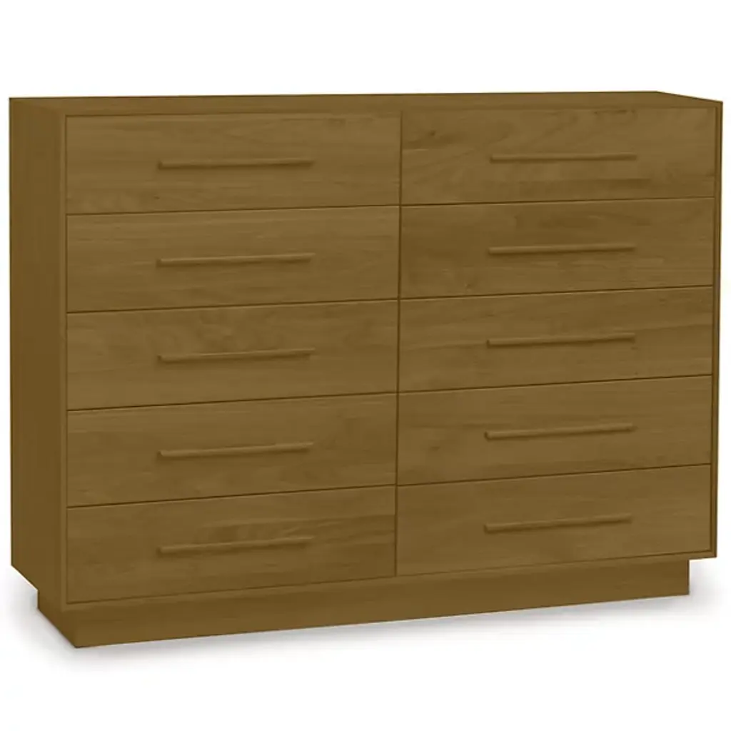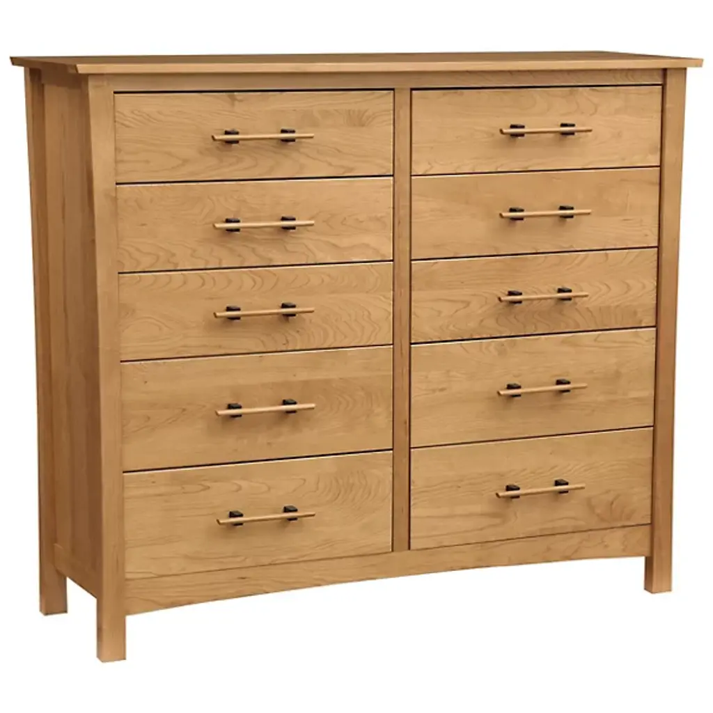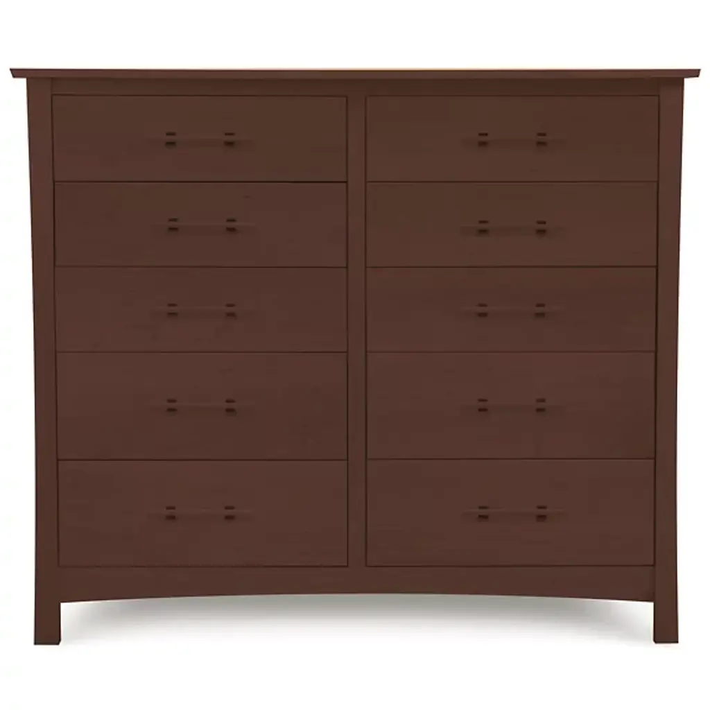 Neatly staged for neat storage. A striking piece of furniture that begs to be used, the Copeland Furniture Monterey 10 Drawer Dresser brings endless space and style to a bedroom. Stacked 5 high, the columns of drawers offer abundant space for clothes and any other possessions in need of a home. Crafted with a mix of traditional furniture making and modern technology, the piece features exceptional quality and convenience. Solid Cherry Hardwood delivers a beautiful naturalism through the frame, with sleek pull bars at the front of the drawers providing a useful accent. Gliding mechanisms keep drawers from catching, allowing the dresser to maintain visual and structural integrity even through countless years and continued use.