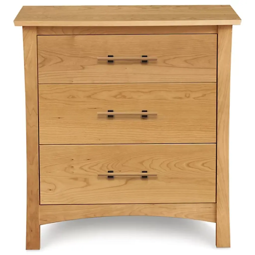 Storage space with a strong elegance. While the curves and lines of the Copeland Furniture Monterey 3 Drawer Dresser present a classy aesthetic, the well-built frame makes this a forceful fixture. Solid Cherry Hardwood gives the dresser enduring durability, carefully crafted to withstand a long life full of opening and closing. Innovative drawer glides help with that longevity, improving the dresser’s function and protecting the material. With 3 compartments in the piece’s medium frame, there’s plenty of storage space for whatever needs stowing. From the angled legs to the smooth surface atop the dresser, every element has natural aesthetic appeal and the sturdiness to withstand an existence of utility.