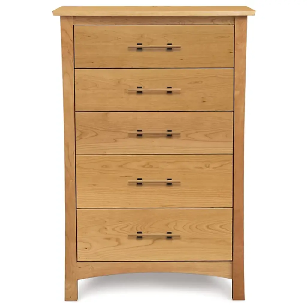 A charming structure with practical poise. The tall frame of the Copeland Furniture Monterey 5 Drawer Dresser provides excellent storage space within a beautiful, vintage body. Taking no shortcuts in design, the dresser is constructed of Solid Cherry Hardwood, gaining natural grace and strength from the material. Combining the Hardwood’s natural durability with innovate drawer glides and balanced structuring, the narrow dresser has clear integrity throughout its frame. Along the face of the drawers are matching pull bars, intricately detailed to decorate the piece with subtle accents. With ample storage space packed into a reserved body, the unit makes the most of its build and brings fashionable utility to the room of your choosing.