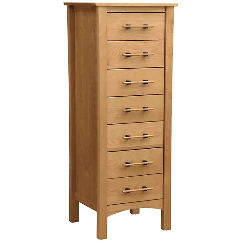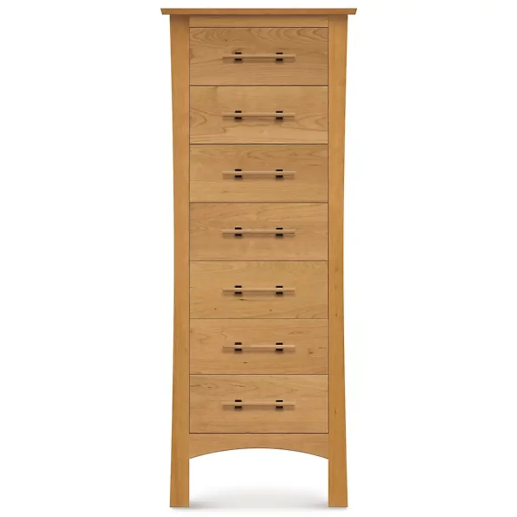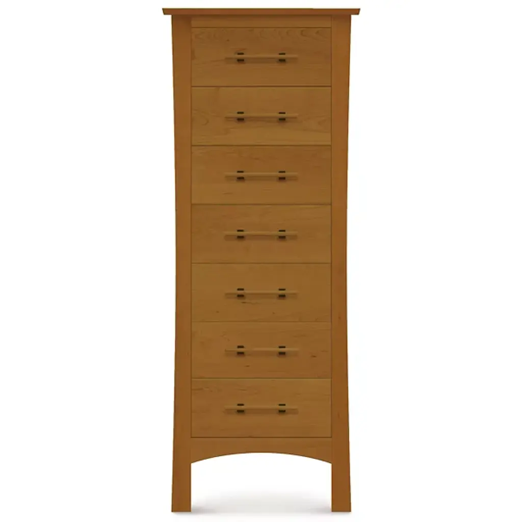 Heightened style through actual height. Standing tall and proud, the Copeland Furniture Monterey 7 Drawer Dresser delivers storage in a narrow, elegant frame. With 7 drawers using functional gliders, space is abundant and easily accessed. The slender body stands on 4 strong, slender legs, enhancing the upright visual. Perhaps the most stylish element of the structure is the handcrafted Solid Cherry Hardwood, infusing the dresser with a natural elegance from top to bottom. The durable material gives the thin piece a little gravitas while also ensuring a lasting design. Built using traditional techniques and with a contemporary product in mind, the function and style of this dresser have an immediate and drastic impact on your bedroom decor.
