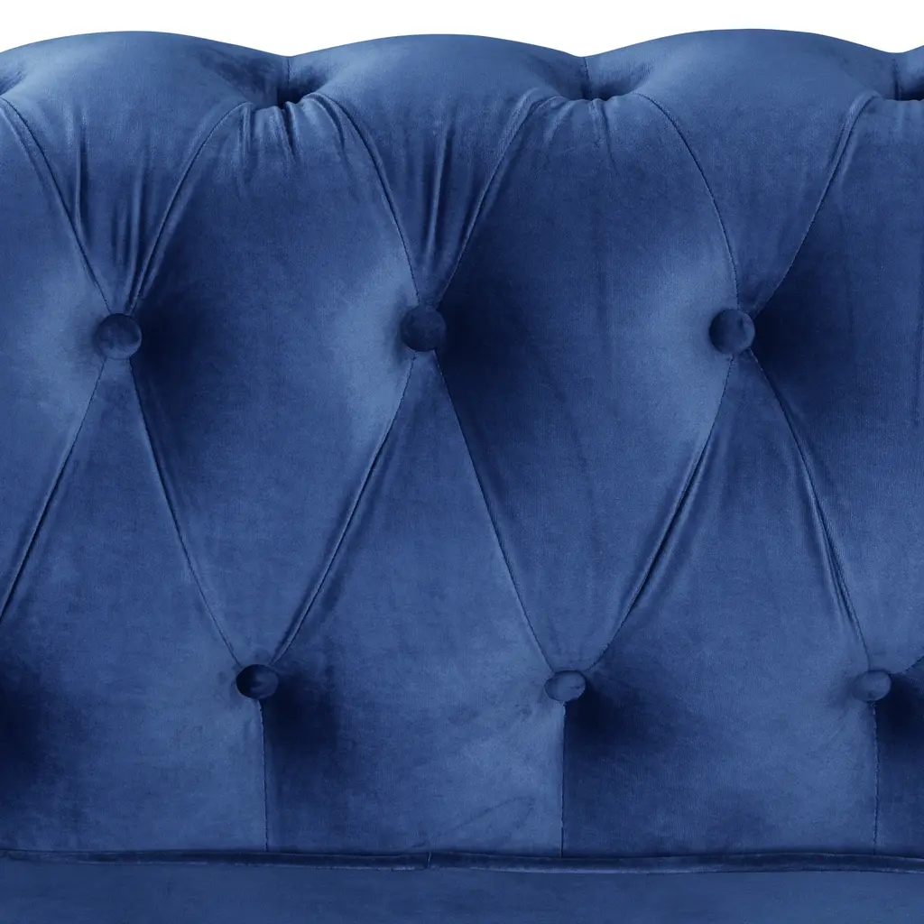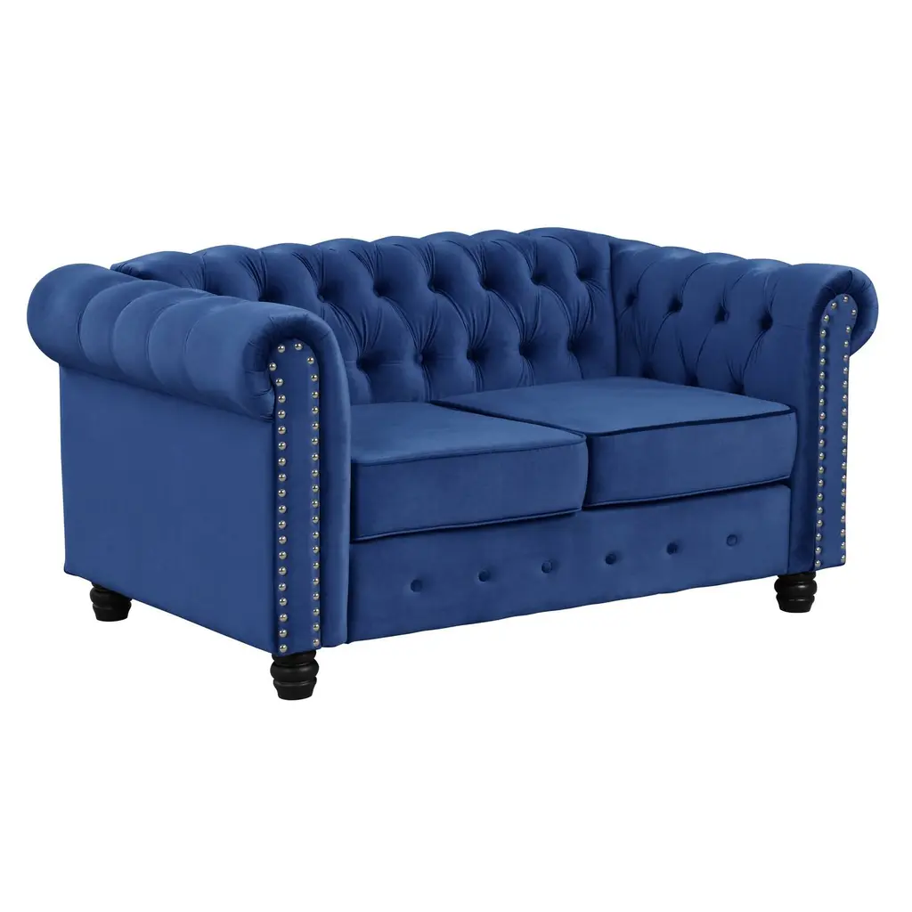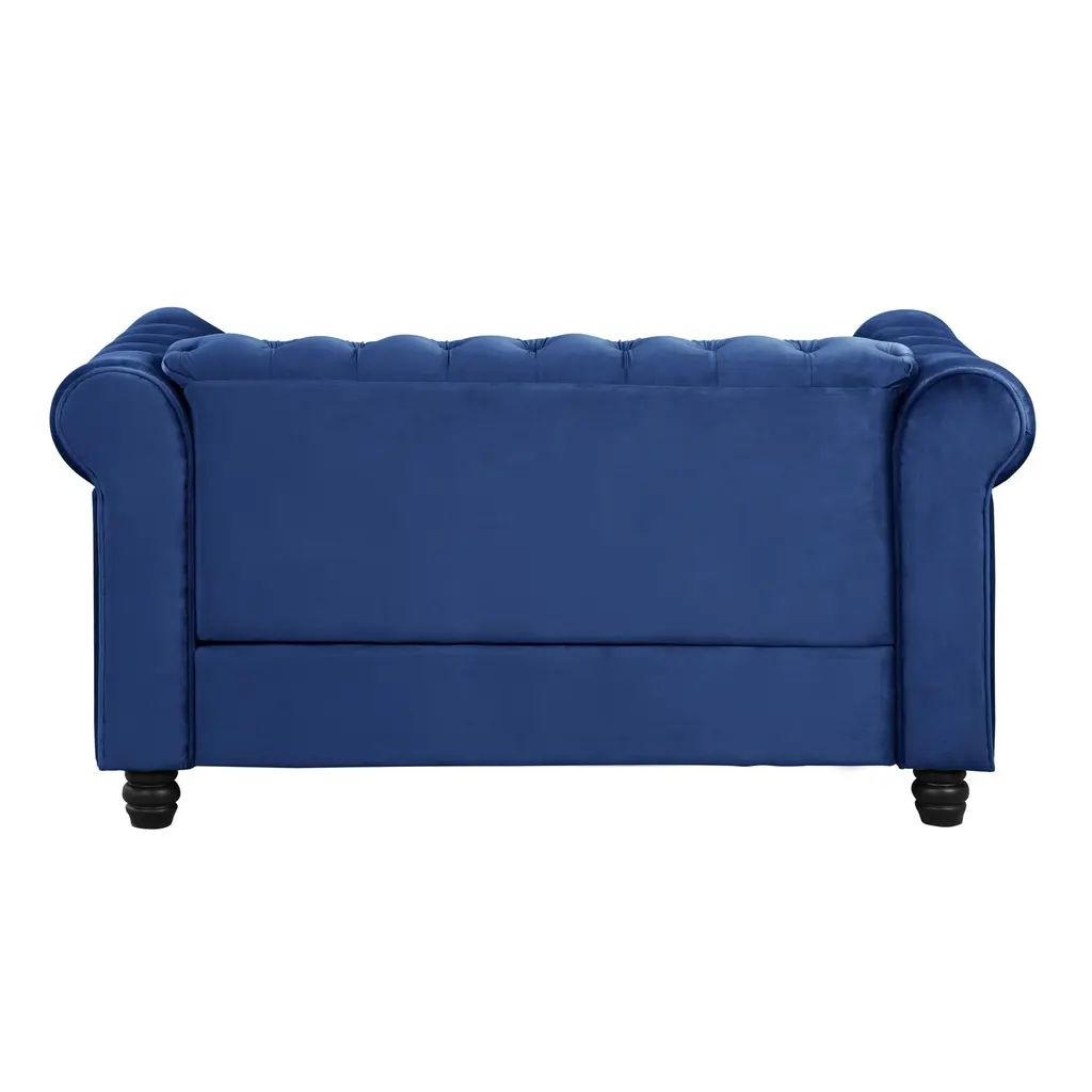Experience comfort and luxury in your living room with the Morden Fort Tufted Upholstered Chesterfield Loveseat. Inspired by 1930s Britain, this loveseat combines a regal yet modern feel with soft-to-the-touch Dutch velvet fabric that will make you feel good about you. Its traditional Chesterfield style with button-tufted accenting, scrolled arms, and turned legs is hard to overlook, while its sturdy rubber wood frame ensures durability. The seat cushions are filled with high resilience foam and polyester fiber wadding for extra comfort and longevity. Make your home a place where you can feel relaxed and proud with Morden Fort Furniture.Features:Specifications: