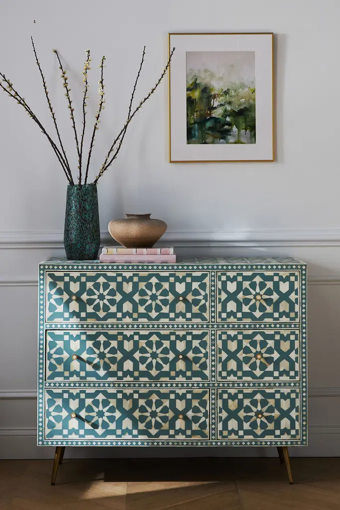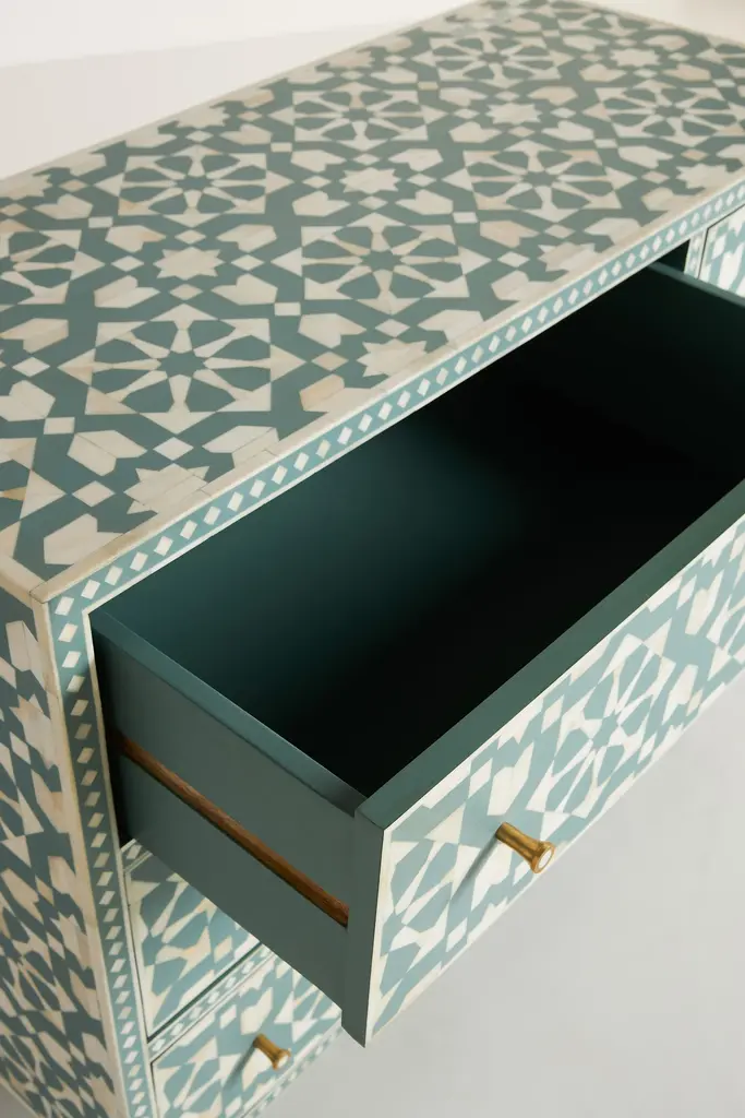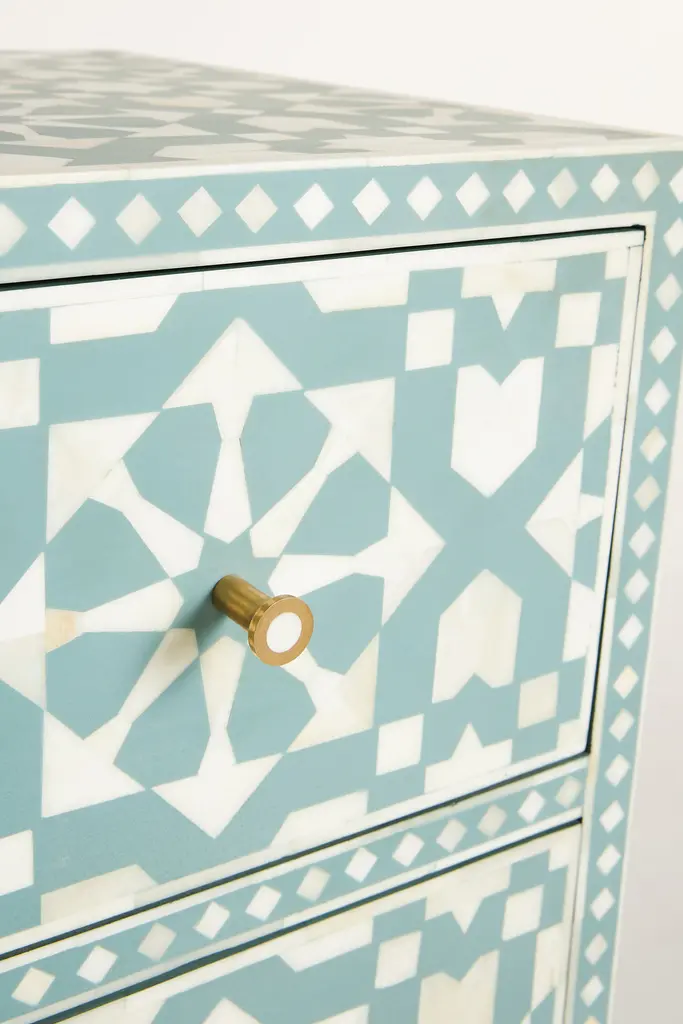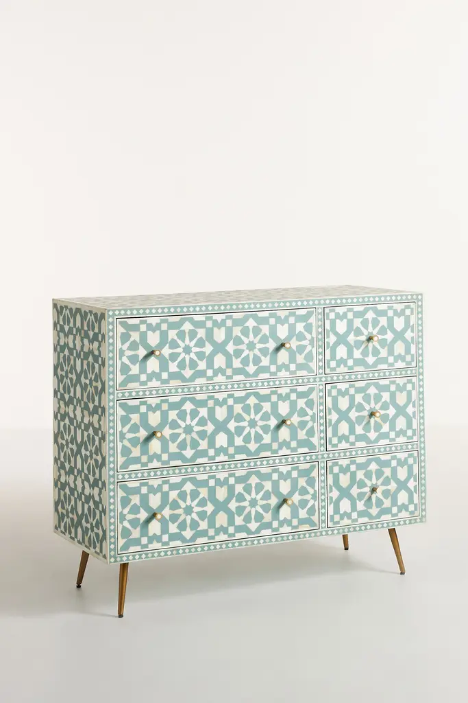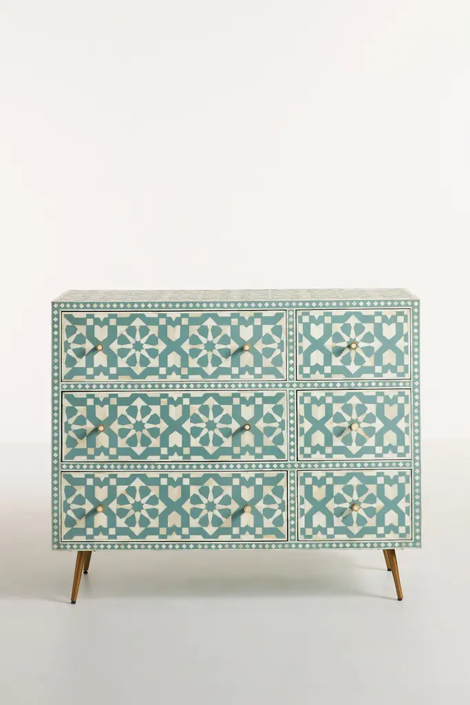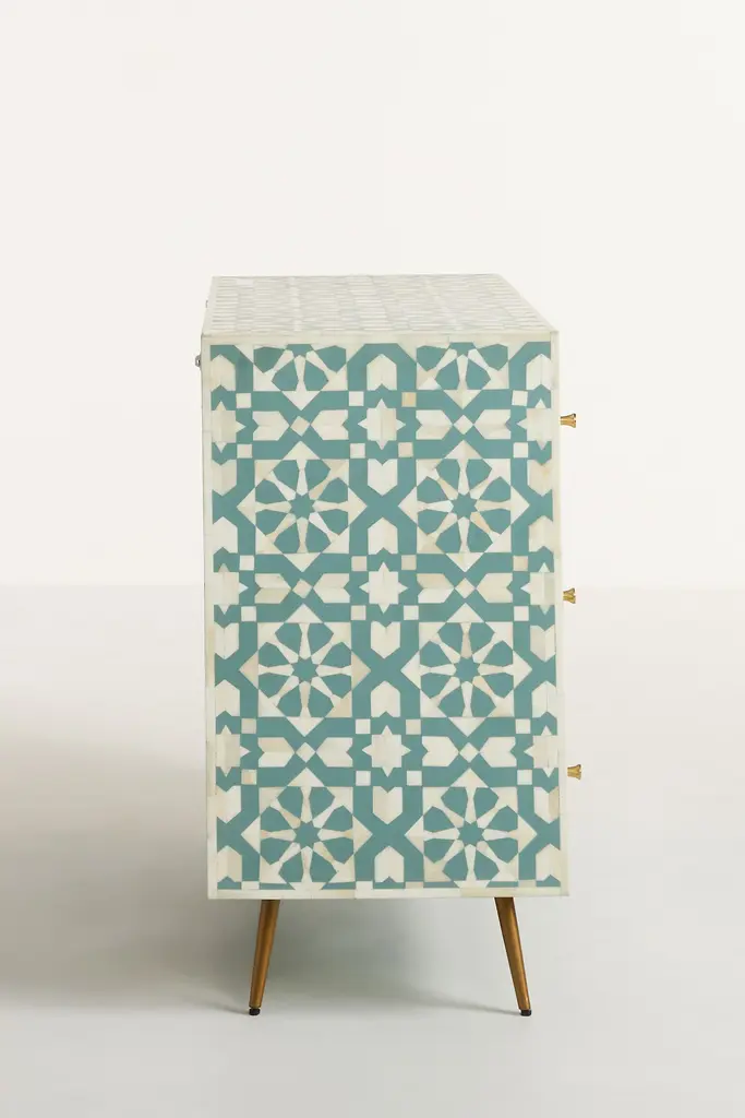 Since the days of ancient Egypt, craftsmen have been using inlaid bone to decorate furniture surfaces, and for good reason: it embodies a natural sheen that adds instant luxury to any space. Handcrafted using the same centuries-old technique, this dresser features an intricately patterned bone inlay design perched on tapered brass legs.For ordering assistance and more, please contact us. For aesthetic advice and tips to help decorate your space, enjoy our complimentary home styling services.For more information on the materials and techniques of this piece, click here.