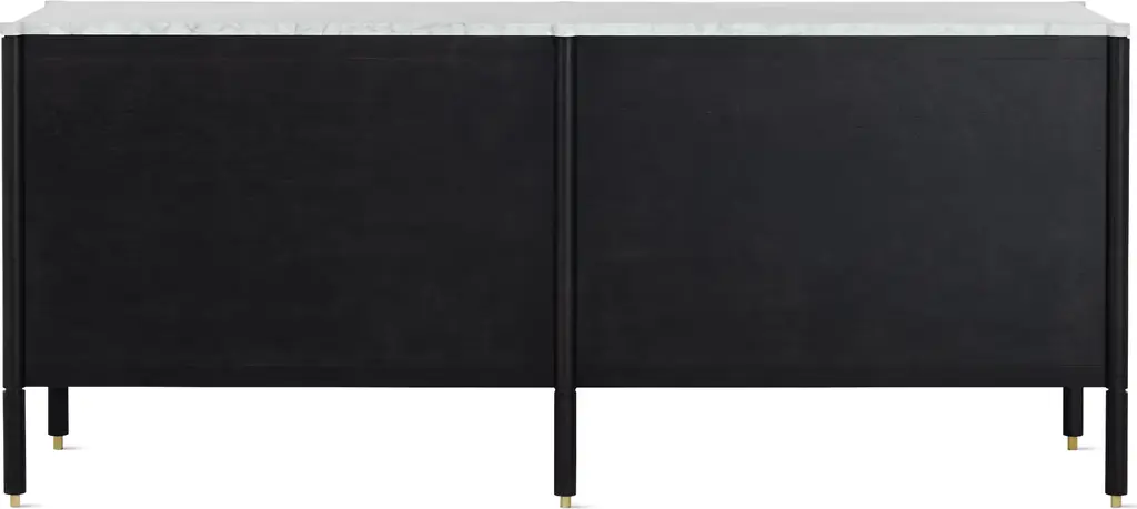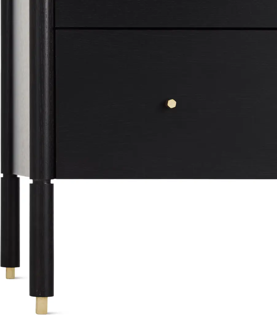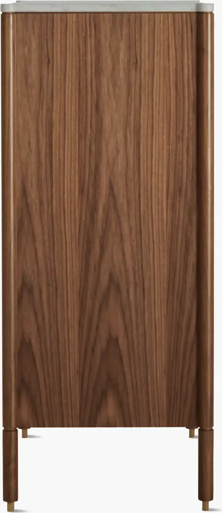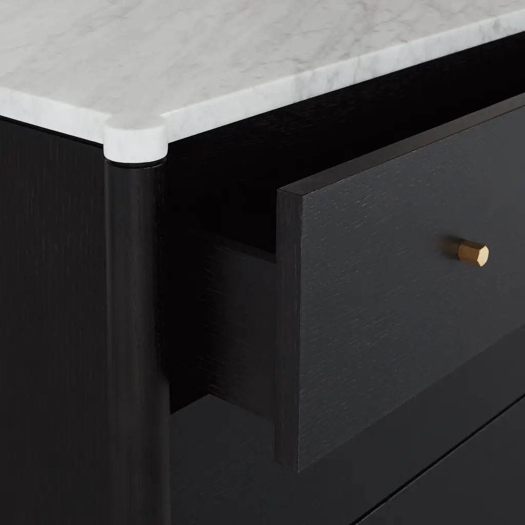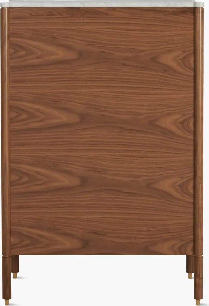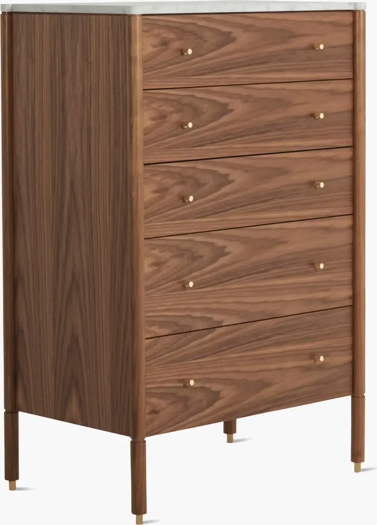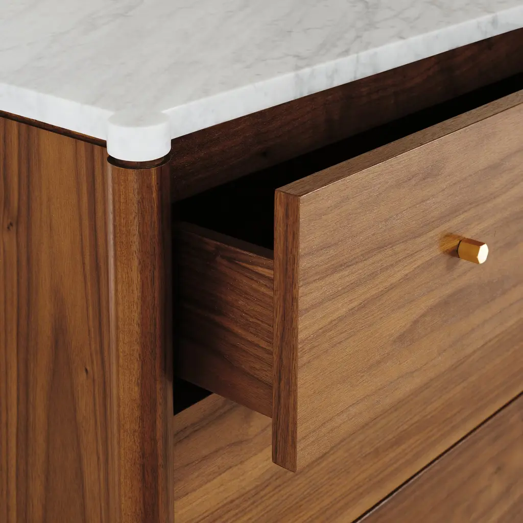 Designed by all-female trio Egg Collective, the Morrison Dresser (2012) is a modern interpretation of classic casegoods. The expertly crafted piece is available in two configurations: a wide, 6-drawer version and a tall, 5-drawer version; each offers ample room to store clothes and sundries. A marble top, solid-brass knobs, soft-closing hardware, and leveling feet add extra beauty and convenience. Part of the Morrison storage collection. Made in Canada.