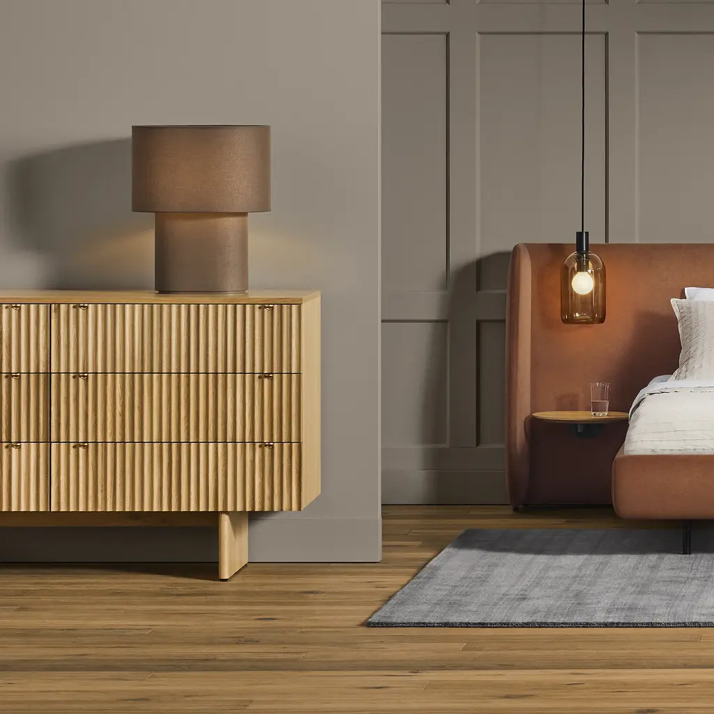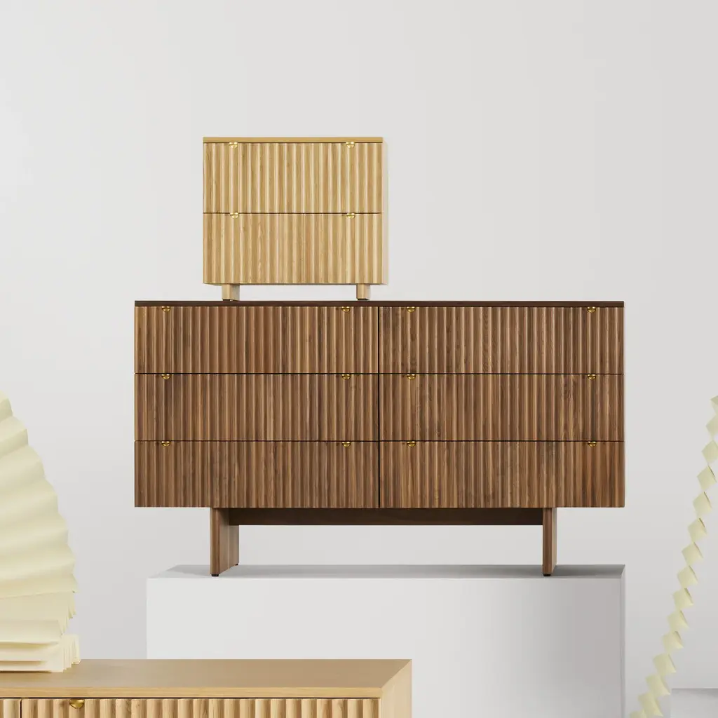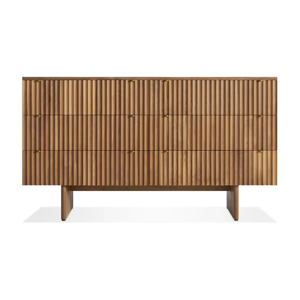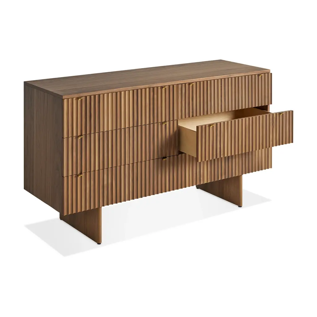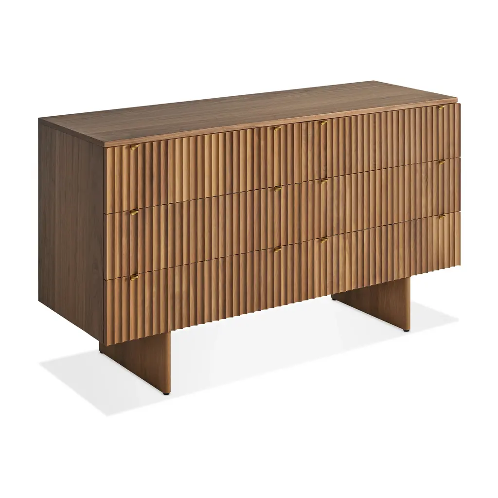 New wave. Murmur puts refined elegance front and center. Fluted wood creates a continuous pattern of textural delight. Small sandcast brass pulls nest in the grooves for subtle sophistication. Convex legs and soft-close drawers complete the pretty picture. Features