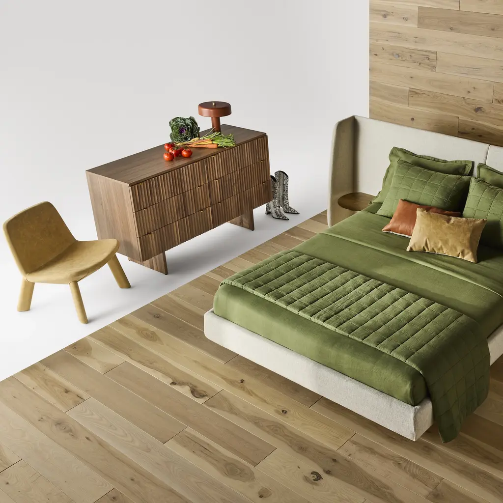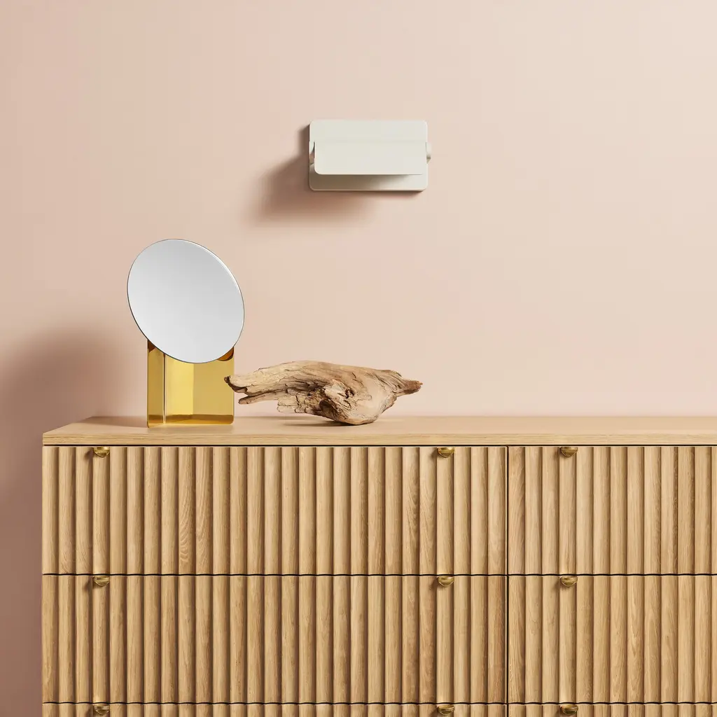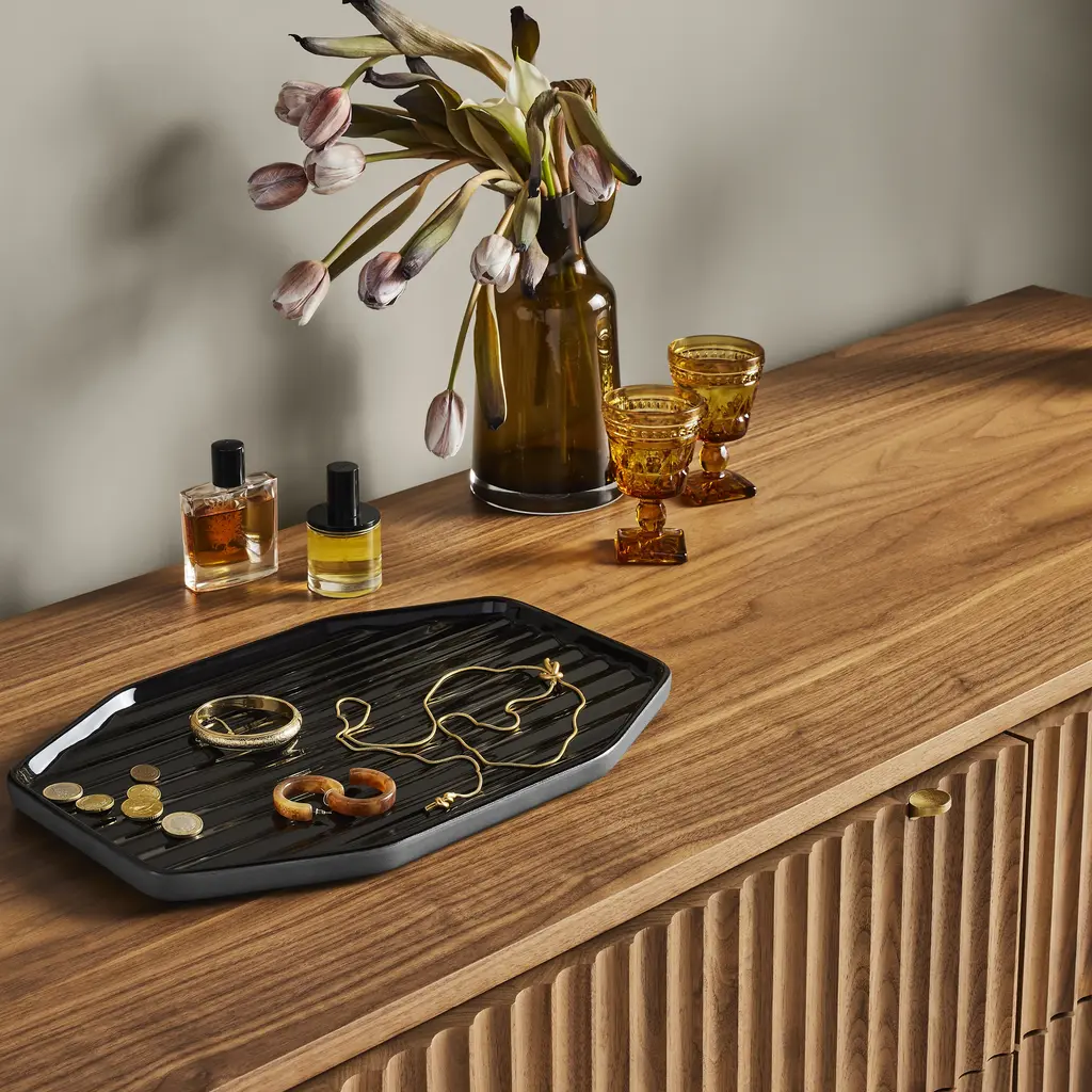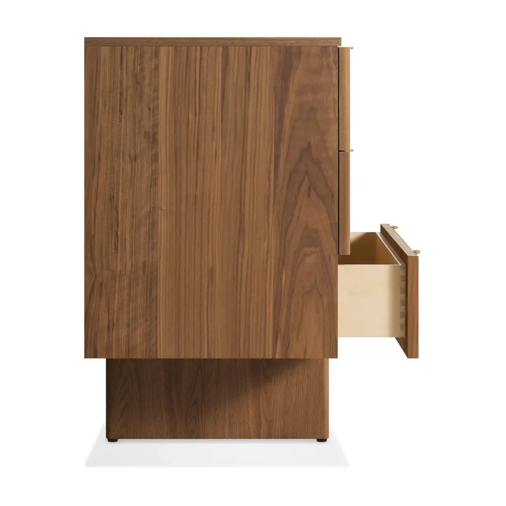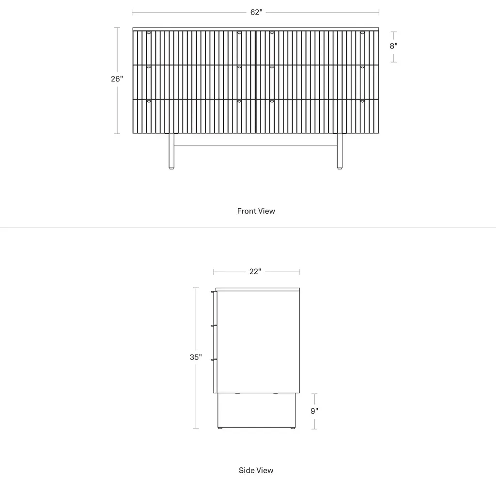 New wave. Murmur puts refined elegance front and center. Fluted wood creates a continuous pattern of textural delight. Small sandcast brass pulls nest in the grooves for subtle sophistication. Convex legs and soft-close drawers complete the pretty picture. Features