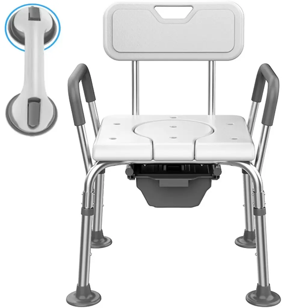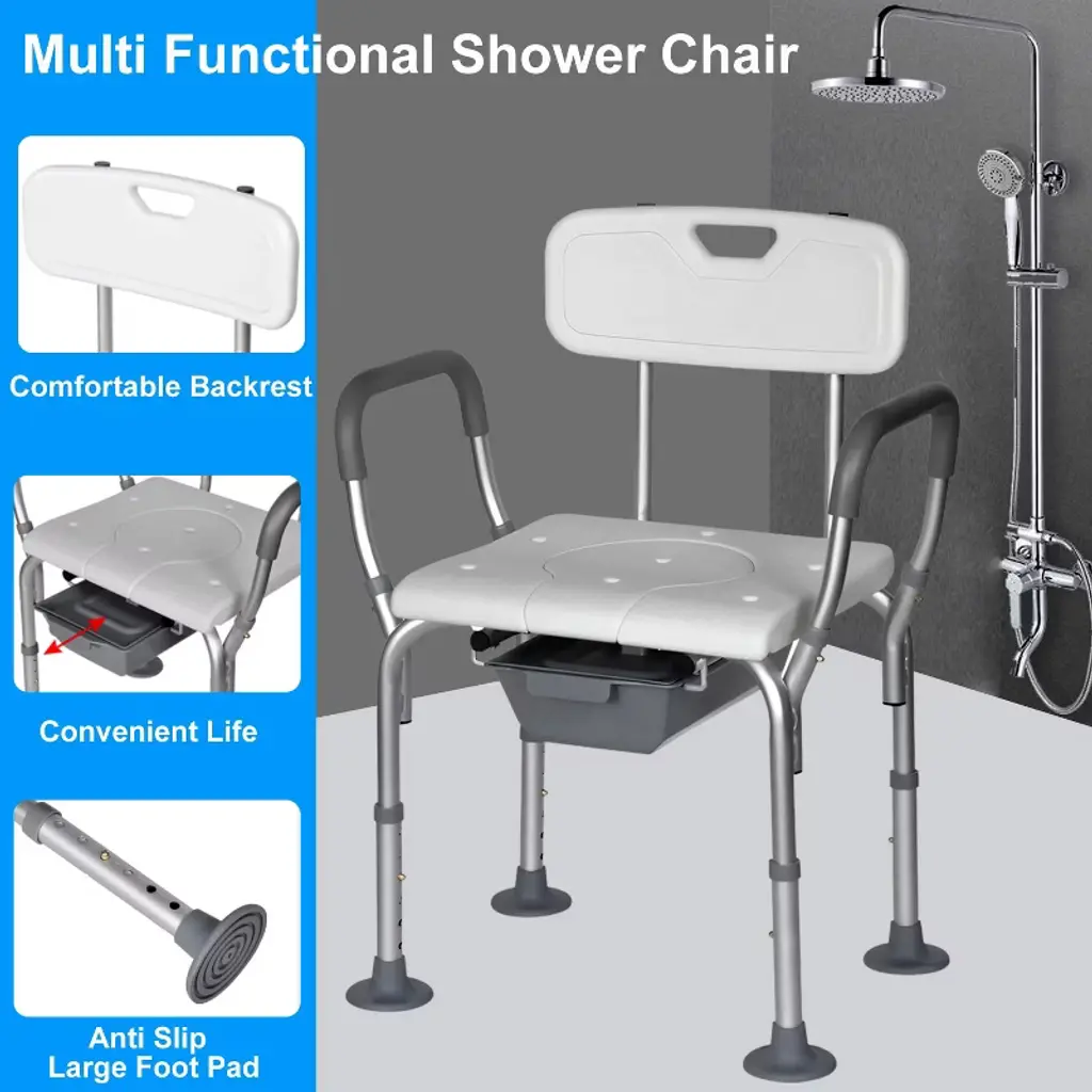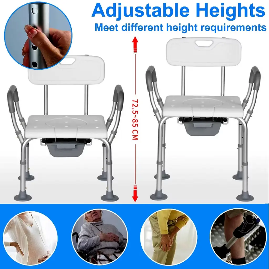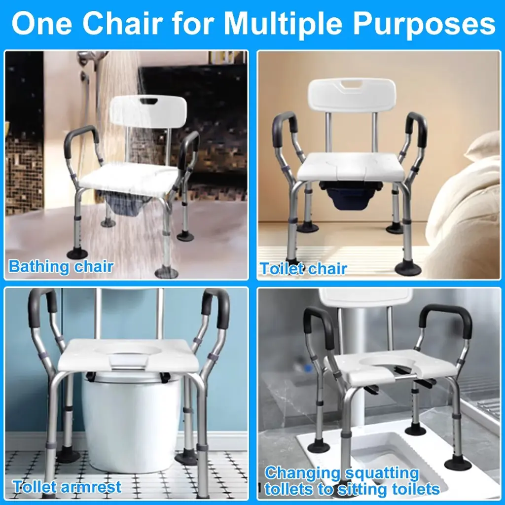 【Strict Quality Control】 Shower Chairs are manufactured with strict quality control standards. Each Shower Chair and its components undergo extensive testing for optimal performance and to pass laboratory performance tests. All of this is just to give you a better shopping experience. Shower stool,shower seat,shower bench,Bath Seat,Bath Bench [3-in-1 Design]: Chair can be used as bedside commode, shower stool and raised toilet seat. A handy, multifunctional piece. [Durable, Reliable, Heavy Duty] shower chairs with arms are made with premium aluminum alloy frames. This sturdy shower chair comes with back support for extra strength up to 350LBs,is one of the best shower chair for Elderly, Adults, Disabled or people recover from surgery. [Comfort to Use] - This bath chair have a bath seat pad which is antislip and detachable, and easy to clean. This shower chair for the elderly has 4 anti-slip rubber feet to make it stable. Many drainage holes on the bathtub and pad, can help water drain during bathing. [Portable and Tool-Free assembly] - This shower chair is also portable design, makes it lightweight and easily lift in daily use. It Can be assembled just hand, with no additional tool requirement. [ADJUSTABLE HEIGHT:] For maximum convenience, we designed our shower seats to fit in most bathrooms. It has adjustable seat height can meet your needs. [Double Safety] - The strong Shower Grab Bar design works on any non-porous and flat surface, including tile, glass, acrylic and fiberglass. the grab bar provides additional stability when entering and exiting the tub or shower for comfortable experience. The suction grab bars for bathtubs and showers have comfortable easy to grip handles that ensure a non-slip grip for more stability and enhanced security.