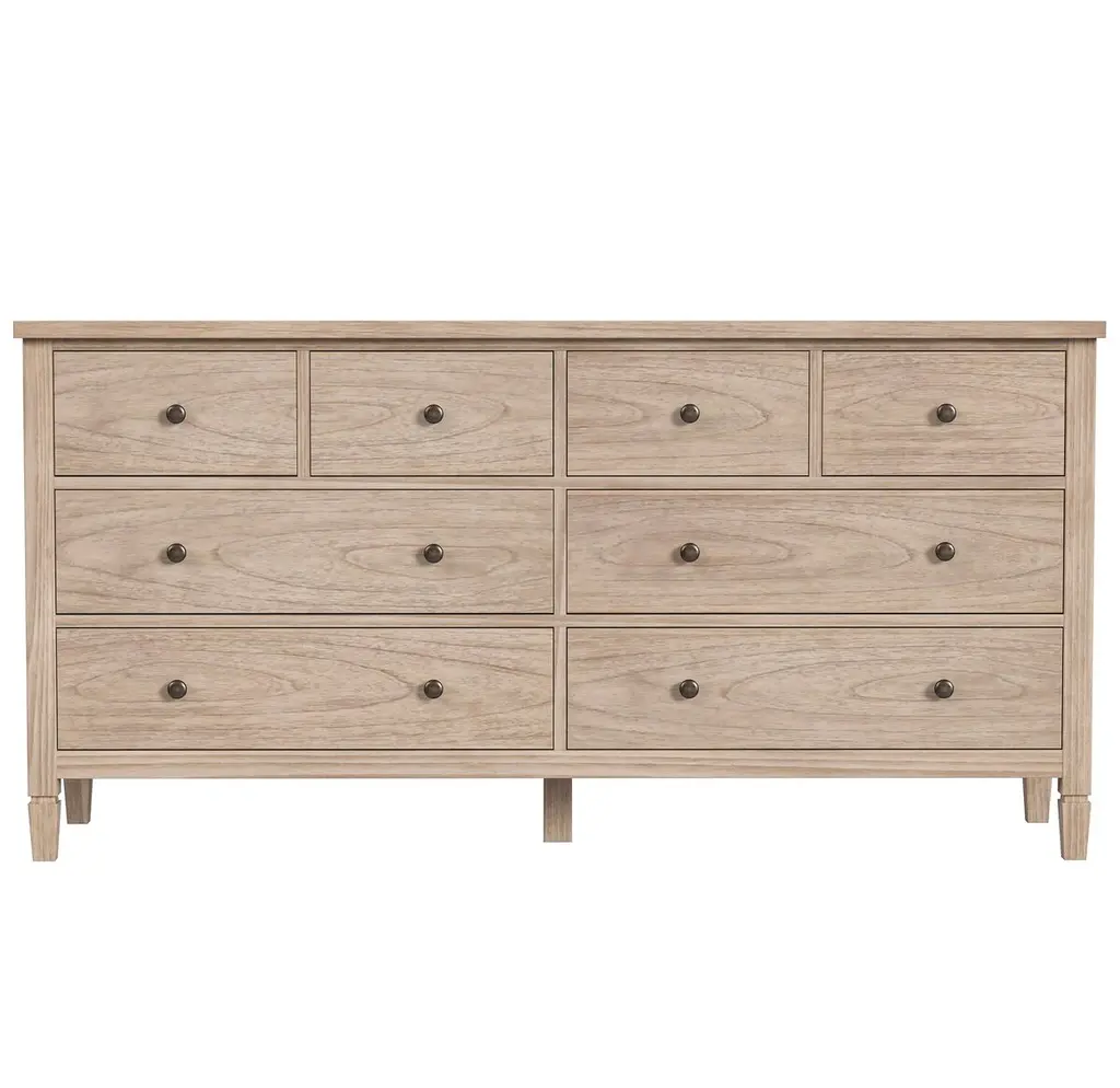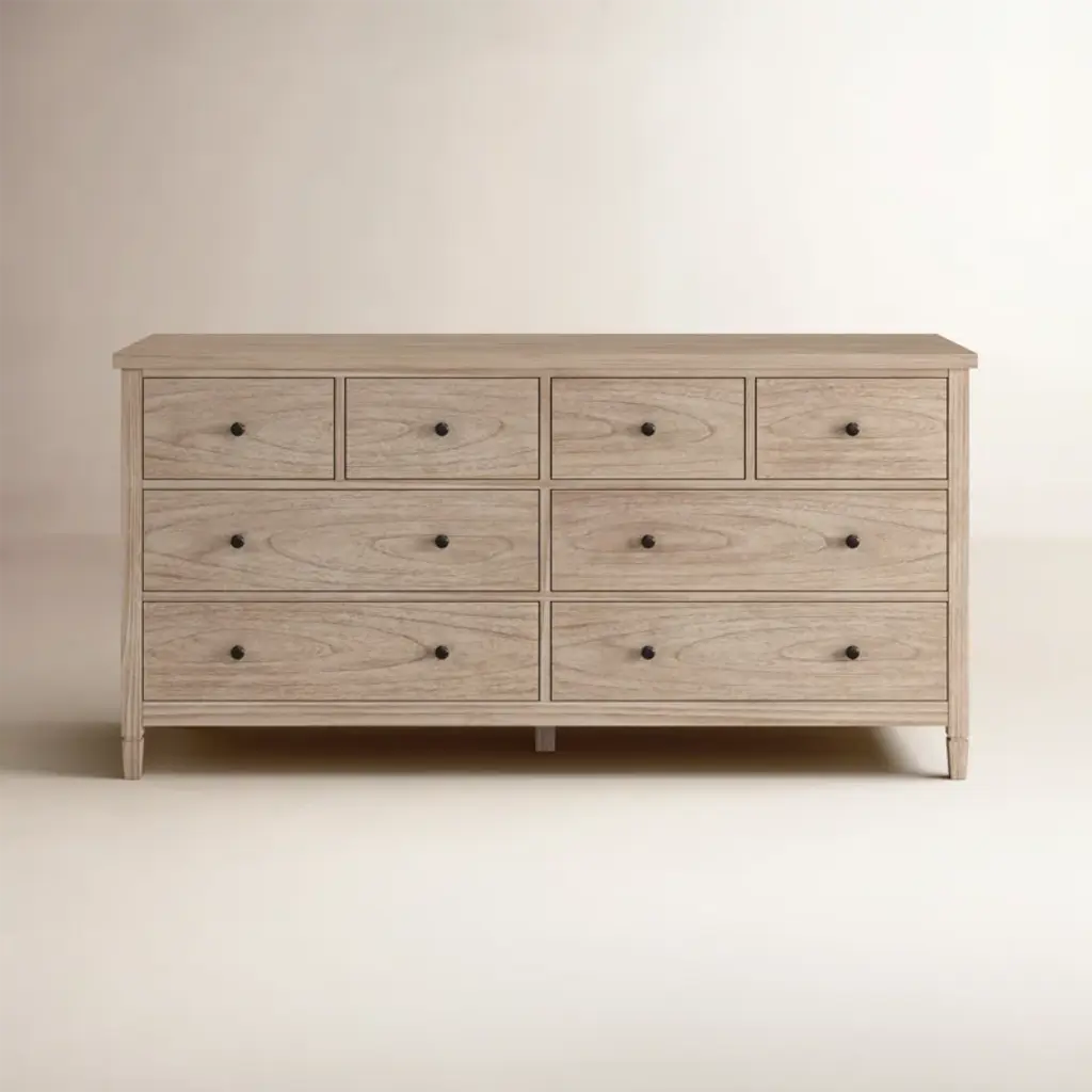 This collection brings a sense of relaxed elegance to your living space. This classic silhouette features straight lines and traditional carved feet for a natural yet sophisticated look. It features 8 spacious drawers for storing anything from linens to clothing, with 4 smaller drawers on the top row and 2 drawers below on each side.