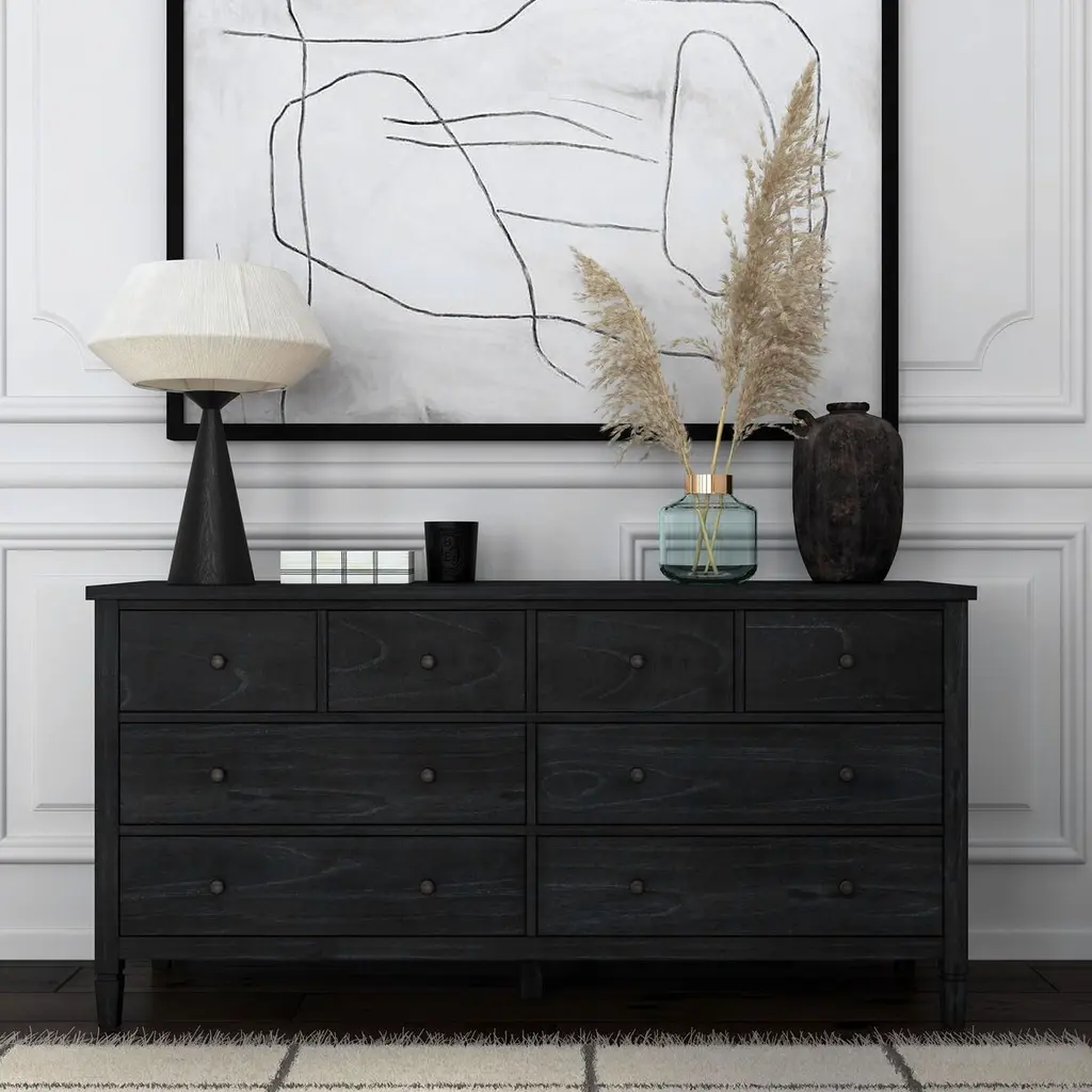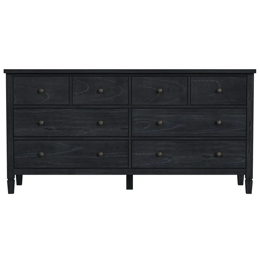 This collection brings a sense of relaxed elegance to your living space. This classic silhouette features straight lines and traditional carved feet for a natural yet sophisticated look. It features 8 spacious drawers for storing anything from linens to clothing, with 4 smaller drawers on the top row and 2 drawers below on each side.