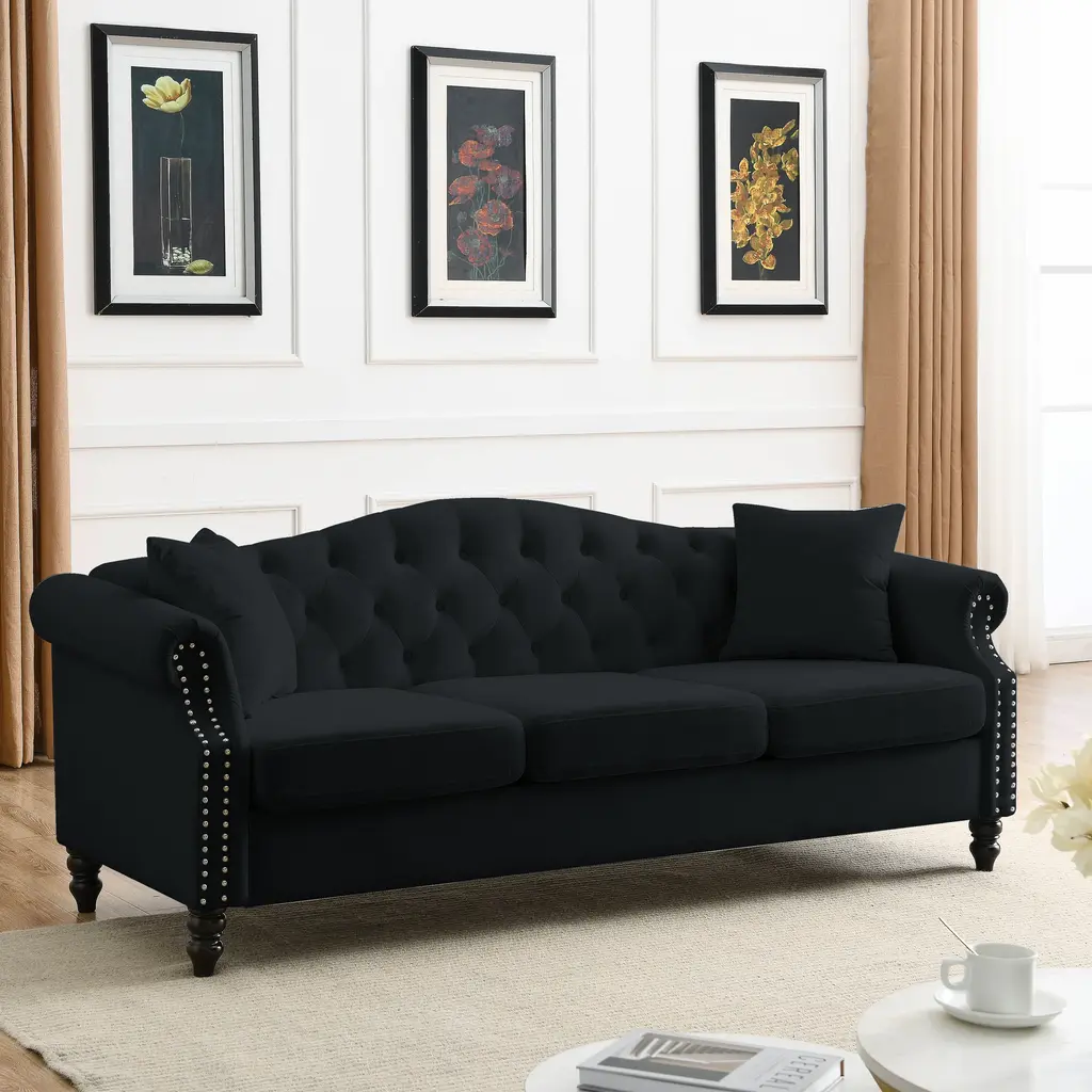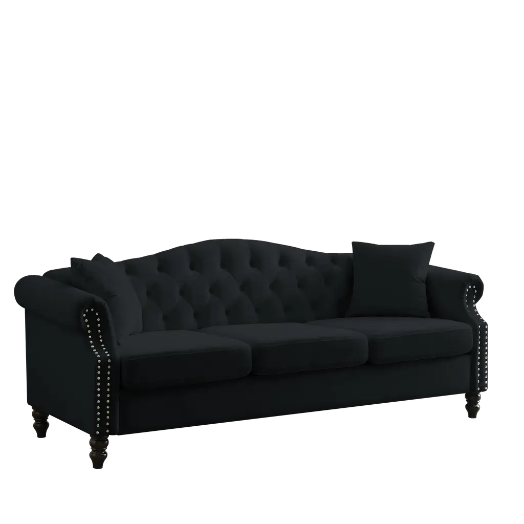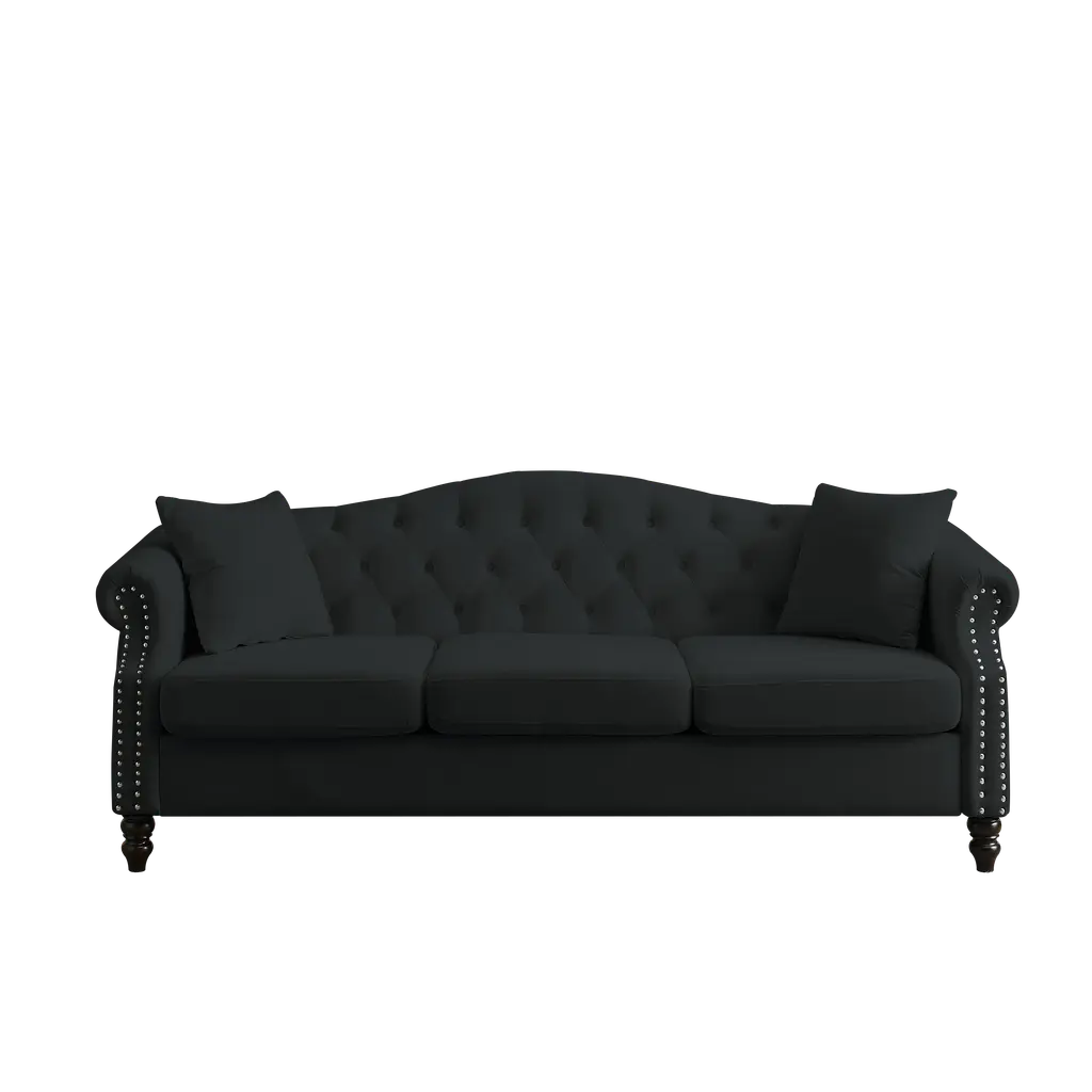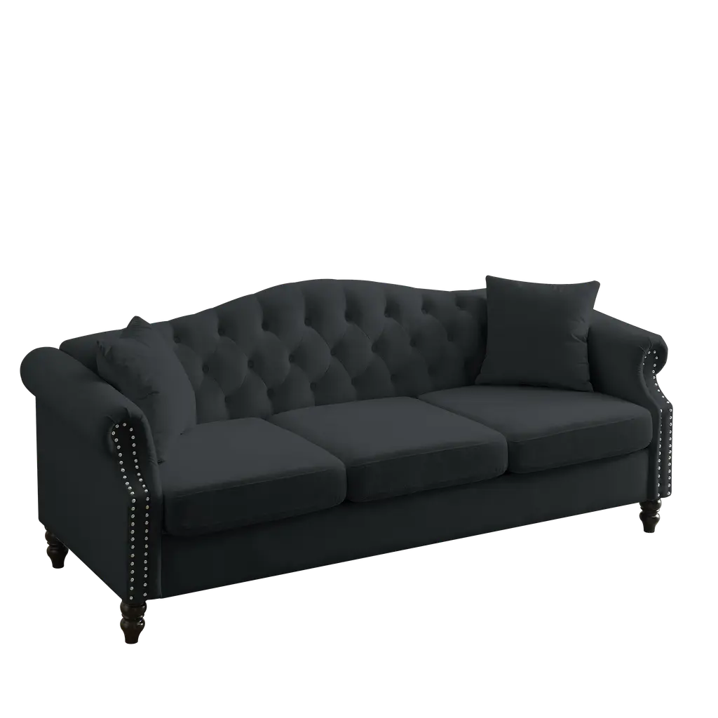 This three-position sofa is not only comfortable to sit, beautiful appearance, looking simple and generous, and fashionable temperament.; The classic Chesterfield sofa. Featuring the classic Chesterfield sofa design, it is classic and sophisticated. Perfect with any decorative theme, this sofa is the perfect choice for your living room, bedroom or office.; Nailhead trim. This 3 seater sofa doesn't skimp on decorative details. Expertly designed, this piece has a tasteful nailhead trim and adjoins the armrests. Each nailhead is applied individually and has a beautiful handcrafted touch, creating a rich and luxurious visual effect.; Sturdy and durable. The frame of the sofa is made of solid wood for added sturdiness and durability. With comfortable foam, soft cushions supported by a curved spring structure and tufted buttons on the back and arms, this sofa is perfect for those who want to rest after a busy day.