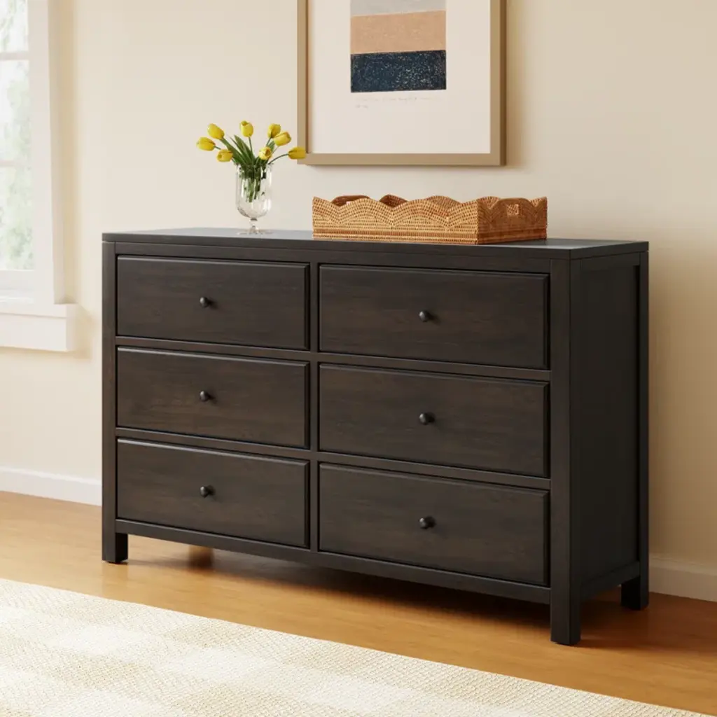 When you care about your bedroom's aesthetic, you should never have to sacrifice style for storage. And with this Solid Wood Dresser, you'll never have to. Modern and stylish, this bedroom dresser features six dovetail-construction drawers built with an easy-glide functionality for quick and easy use, each complete with an aged brass knob. Contemporary yet timeless, it offers sturdy construction and is made from solid mahogany wood in a mocha finish, and provides a wide top surface to display mirrors, lighting, photos, and more. No assembly required.