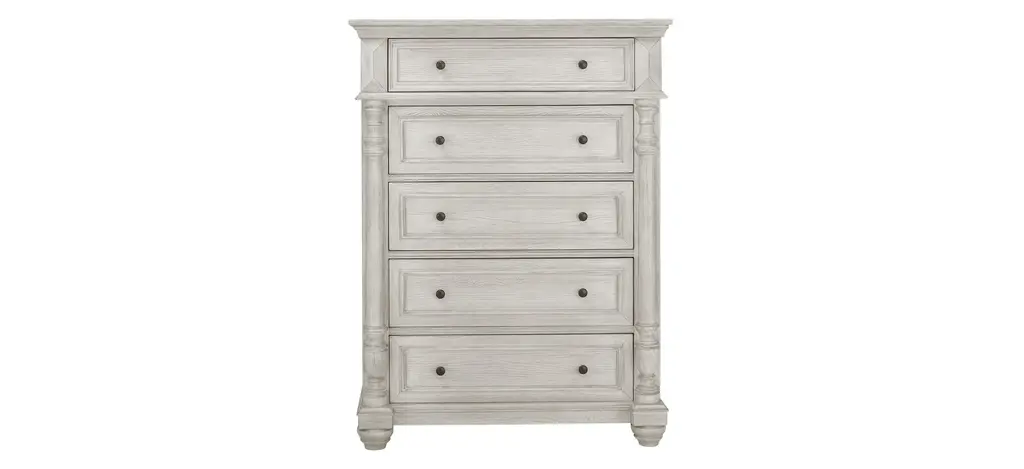The Nashview 5-Drawer Chest brings a rustic charm to your bedroom with its 2-tone finish in antique white and brown. Crafted from premium melamine board, wood, and engineered wood, this chest of drawers offers both durability and style. The five spacious drawers, equipped with metal on metal center glides, ensure smooth operation and ample storage space. You will love having this chest of drawers in your bedroom.