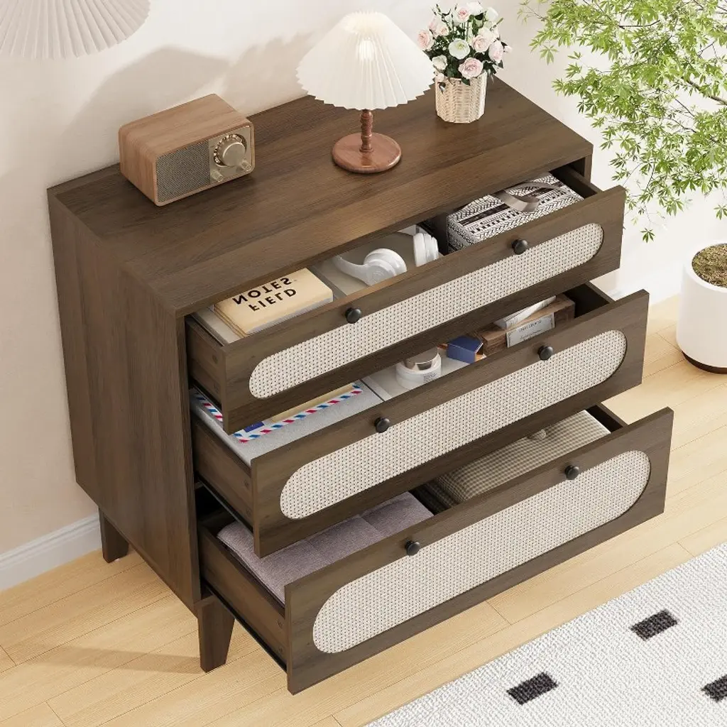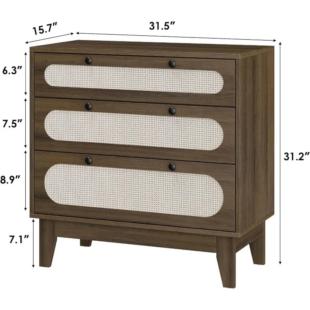 Rattan 3 Drawer Wood Dresser Nightstand Bedside Table for Bedroom, Living Room, Entryway