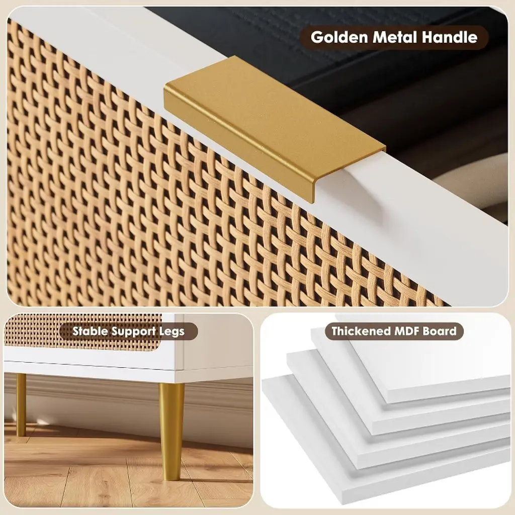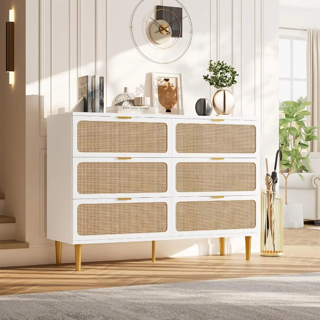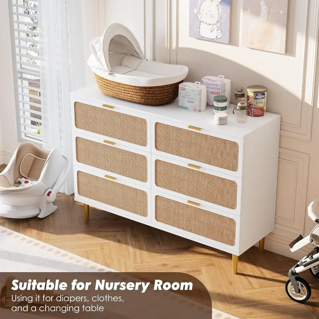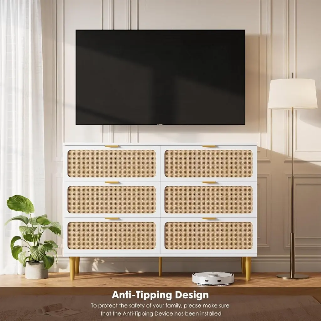Nasitip 6 Rattan Drawer Dresser, 47.2''w Large Double Dresser With Deep Drawers, Chest Of Drawers For Closet With Wide Top,white