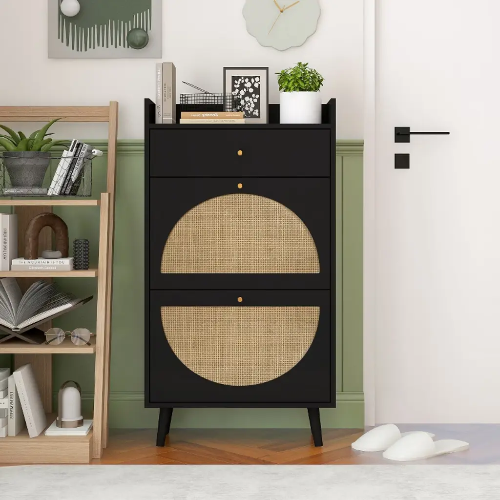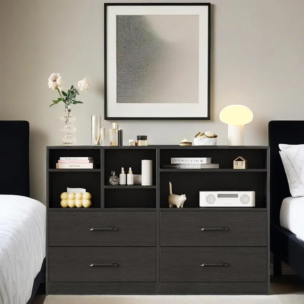 Nasitip Wood Dresser With Adjustable Shelves, Modern Chests Of 4 Drawers With Open Storage, Black