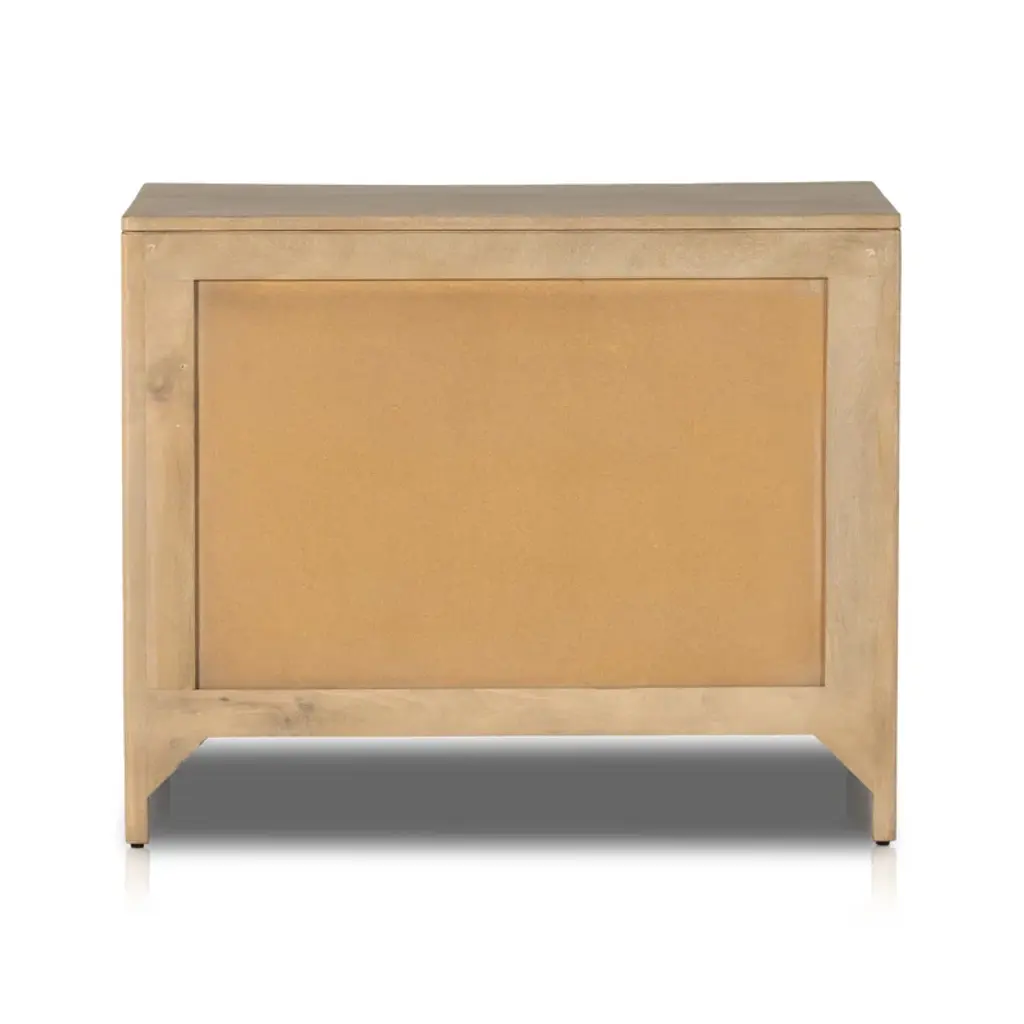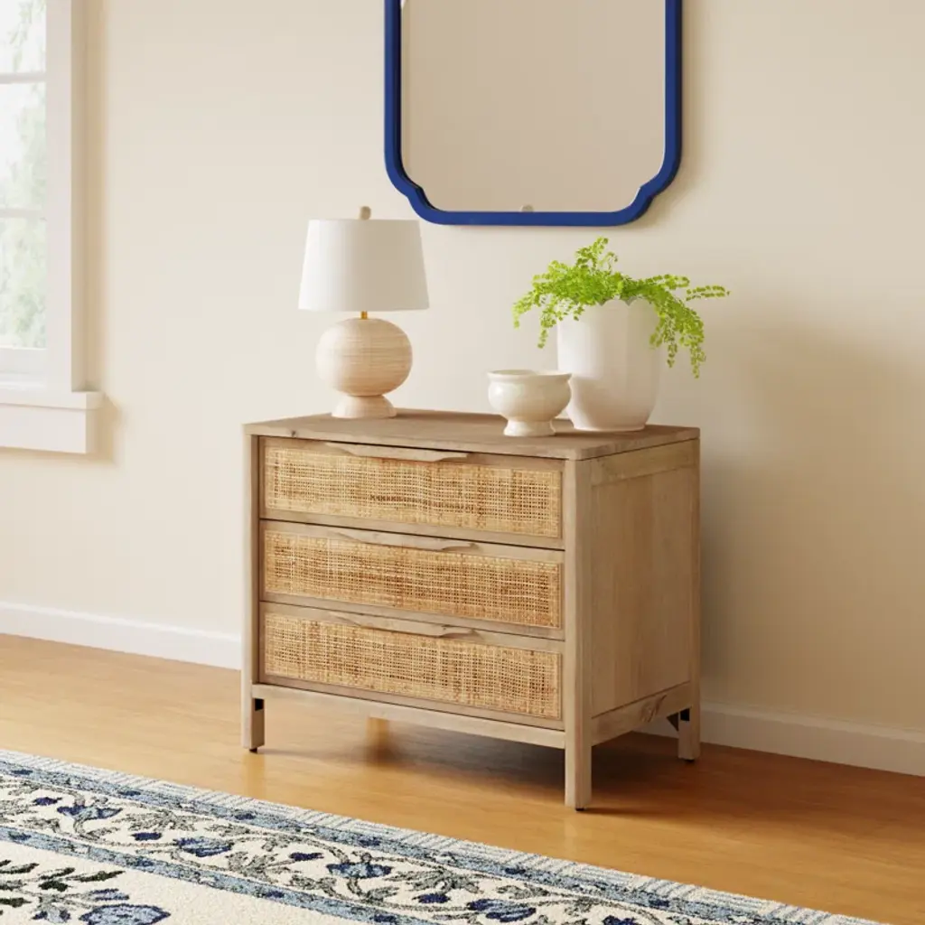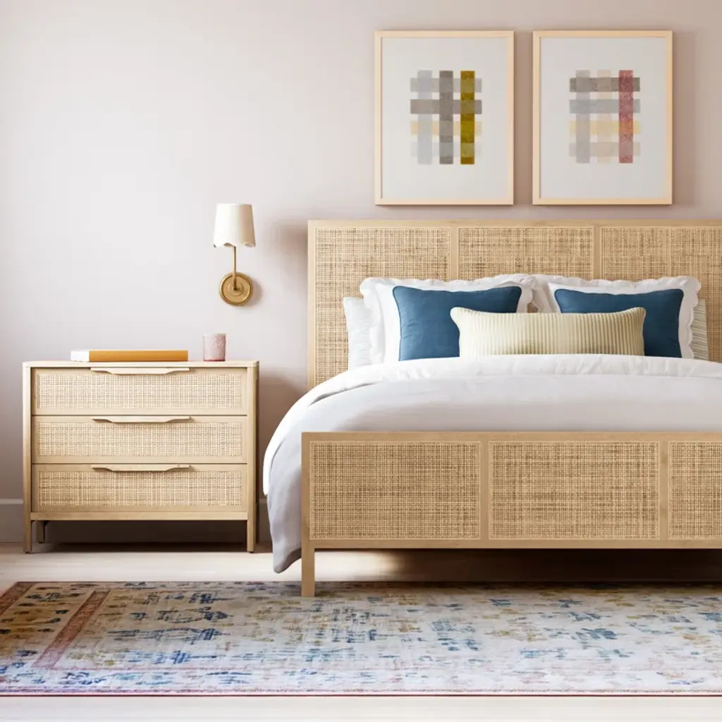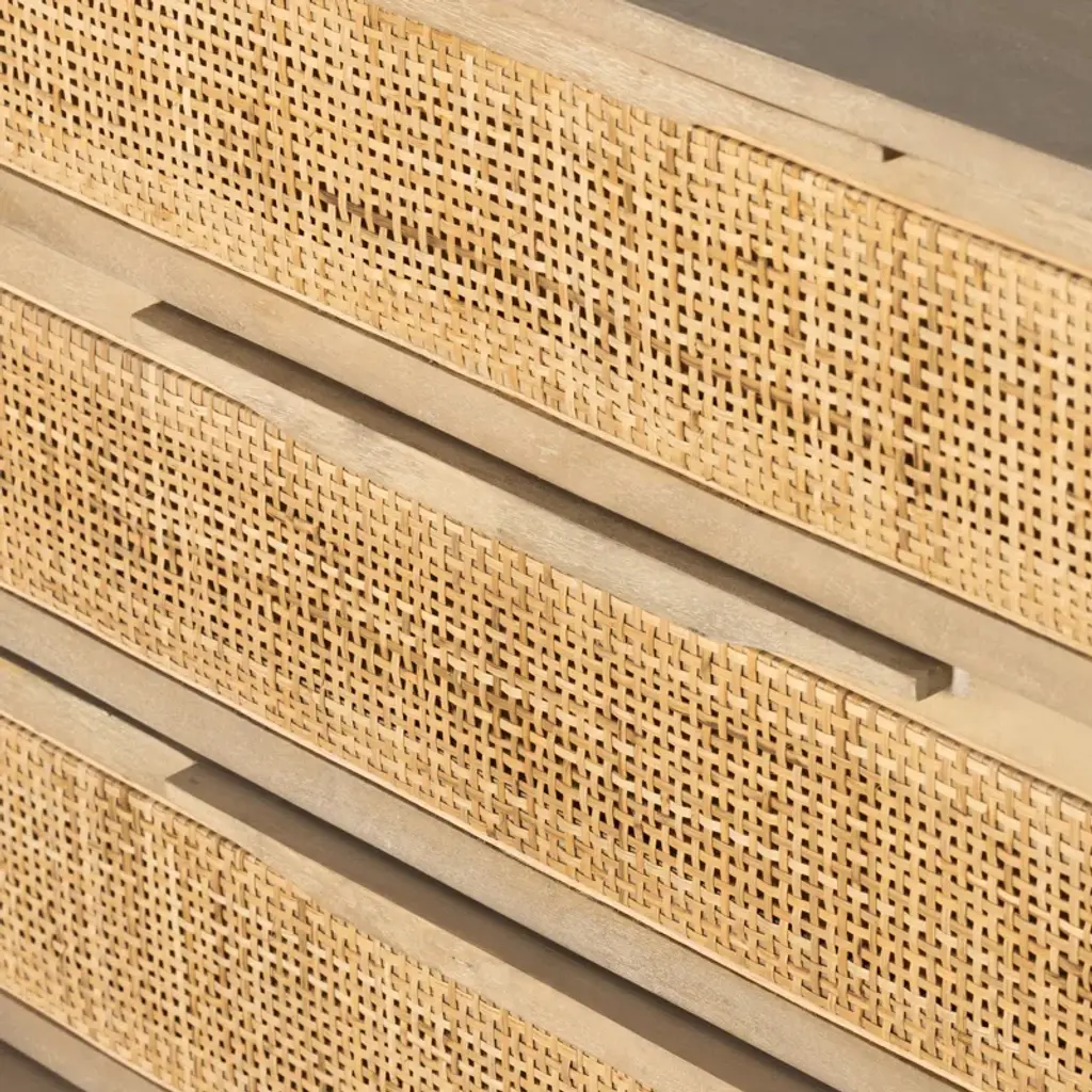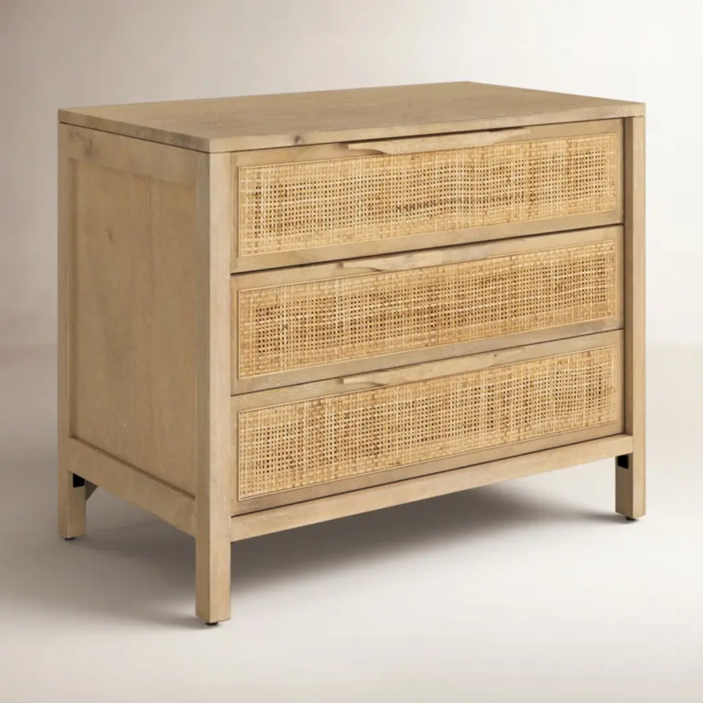 Solid, black-finished mango encases inset woven natural cane, for a textural take on bedside storage.