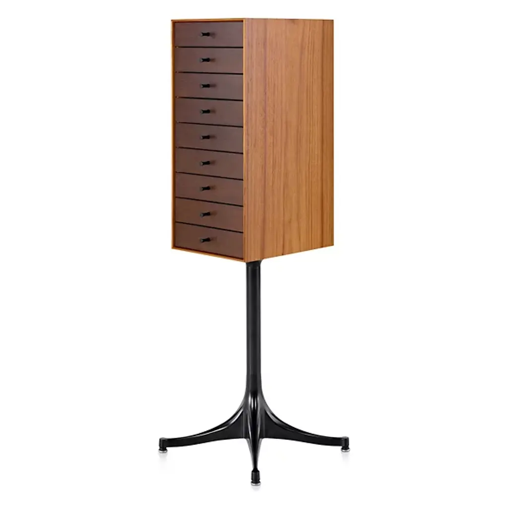 A blend of function and beauty. The Nelson 9-Drawer Miniature Chest with Base from Herman Miller offers a wonderful place to store your items. This solid wood construction has hand-fitted drawers with brass glides that provide smooth, easy operation, all made with the high-quality craftsmanship for which George Nelson is known. It comes with a small jewelry drawer and dividers to help you keep your smallest items organized. You can use this product with or without the pedestal to suit your needs. Ever since his first trip to Tokyo in 1951, designer George Nelson has been fascinated with Japanese design. He created this product, incorporating what he loved most about the country’s aesthetic, saying he wanted “a sense of fitness in the relationship between hand, material, and shape.”