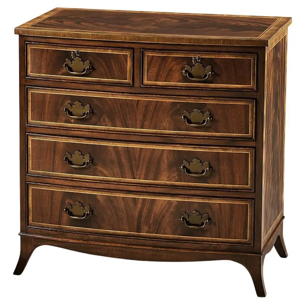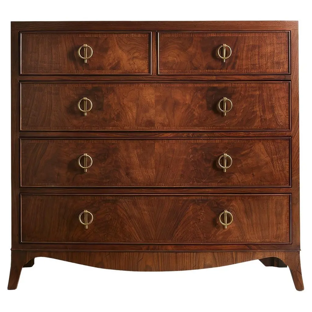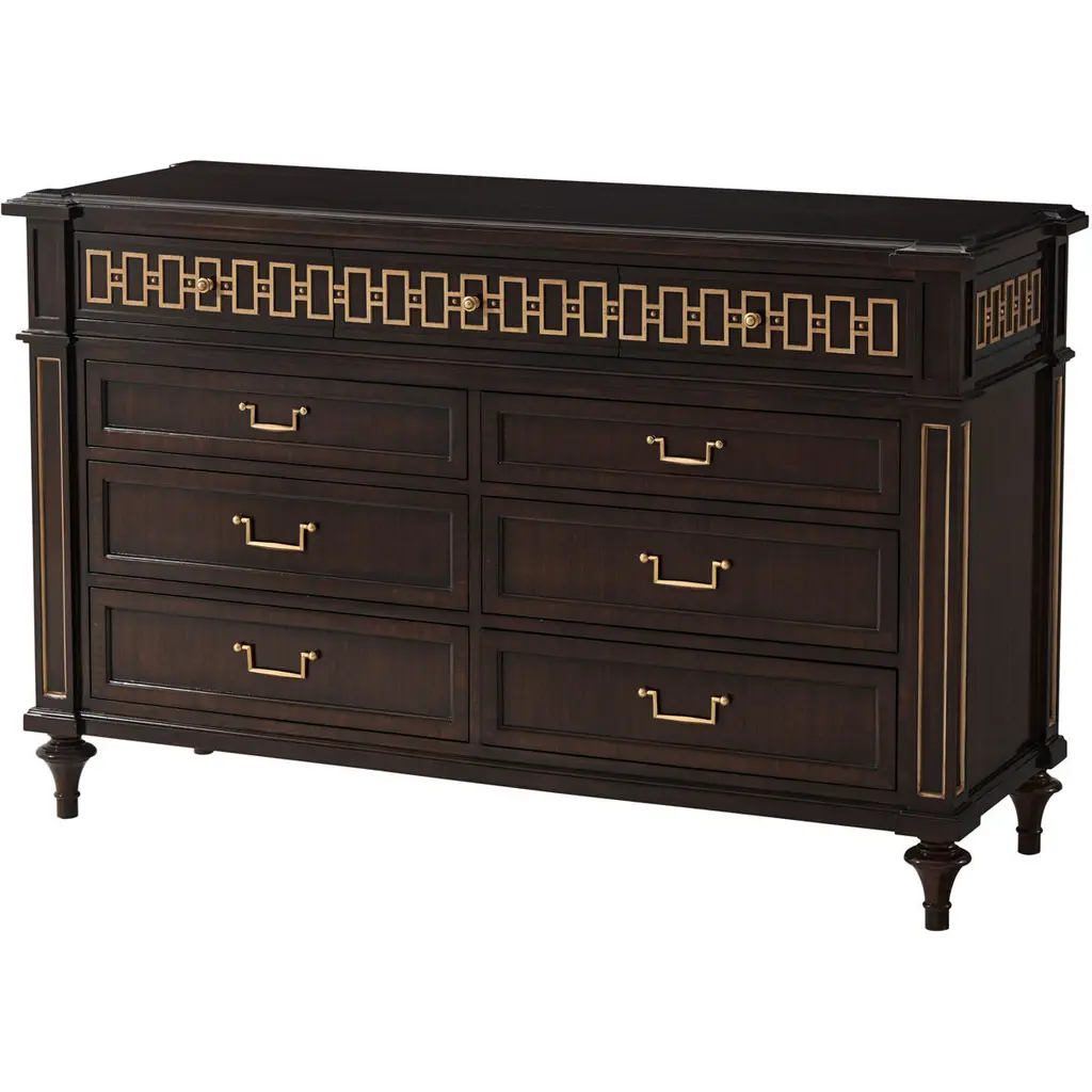 The dresser showcases exquisite craftsmanship and attention to detail. Drawing inspiration from classical aesthetics, this chest exudes sophistication with its classic silhouette and refined proportions.The dresser is constructed with mahogany and exotic woods. Elevating its allure, the dresser also features brass inlay details throughout, adding a visual impact to captivate the eye. Hand-cast brass hardware, bracket feet, and escutcheon details are antiqued to perfection adding the perfect ornamental features to round out this classic inspired design.Dimensions: 66" W x 20" D x 36" H