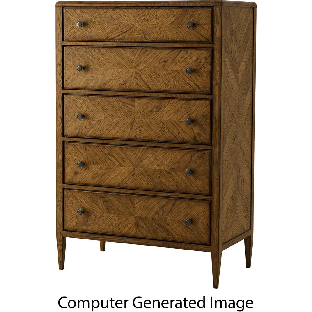A neo cassic style oak parquetry tall chest of drawers with mirrored herringbone oak parquetry including five deep drawers accented with Verde Bronze finished handles on tapered oak legs in our Dwan finish.Dimensions: 36" W x 20" D x 55.25" H.