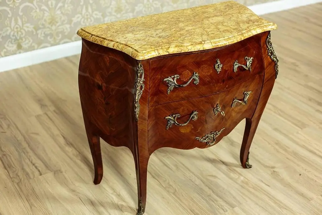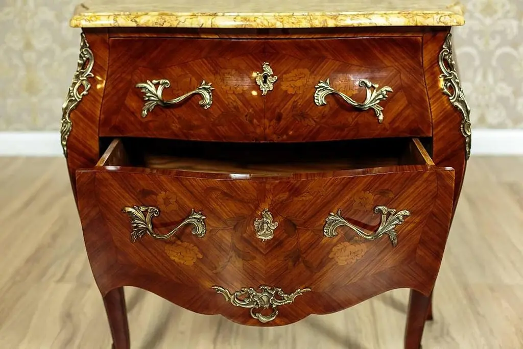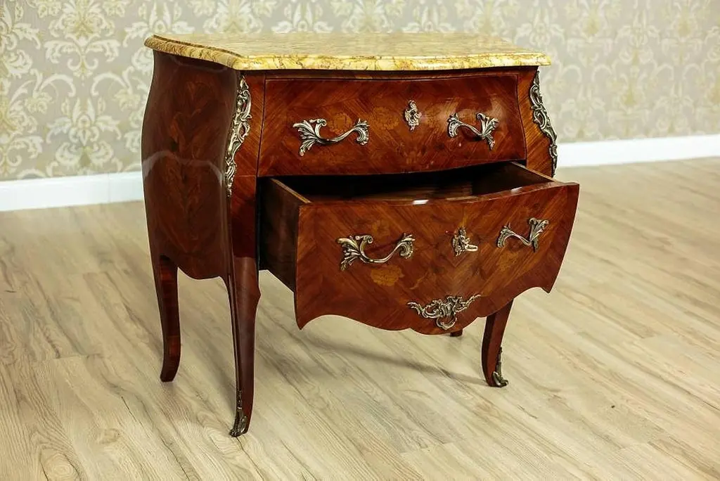 Neo-Rococo Inlaid Dresser Veneered with Mahogany, circa 1930A dresser, circa 1930, resembles furniture in the Louis XV style.This piece of furniture in the French type has a bulbous shape and a marble top, which is ornated with marqueteries and intarsias.The handles of the drawers and the appliqués layered on the legs are made of brass.Presented dress has undergone professional renovation. It is covered in French polish in the shade of high gloss orange.There are cracks and traces of gluing visible on the top.