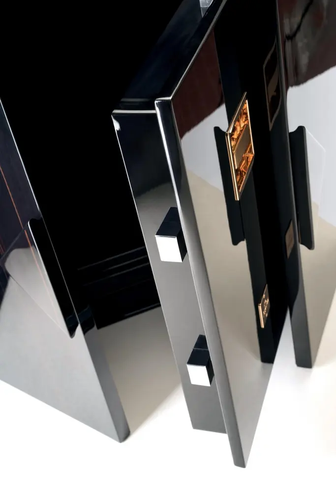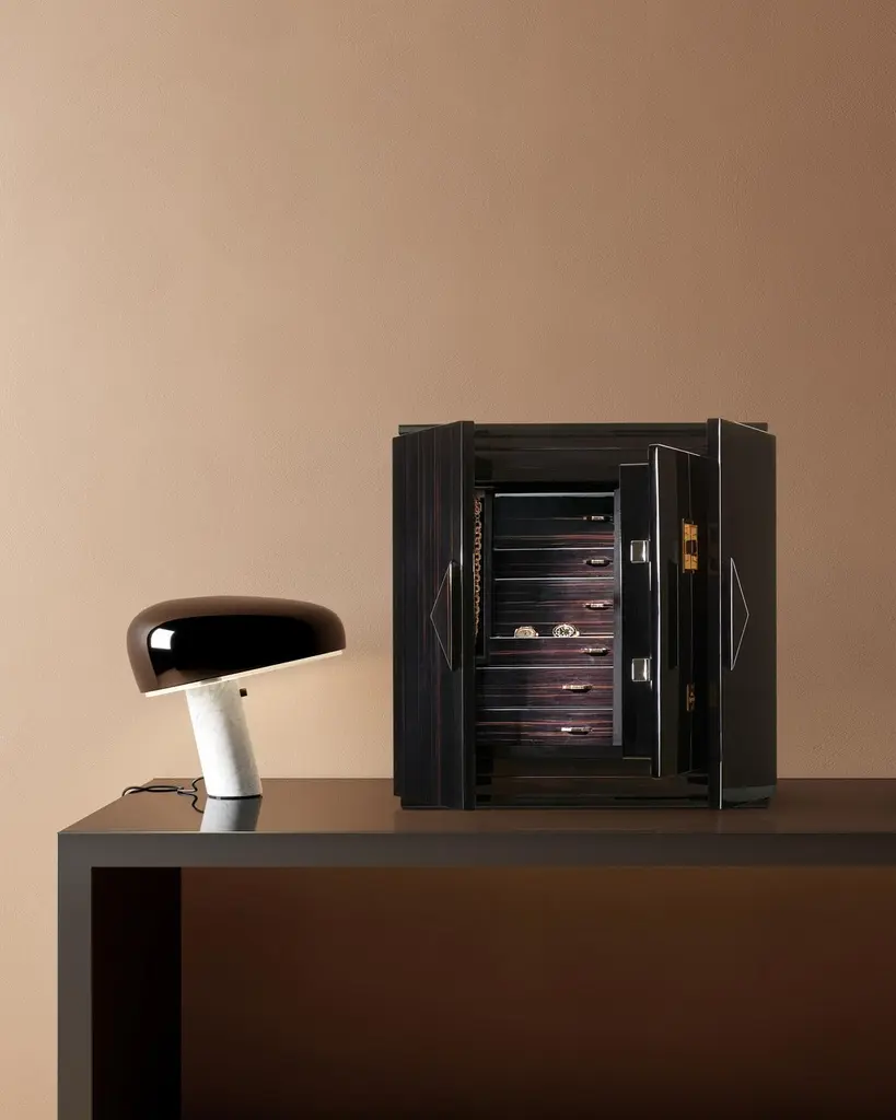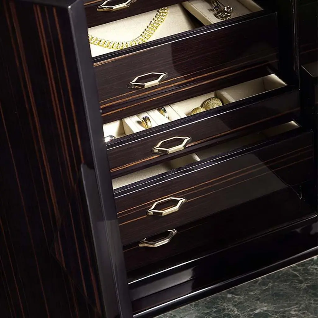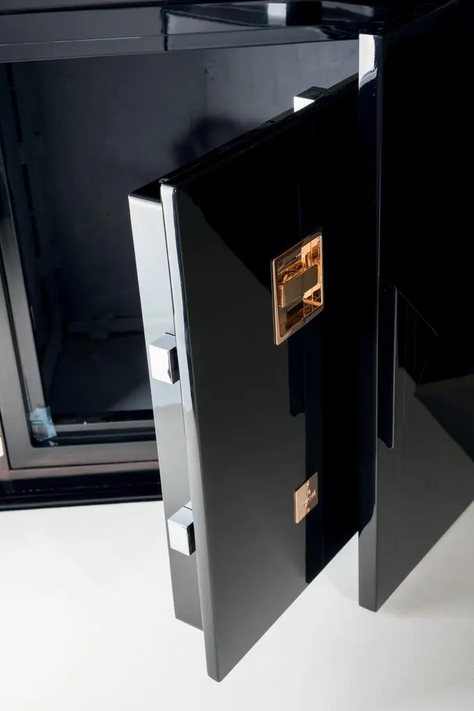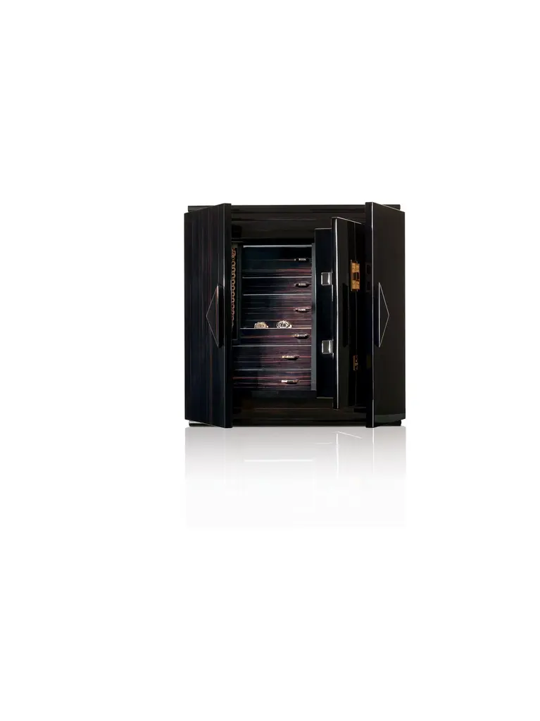 Chest of polished ebony with grade 2 safe. Shiny black steel. Contents 6 drawers lined to store all sorts of jewels and necklace bar. Brass-plated 24-karat gold accessories. Unique features of this certified product: - High level steel with several layers of chrome carbides for straightening. - Internal hinges - Anti tear profile on door sides - In compliance with grade 3.