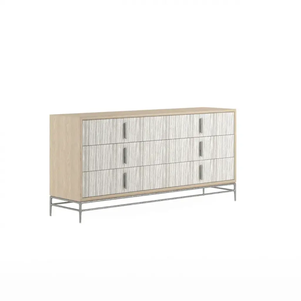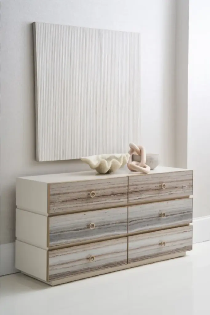 A compelling mix of texture and material, the Bedrock Dresser brings an organic elegance to bedroom interiors. Crafted from polished gray sandstone with intricate banding and natural color variations, drawer fronts are minimally adorned with metal trim and small ring pulls in Champagne Gold. Balanced on a wood plinth base, its top and sides are finished in a softly contrasting, creamy Almond Milk paint.