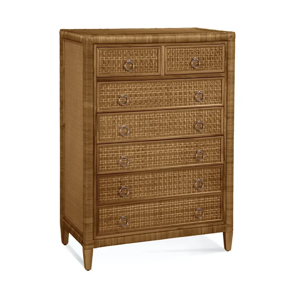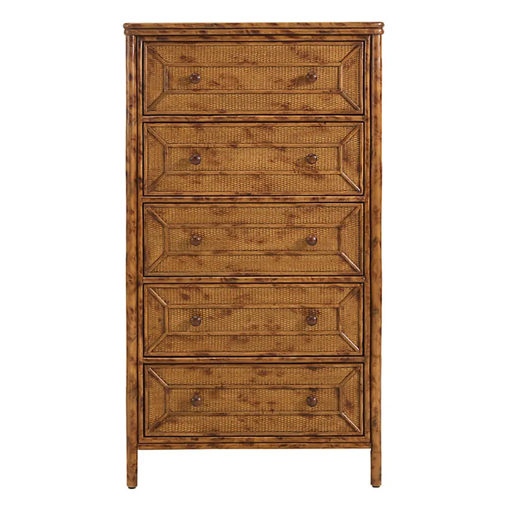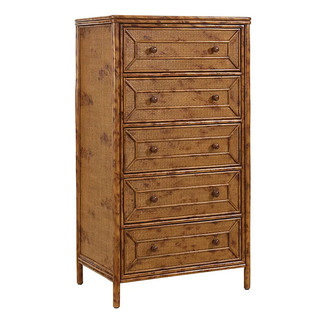 Our Newberry bedroom furniture recalls the romantic British colonial style popular throughout the world from the 16th to 18th centuries. The genteel look was relaxed and well-traveled with furniture silhouettes rendered in stained rattan, tropical timbers, and bamboo. The Newberry 5-Drawer Tall Dresser is handmade of sturdy natural rattan with rounded corner wood top, and hand finished to capture the rich tortoise shell patina that once defined colonial furniture from exotic, faraway places like Africa, India, and the West Indies. The tall, space-saving design tucks nicely between windows and doors. Five drawers feature striking fretwork details and offer a generous bedroom storage for folded clothes or extra linens. Drawer fronts and sides of chest are covered in tightly woven rattan peel for added texture and dimension. Drawers open with classic, turned wood knob pulls.Newberry 5-Dawer Tall Dresser features: