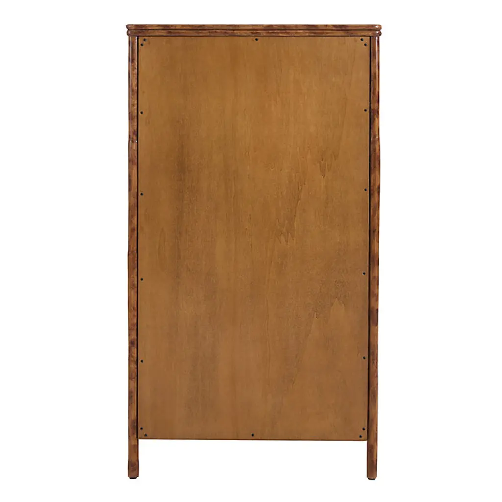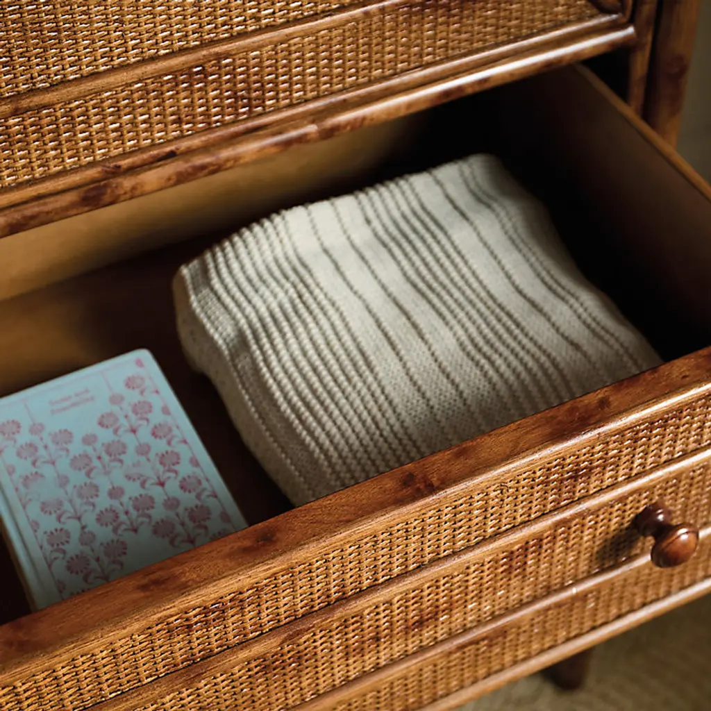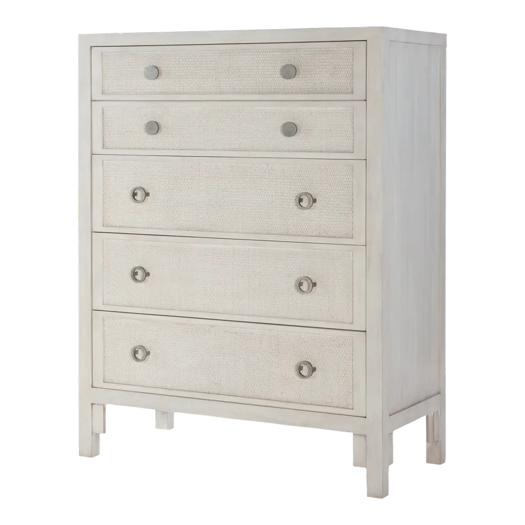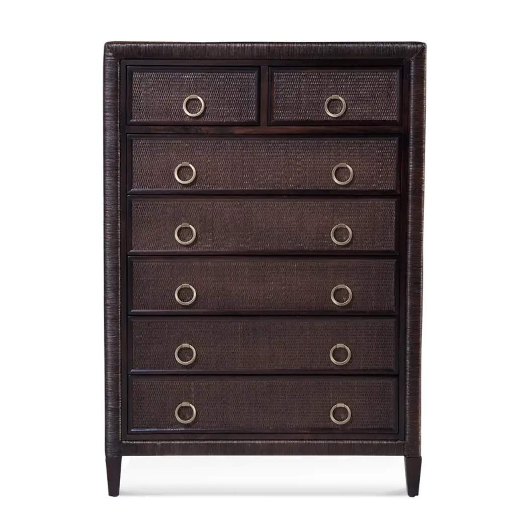 Our Newberry bedroom furniture recalls the romantic British colonial style popular throughout the world from the 16th to 18th centuries. The genteel look was relaxed and well-traveled with furniture silhouettes rendered in stained rattan, tropical timbers, and bamboo. The Newberry 5-Drawer Tall Dresser is handmade of sturdy natural rattan with rounded corner wood top, and hand finished to capture the rich tortoise shell patina that once defined colonial furniture from exotic, faraway places like Africa, India, and the West Indies. The tall, space-saving design tucks nicely between windows and doors. Five drawers feature striking fretwork details and offer a generous bedroom storage for folded clothes or extra linens. Drawer fronts and sides of chest are covered in tightly woven rattan peel for added texture and dimension. Drawers open with classic, turned wood knob pulls.Newberry 5-Dawer Tall Dresser features:
