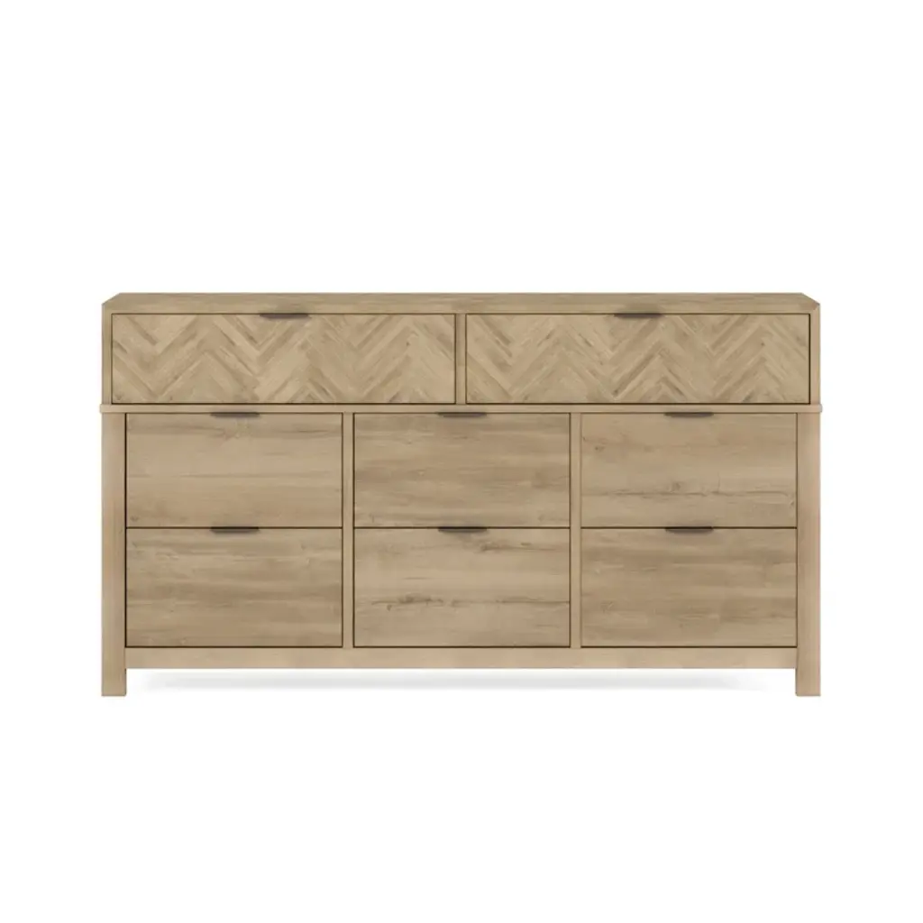 With frame detailing and the gentle curve of its coved front, the Newbury 6 Drawer Dresser brings a smooth sophistication to your bedroom. Like the rest of the Newbury Collection, textured available finishes are crafted into a dynamic combination of straight lines and curves. Accessed by their polished nickel beehive knobs, six symmetrical drawers provide substantial storage. The side panels are framed with a raised border and the dresser stands regally on slightly tapered legs. The Newbury dresser is destined to heighten the style in any bedroom from classic to modern. Offered in textured White Oak or Parchment Gesso finishes.