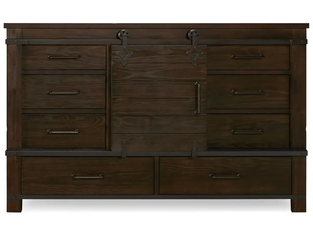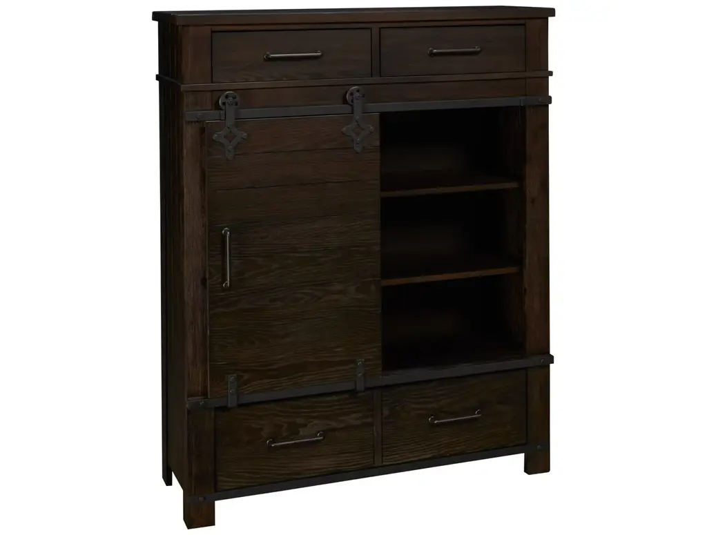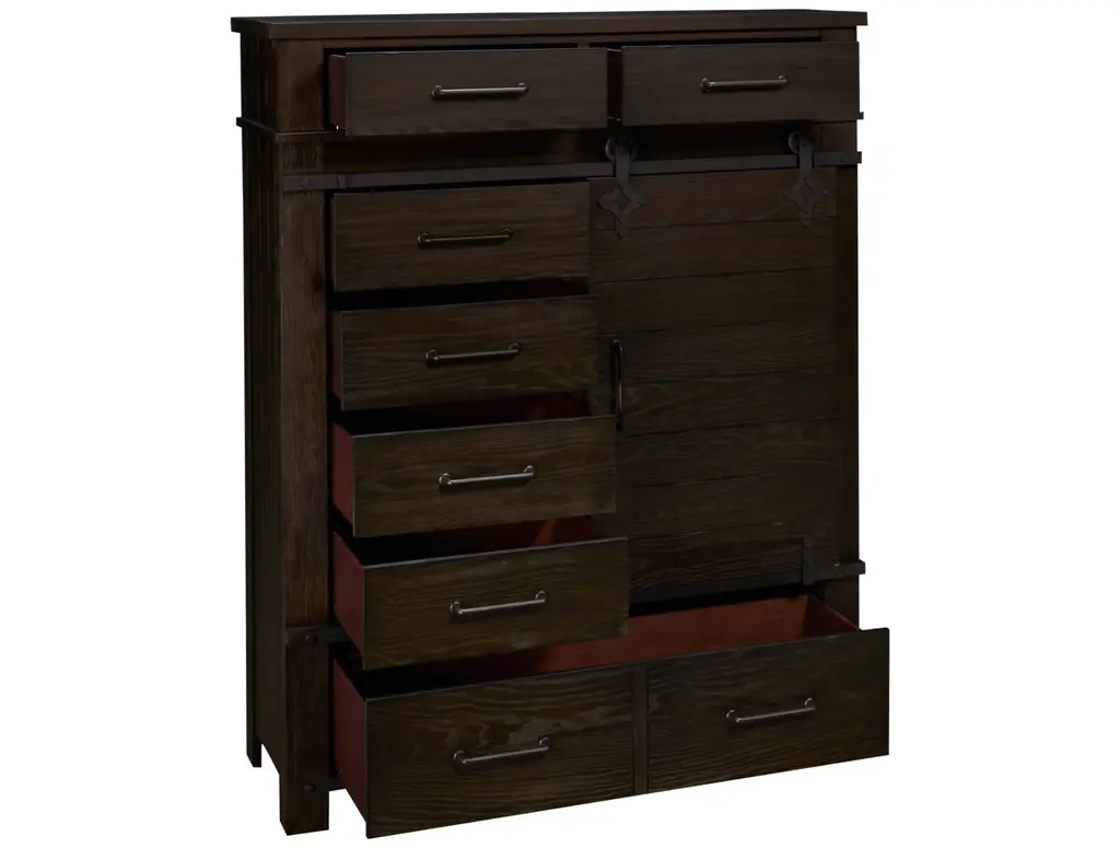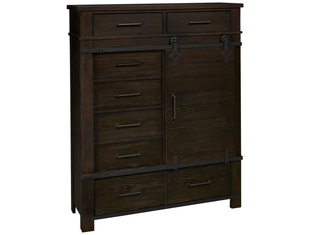 The Newtown Gentleman's Chest from Folio 21 Furniture is the ultimate closet companion. Featuring a sliding door with barn-style hardware that reveals two shelves. This transitional-style furniture has a total of seven drawers with the top two lined in felt to protect delicate items, and a large bottom drawer lined in cedar to keep wardrobe items fresh. The weathered ash finish and welded steel hardware give this bedroom chest a handsome, rustic look.