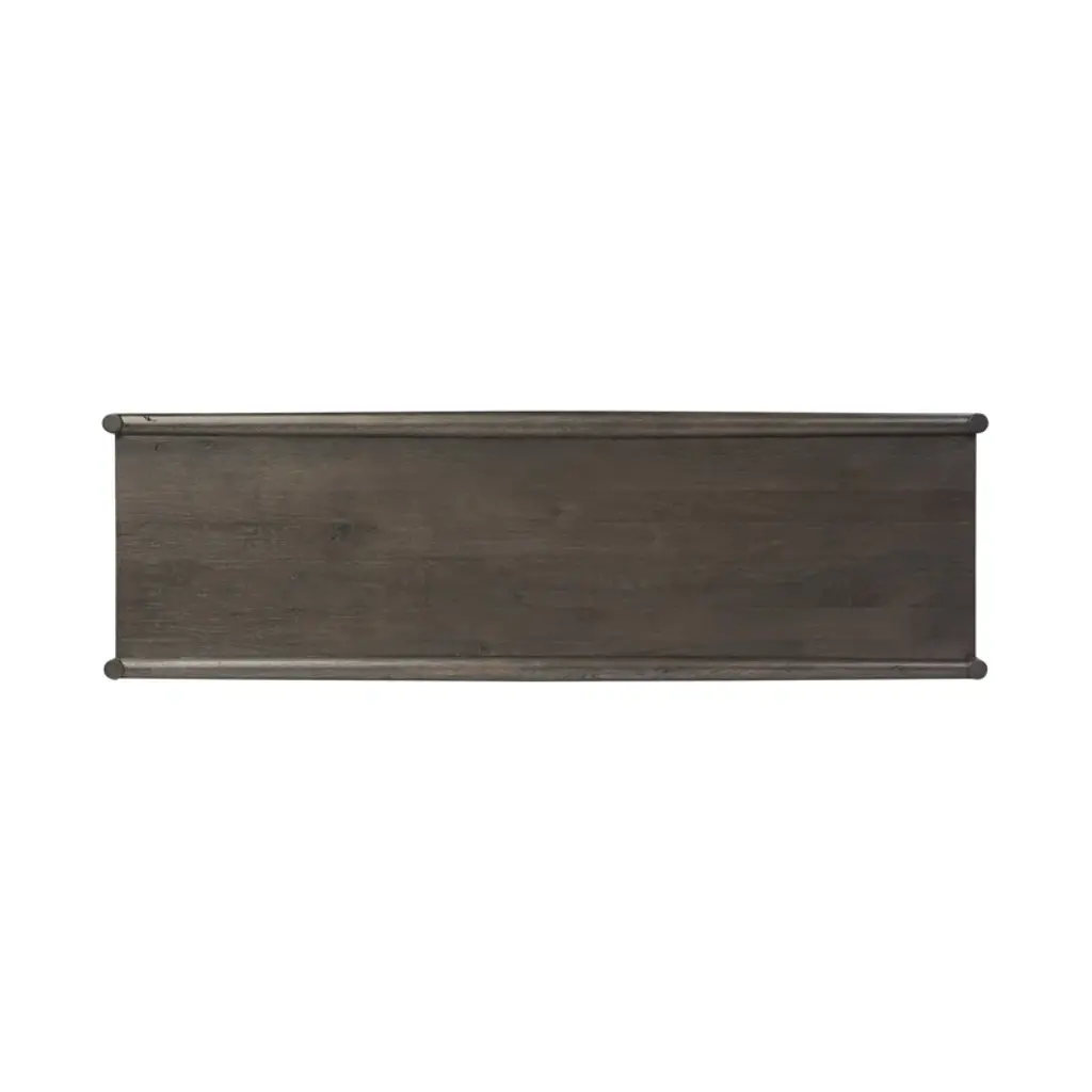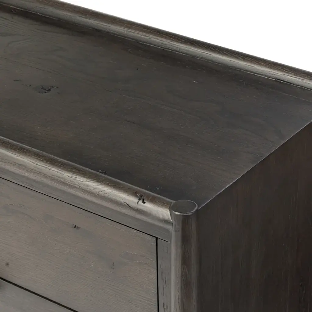 Made from solid acacia and finished in a rustic brown, a six-drawer, the waterfall-shaped dresser features soft volume, mitered corners, and a faux live edge.