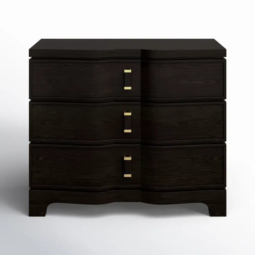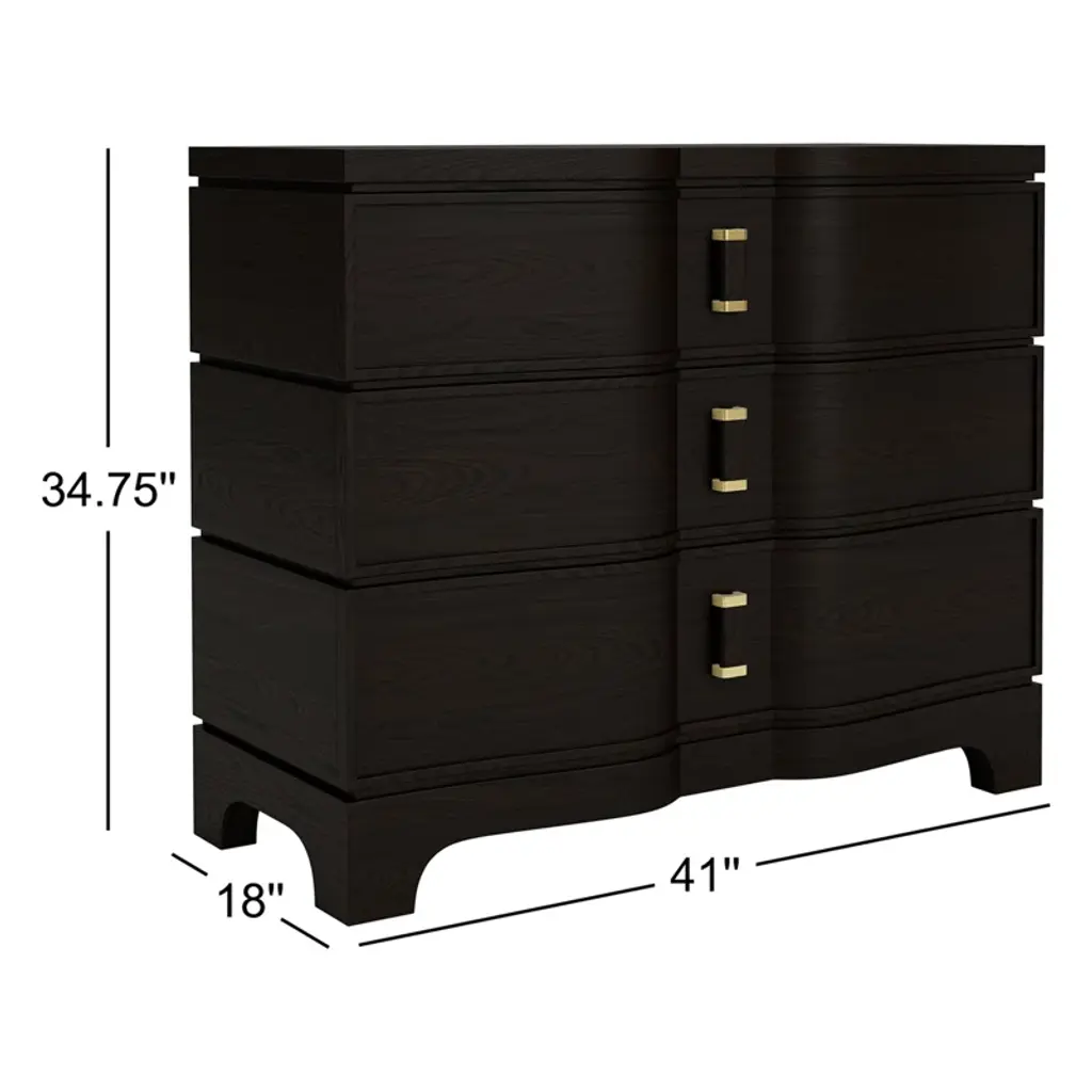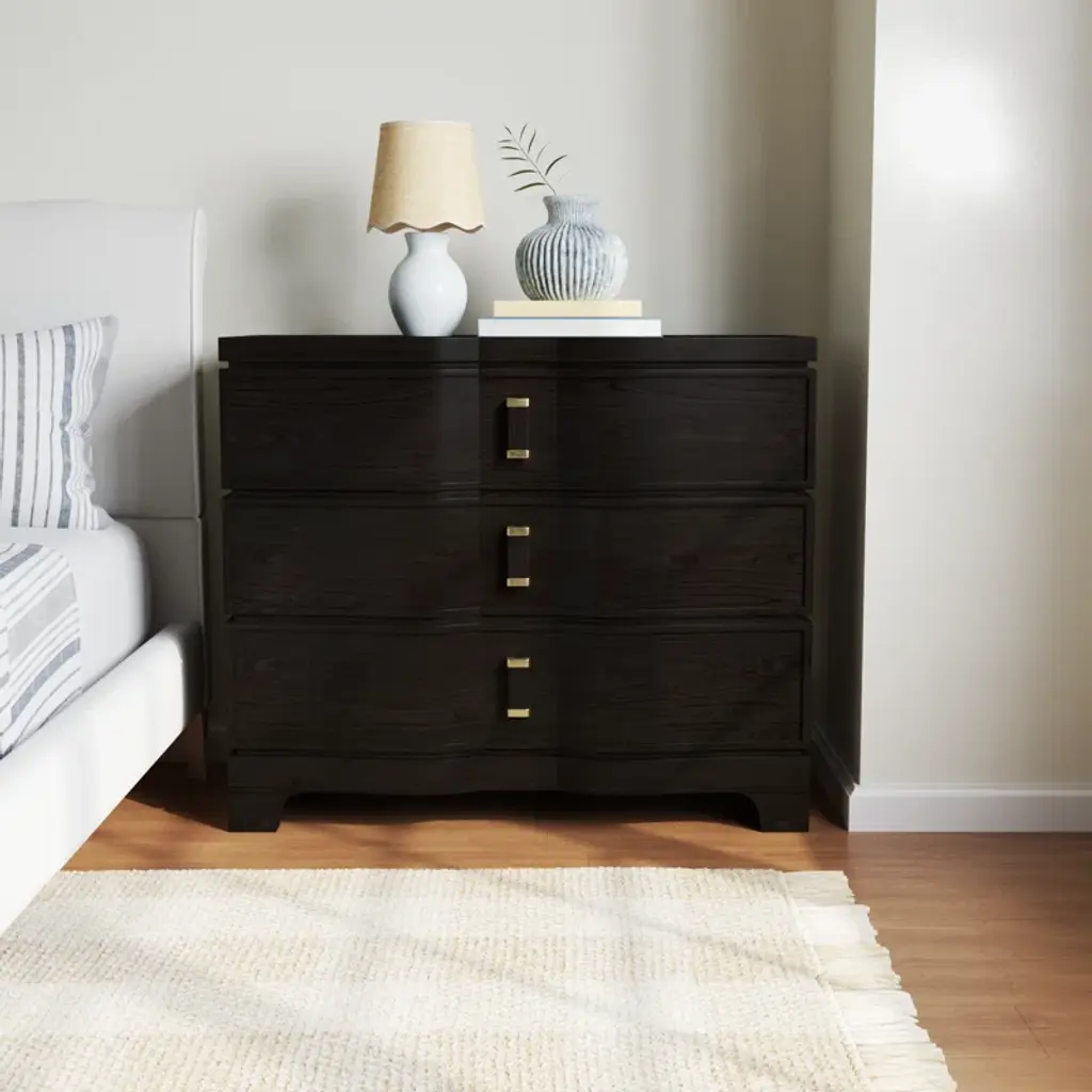 Lydia's sleek lines, complemented by rounded details, achieves a timeless modern contemporary style. The dark cabernet finish, combined with white fabrics, imparts a fresh and relaxed appearance. Linear hardware introduces visual interest, while maintaining an overall minimalistic aesthetic.
