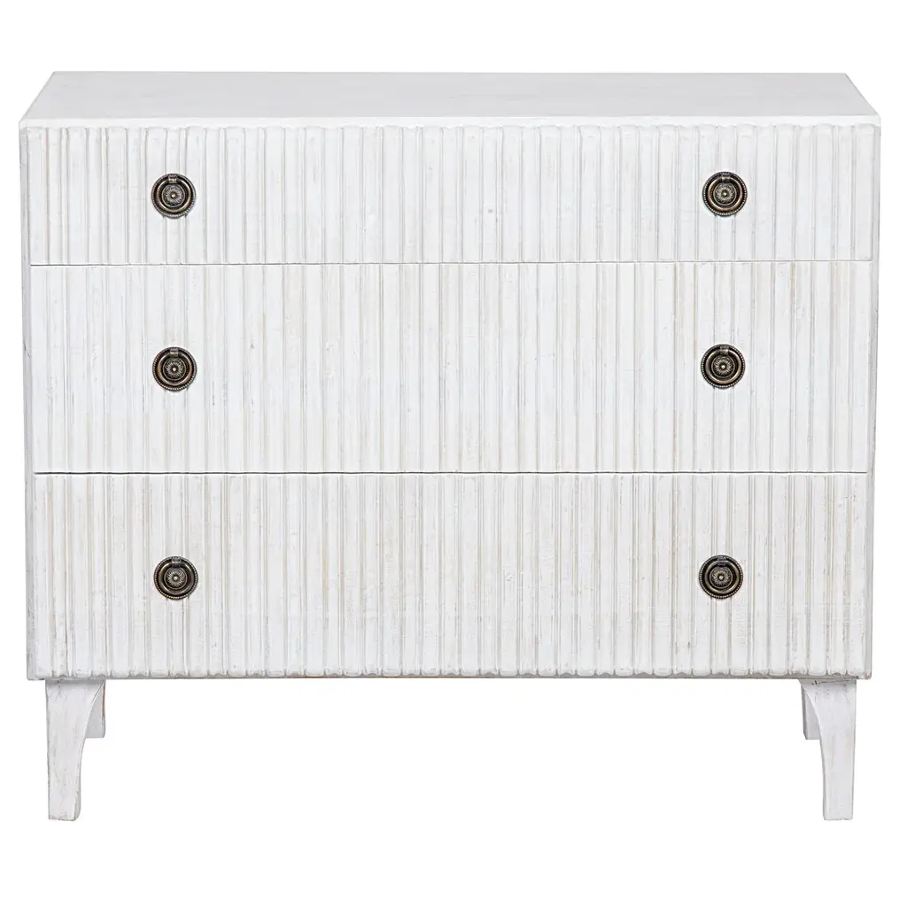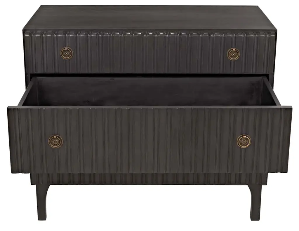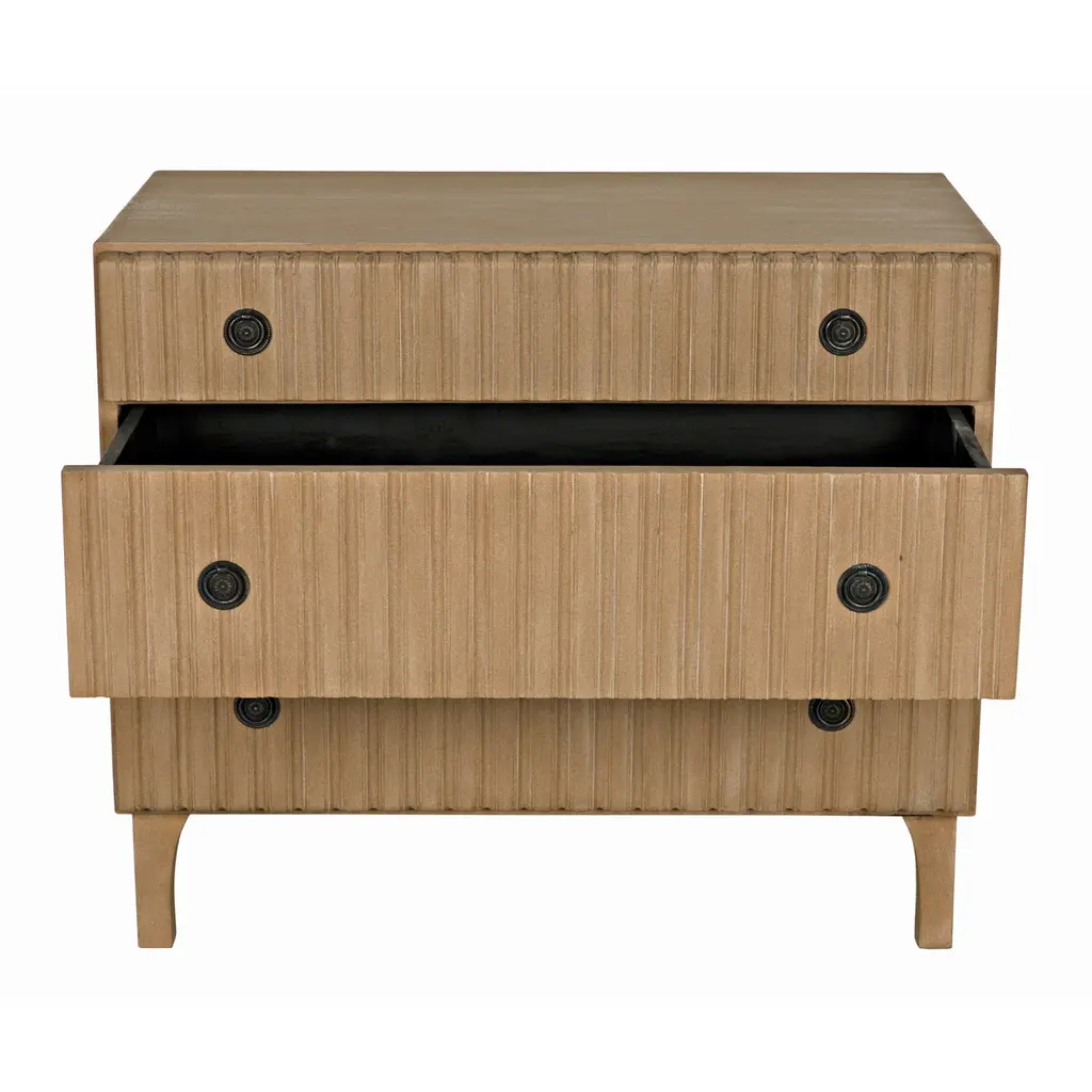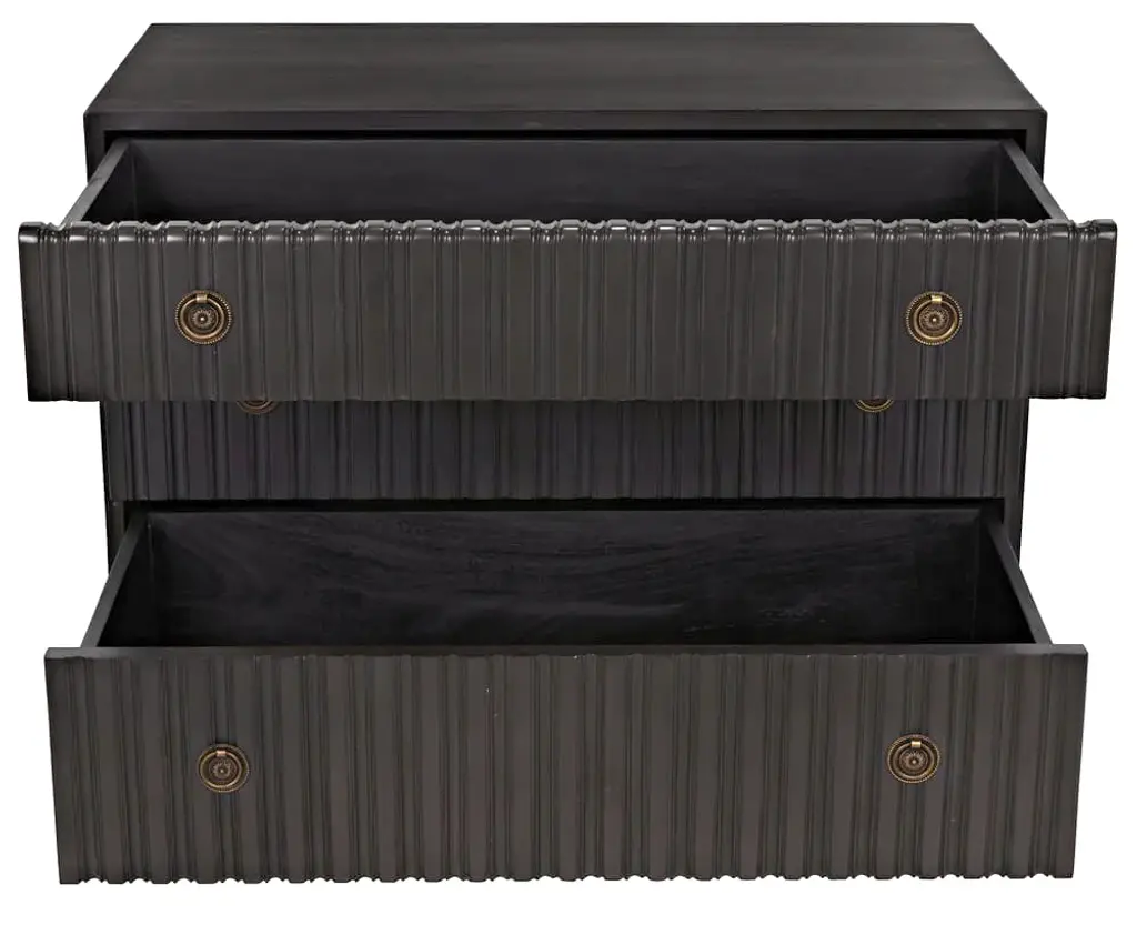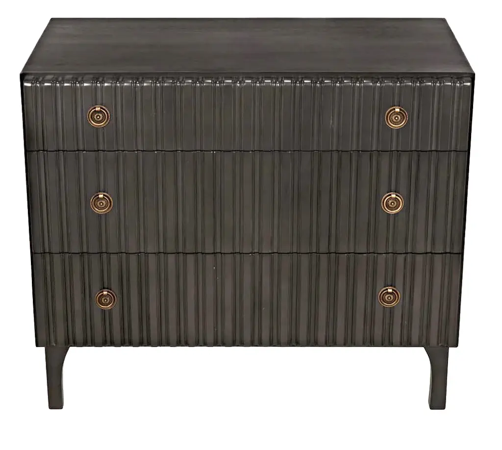 This unique solid mahogany dresser or chest by Noir is distinguished by the textural carving on the faces of its three drawers. The unique ribbed carving adds a rustic, slightly industrial appeal. Coordinating metal pulls add interest.
