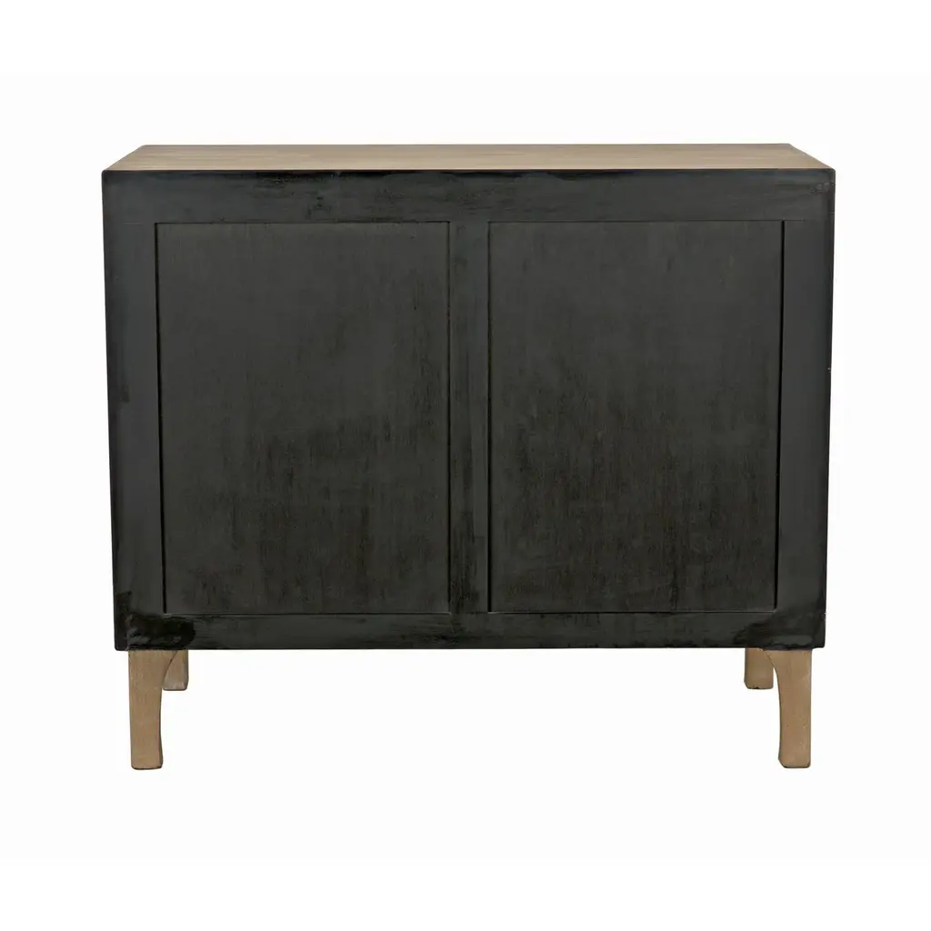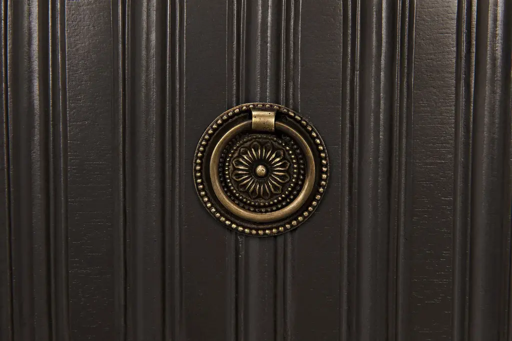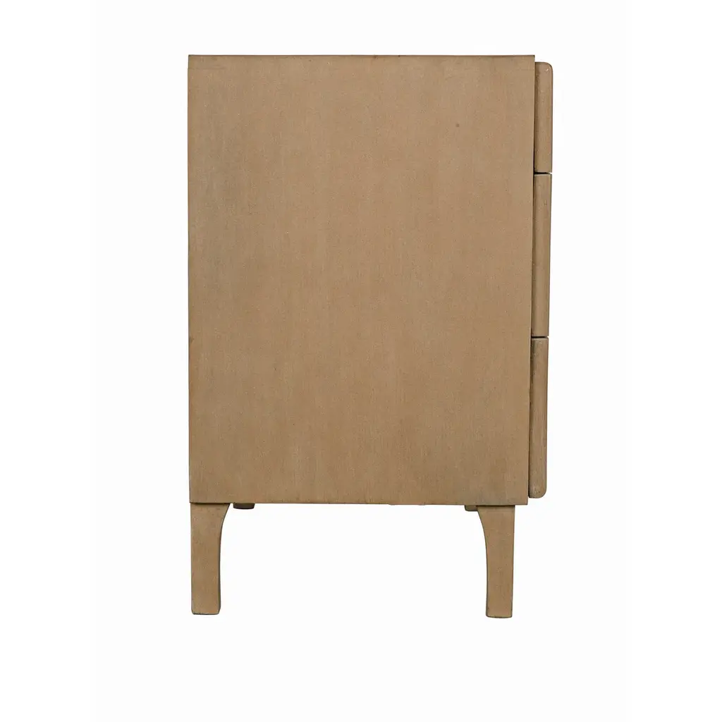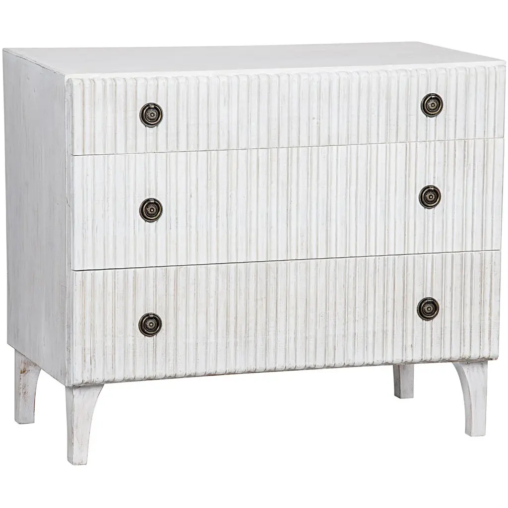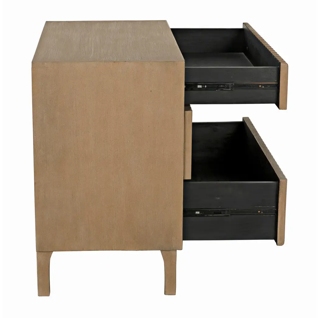 This unique solid mahogany dresser or chest by Noir is distinguished by the textural carving on the faces of its three drawers. The unique ribbed carving adds a rustic, slightly industrial appeal. Coordinating metal pulls add interest.